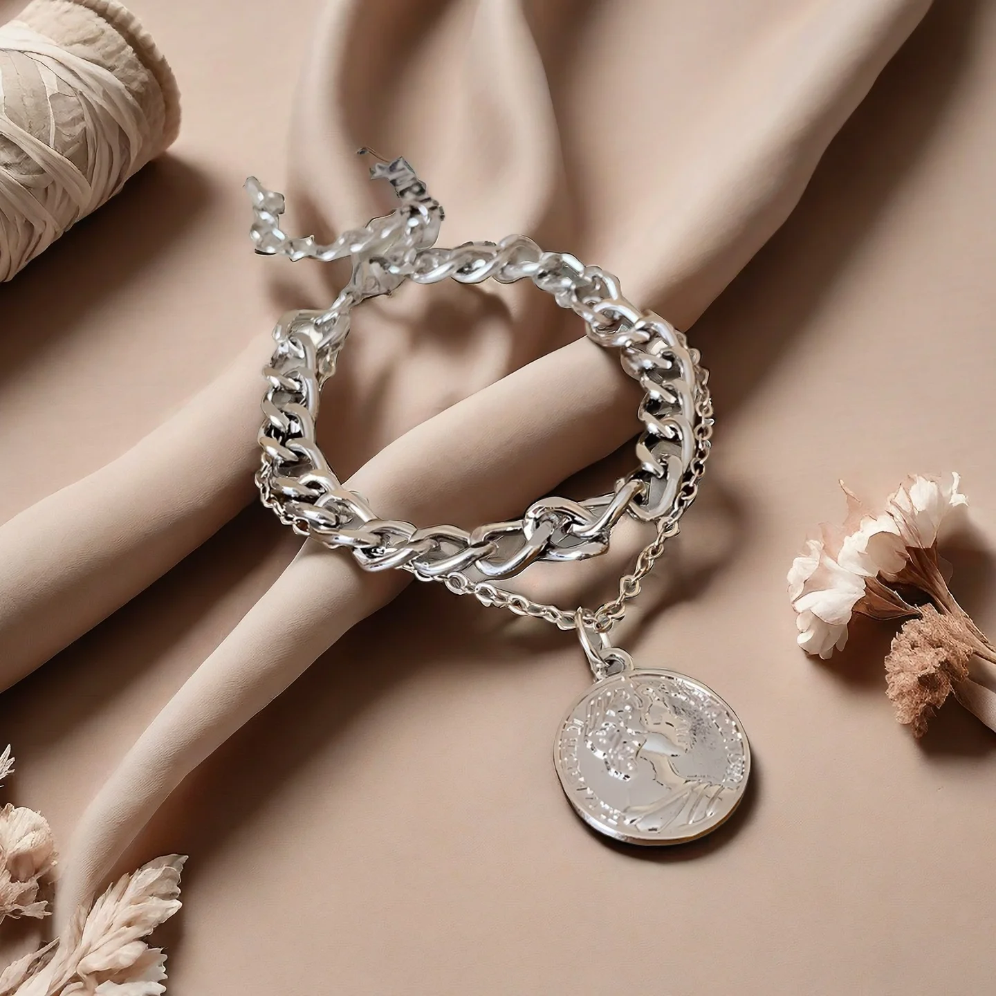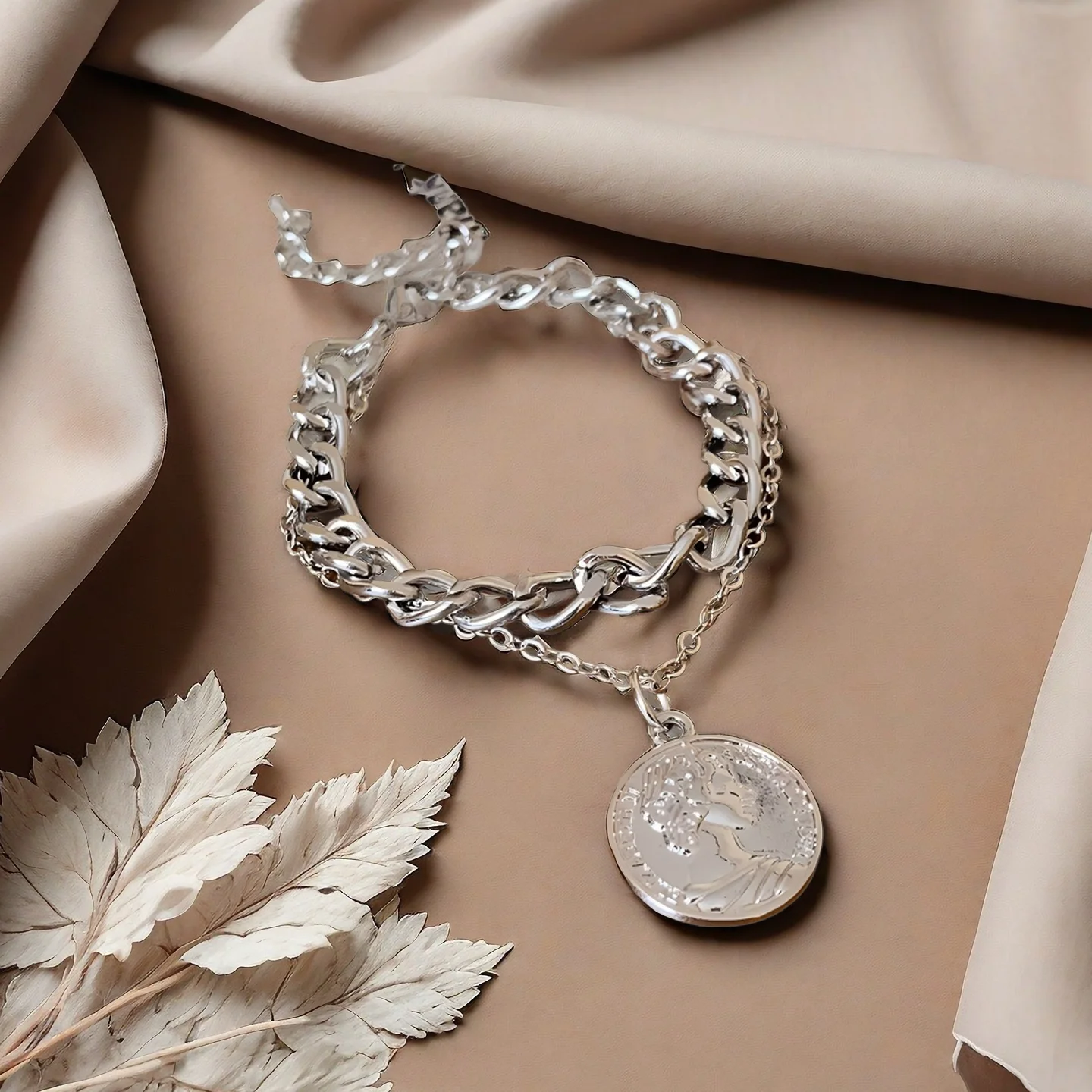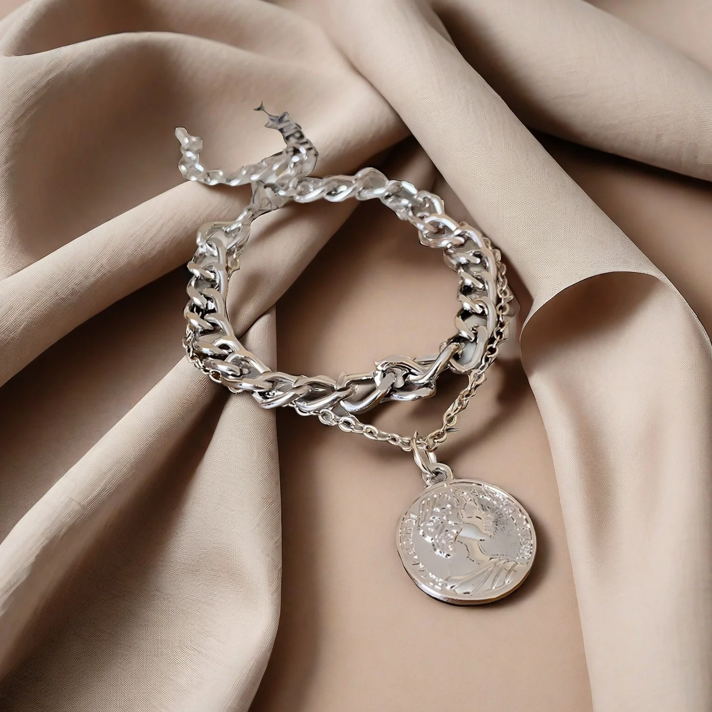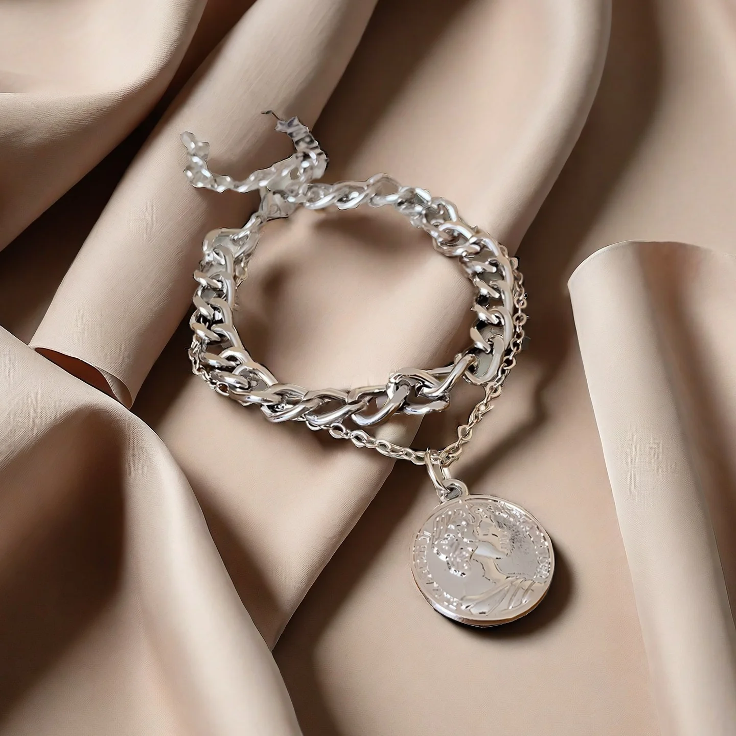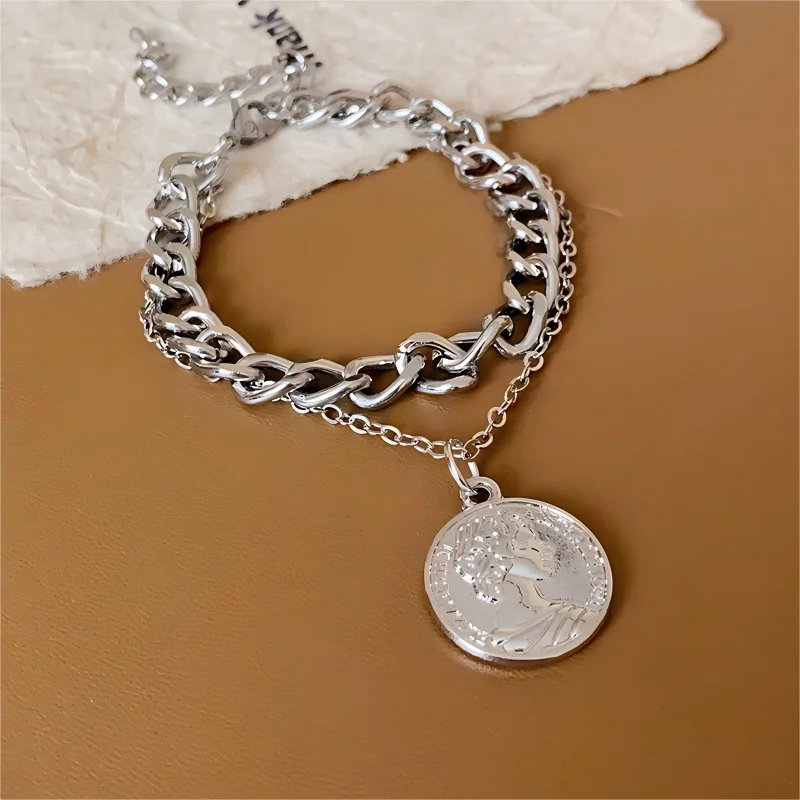 Vintage Layered Chain Bracelet with Coin Charm Silver Tone Punk Style Bracelet for Women Trendy Statement Jewelry Gift