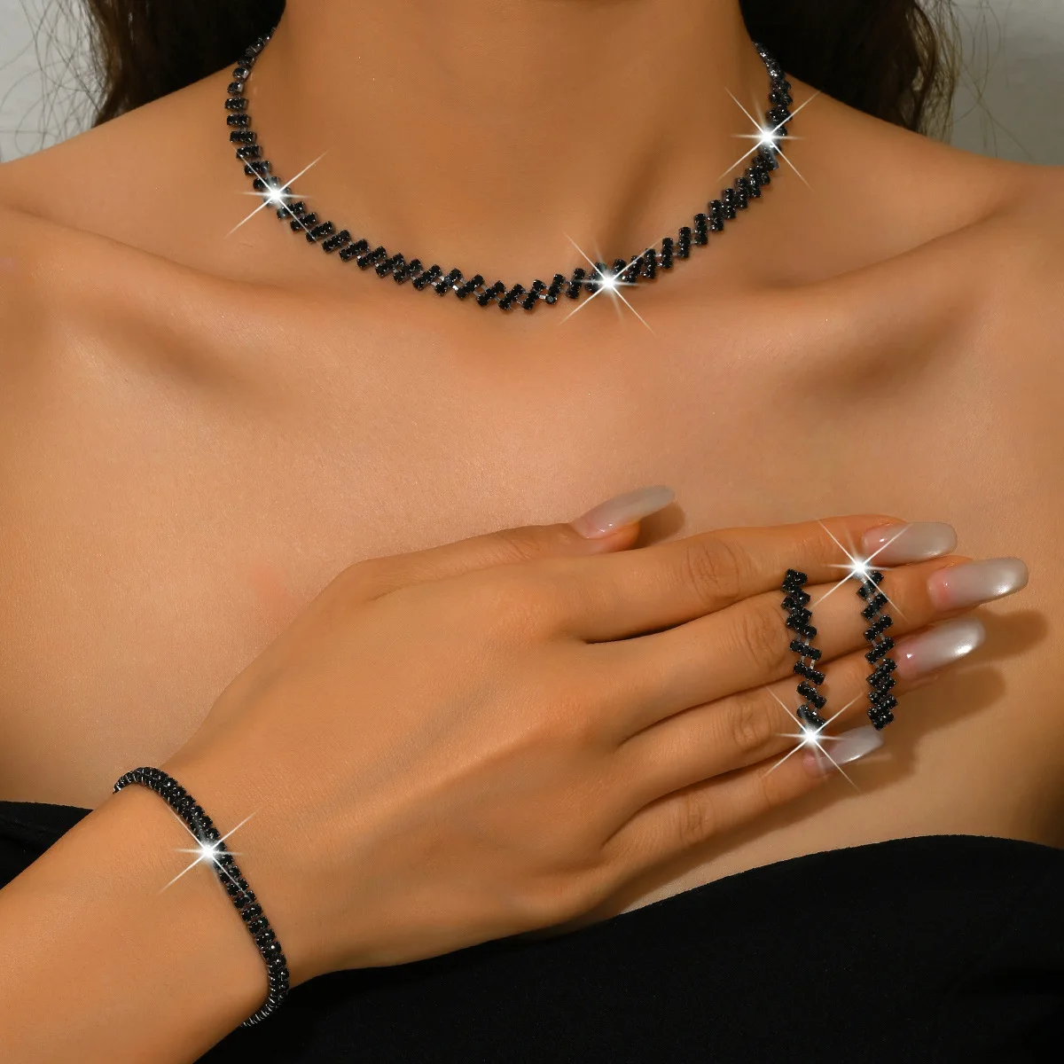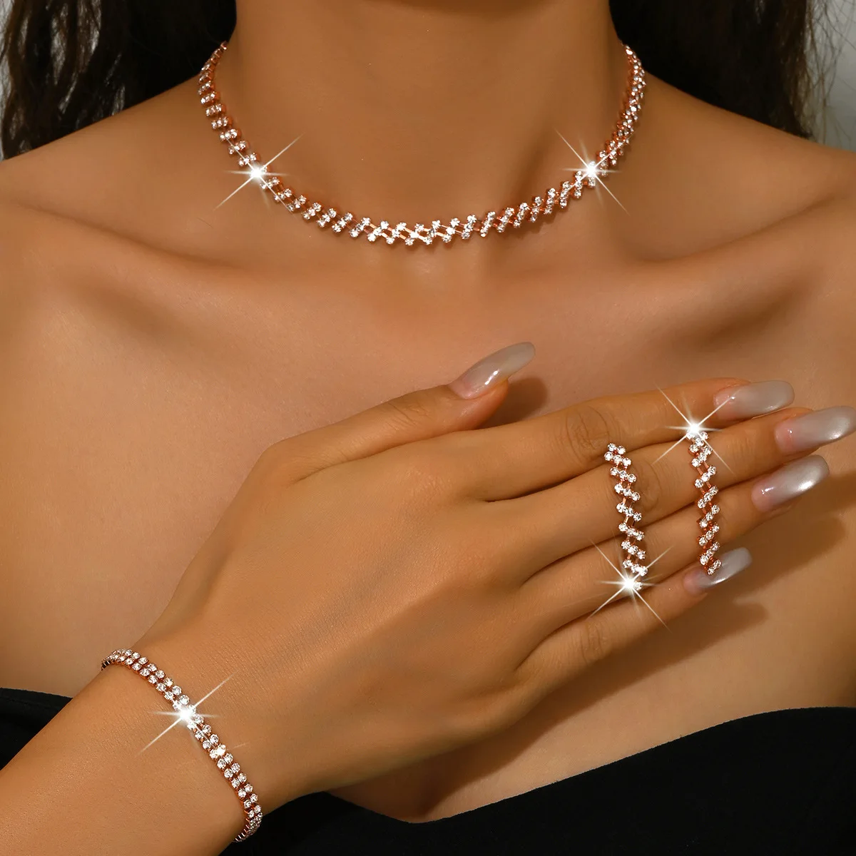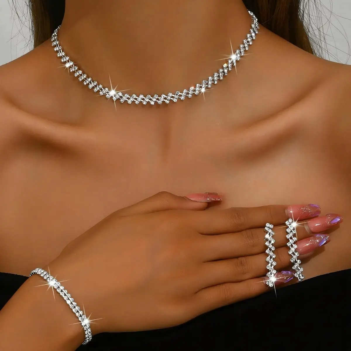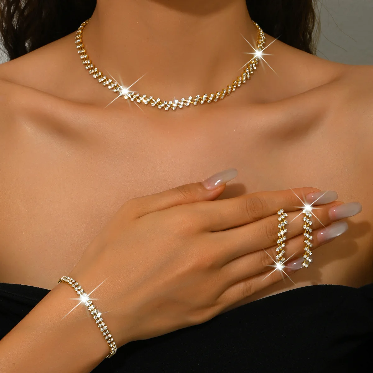 Women's Custom Set Luxury Diamond Alloy Charm Wholesale Dainty Earrings Bracelet Choker Necklaces for Women Fashion Jewelry Sets