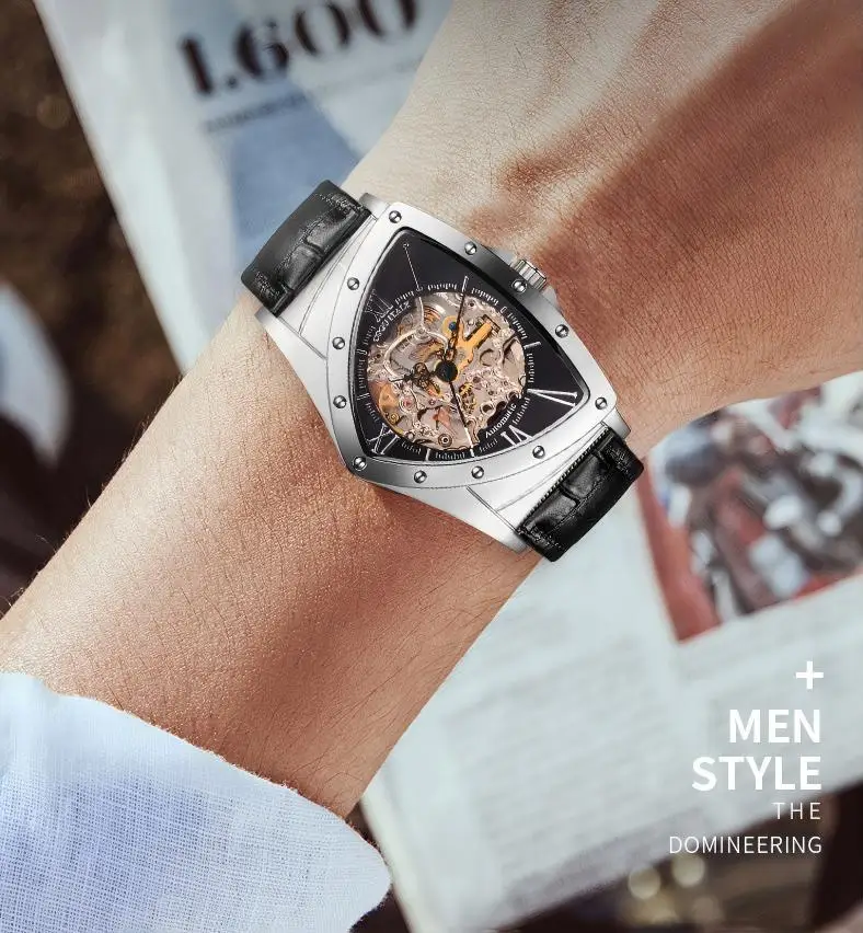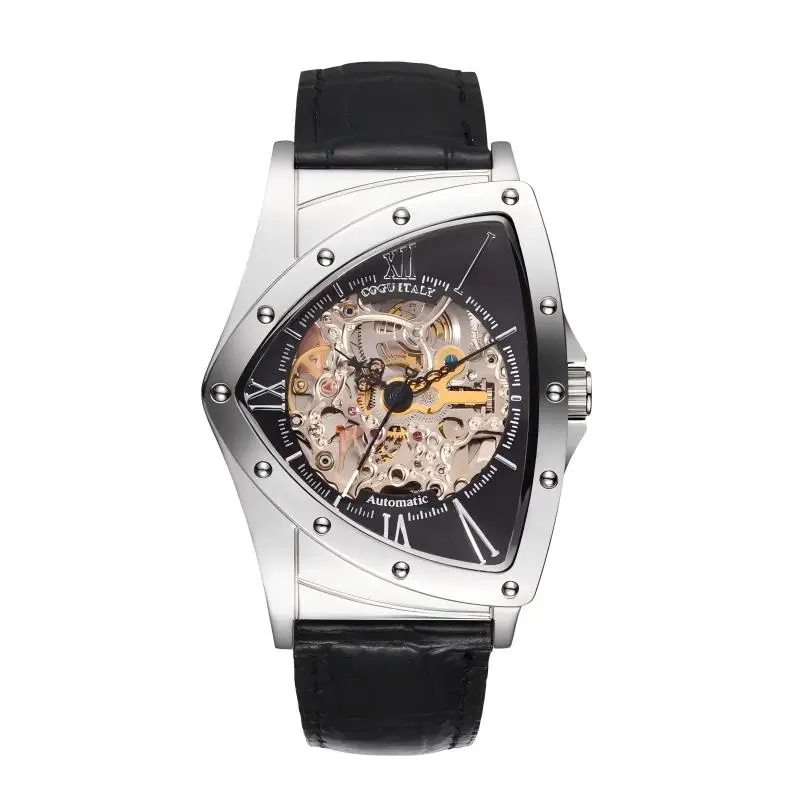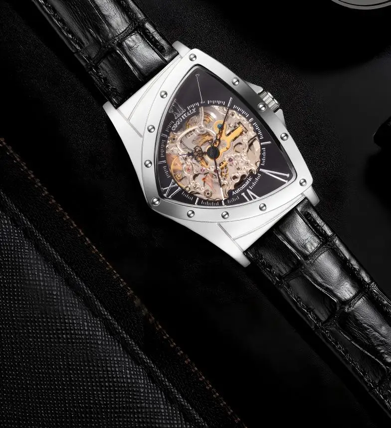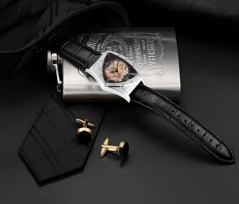 Limited Edition Luxury Shield Skeleton Mechanical Watch Stainless Steel Case Waterproof Cow Leather Band Triangular Case Shape