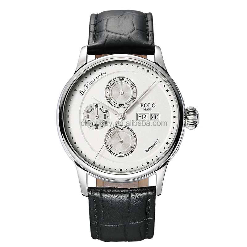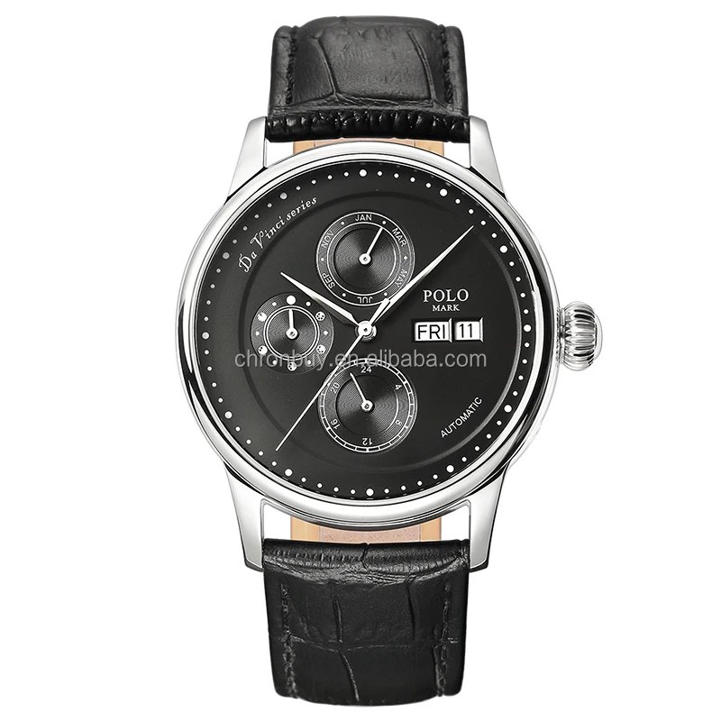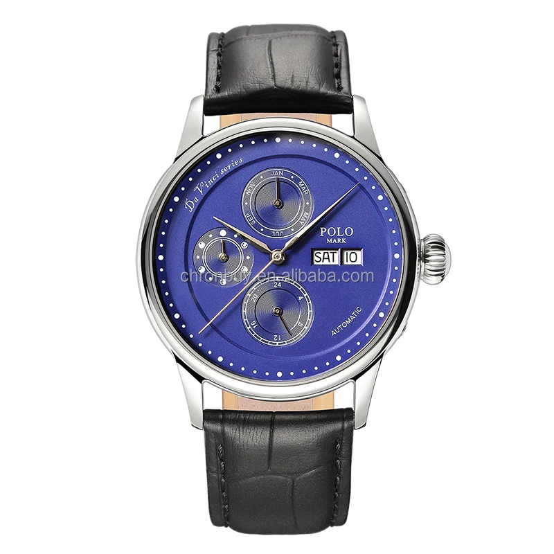 Men's Multi-Functional Mechanical Watch Artist Gold Case Black Dial Sapphire Crystal Leather Strap 30M Waterproof Hangzhou
