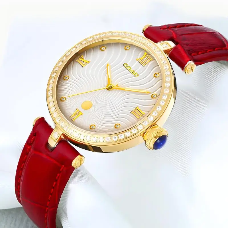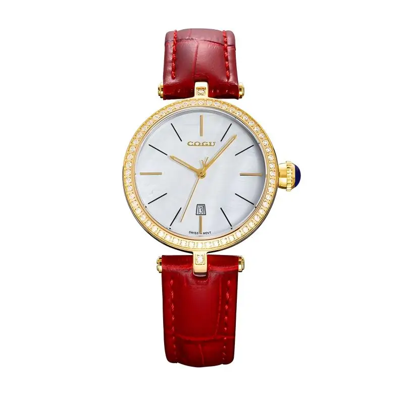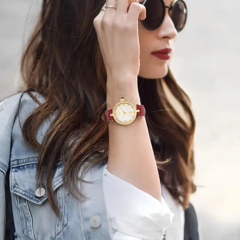 Minimalist Red Quartz Women's Watch Sparkling Dial Leather Band Ronda Movement 37mm Diameter 16mm Band Width Fashion Pointer
