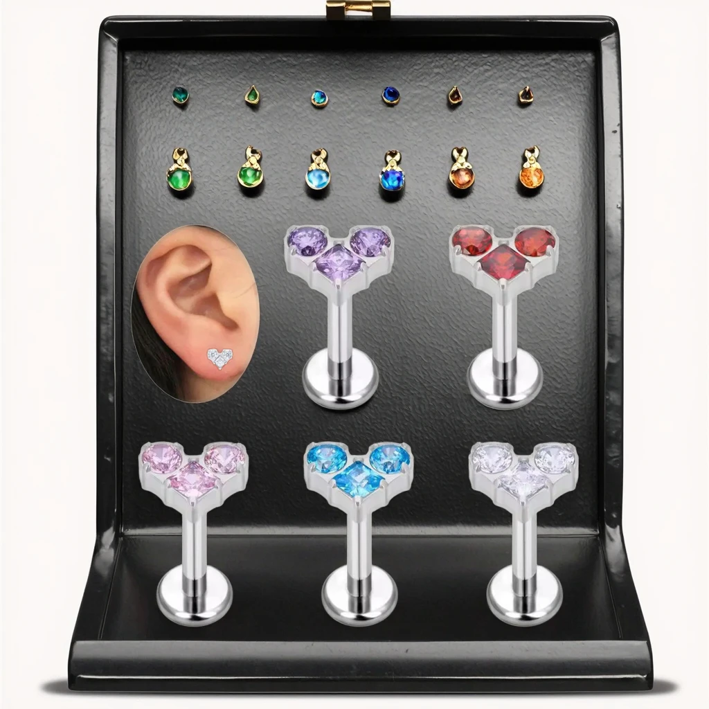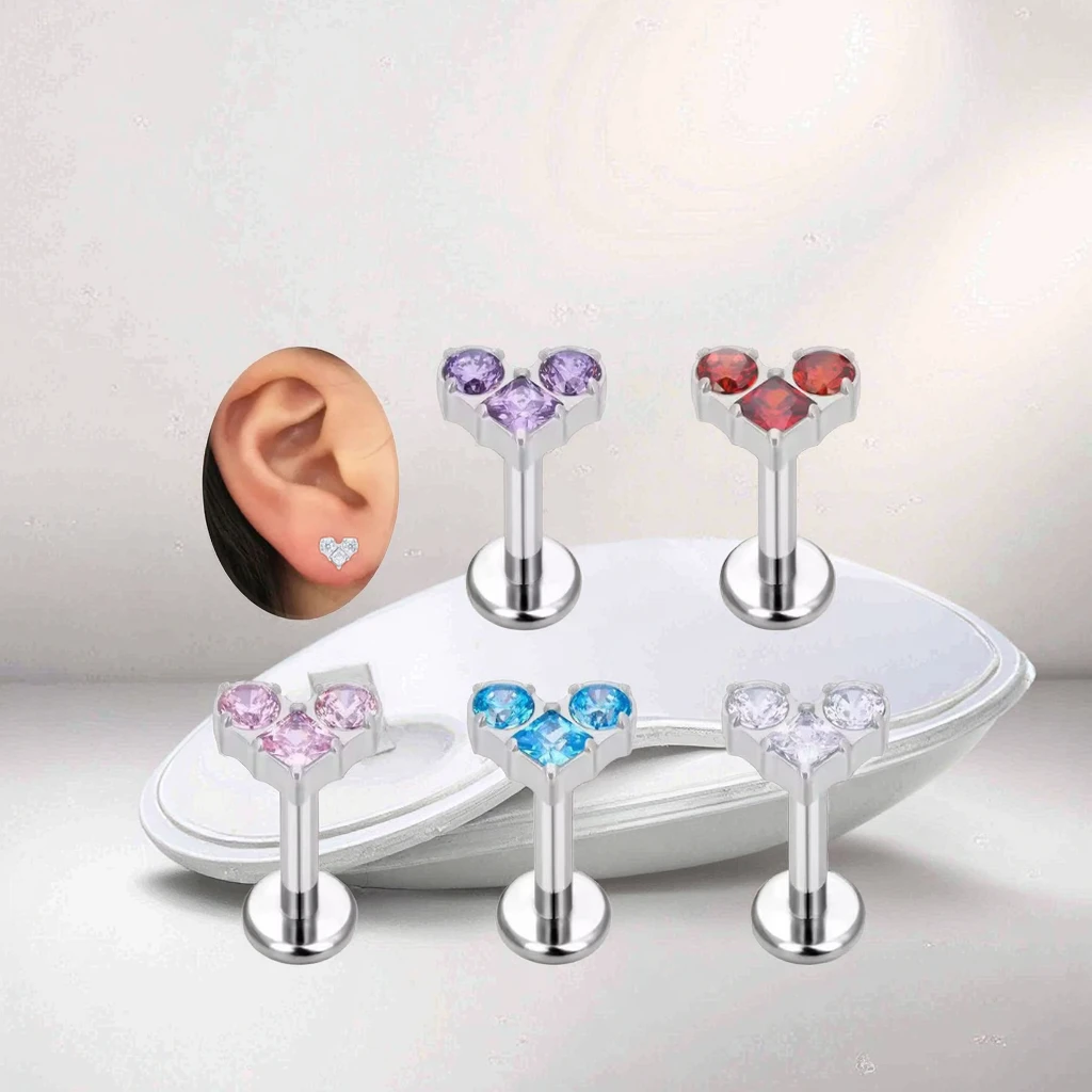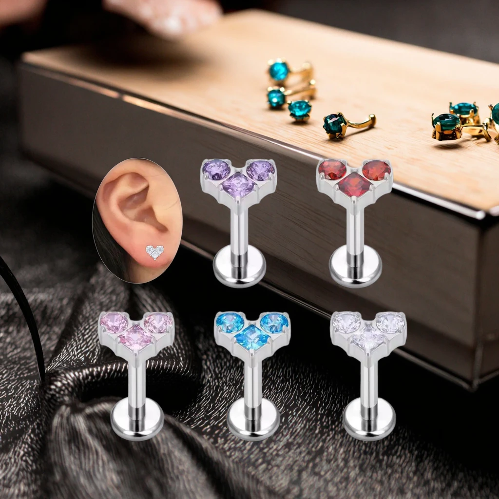 Flat Back Earring Women Fashion Helix Piercing 16G Zircon Heart Labret Piercing Lip Ring Stainless Steel Body Jewelry for Women