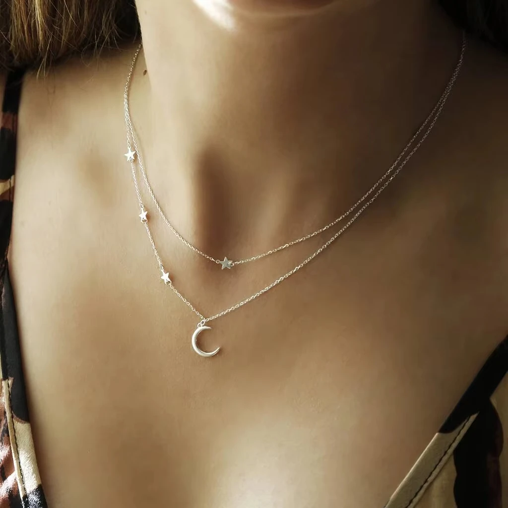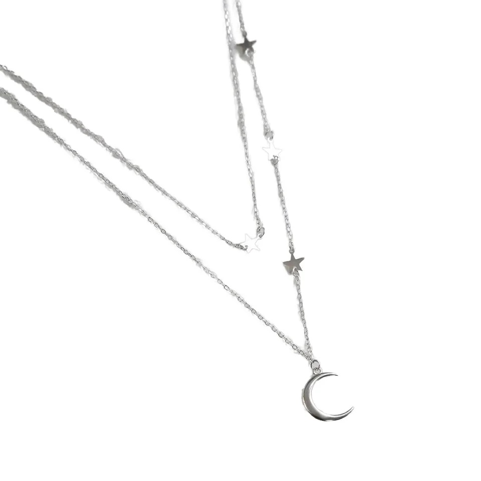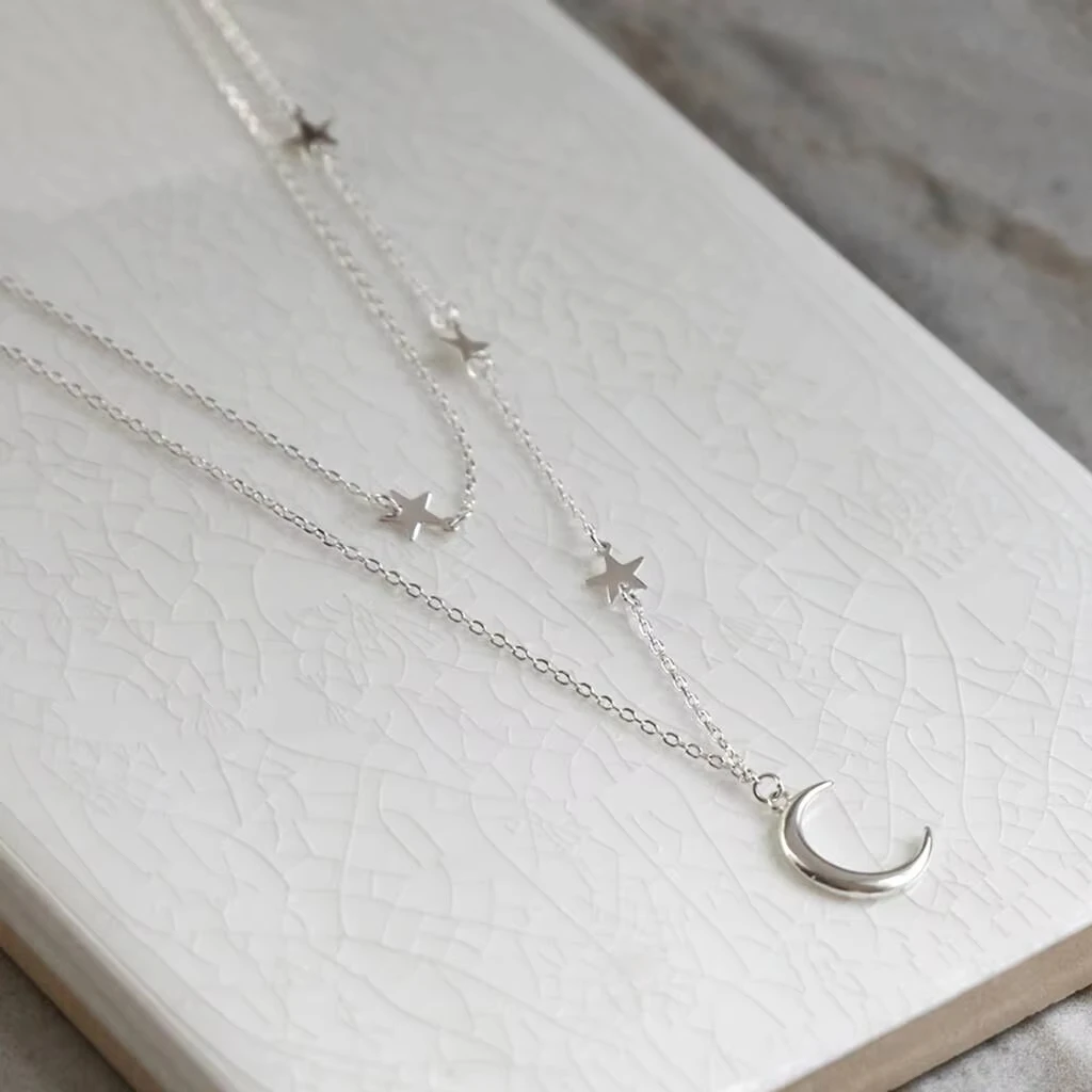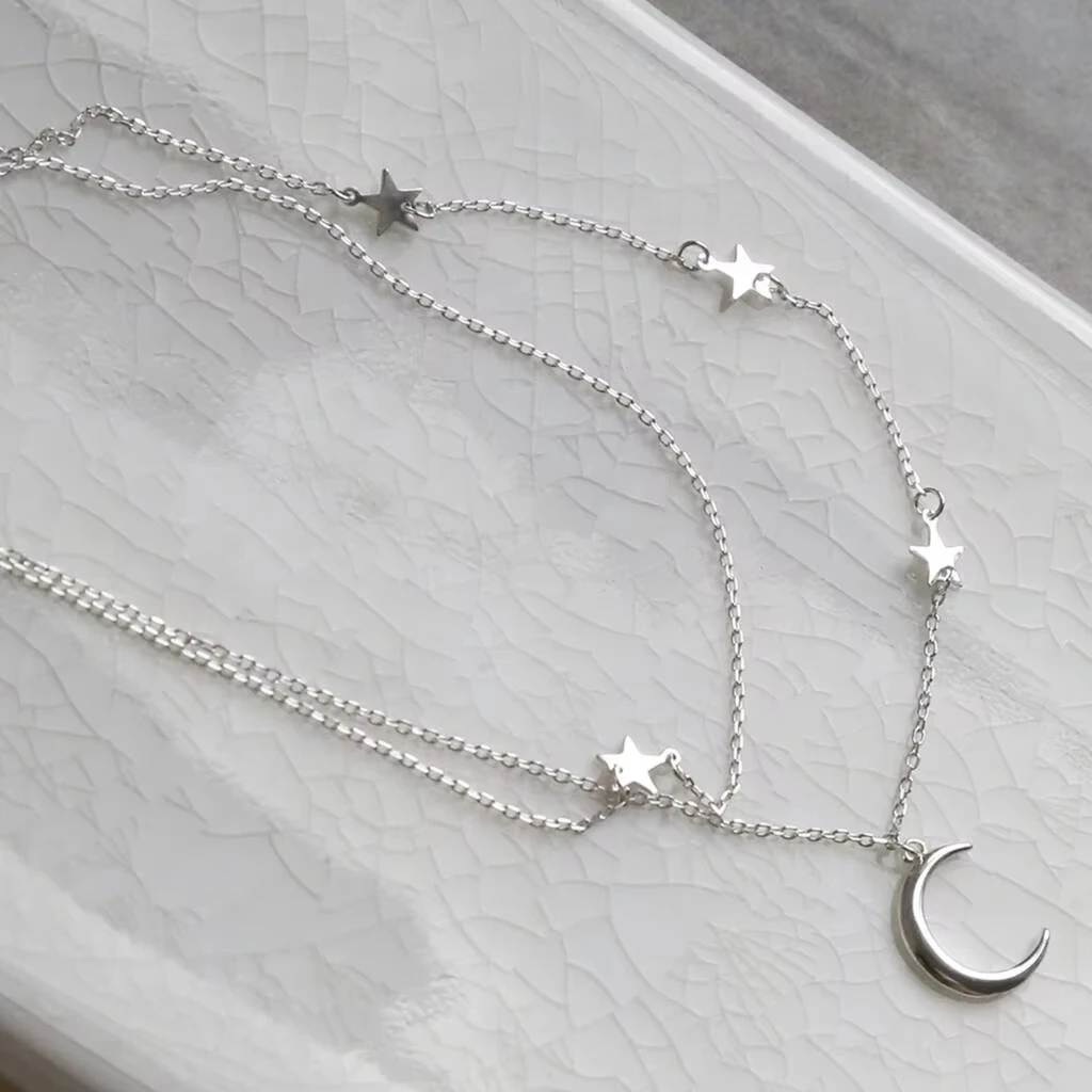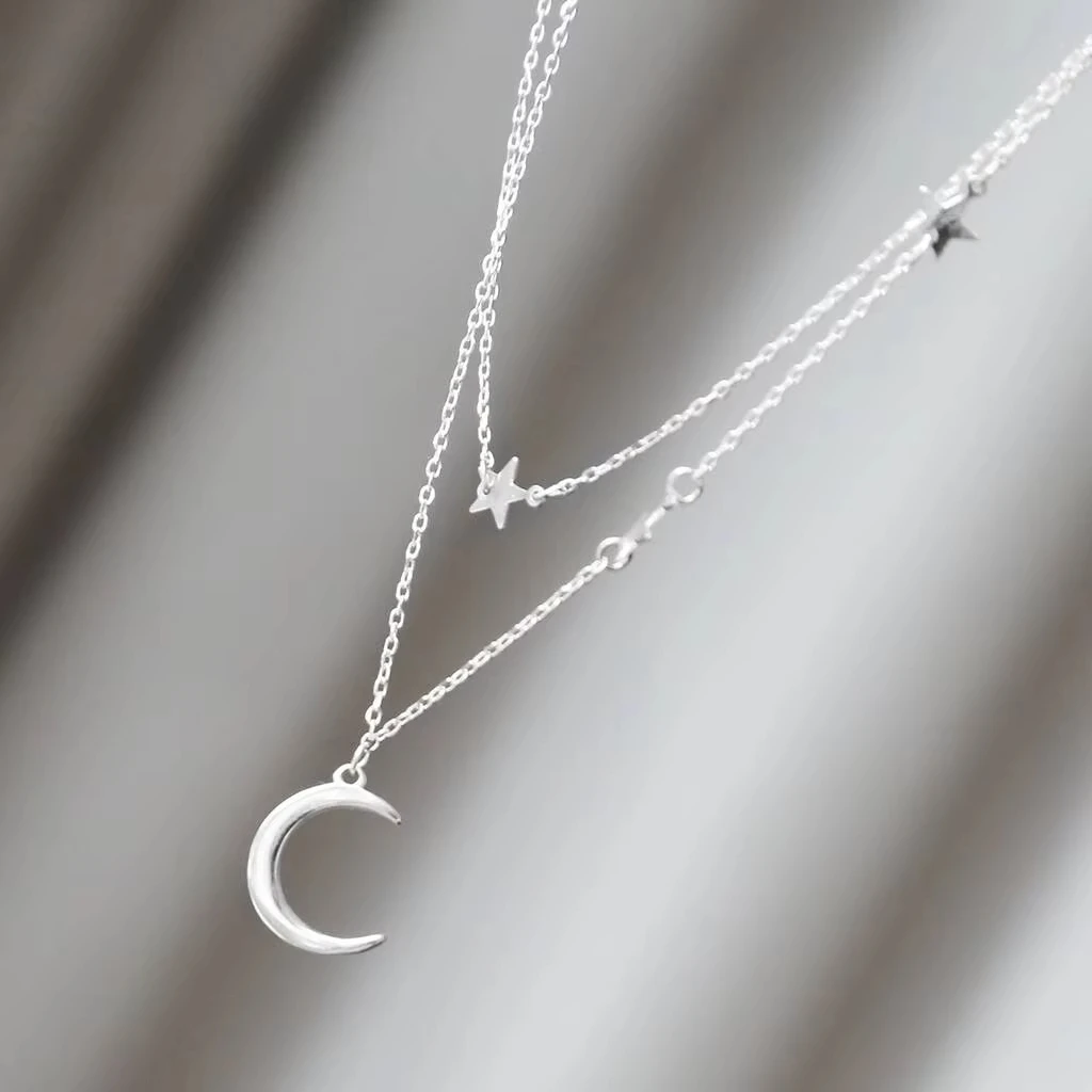 925 Sterling Silver Star Tassel Moon Pendant Choker Necklace for Women Rhodium & Black Rhodium Plated Strand Chain