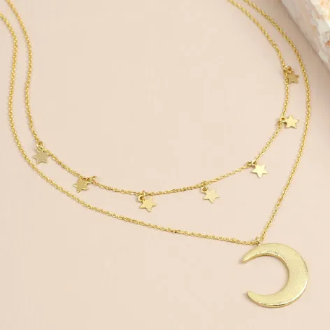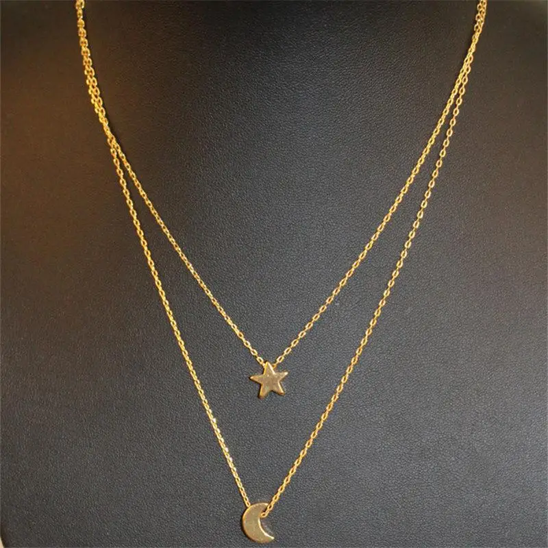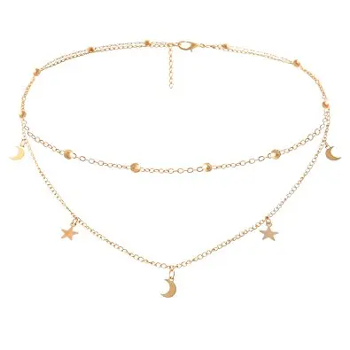 Wholesale 925 Sterling Silver Plain Moon and Star Chokers Beaded Chains with Moon Star Charms Double Chain Necklace