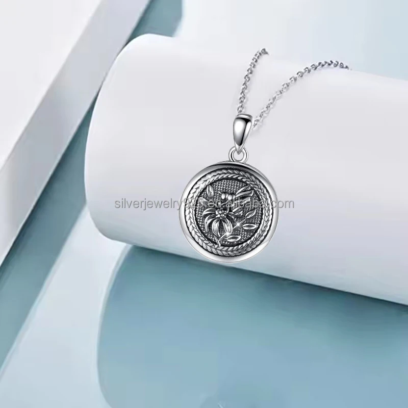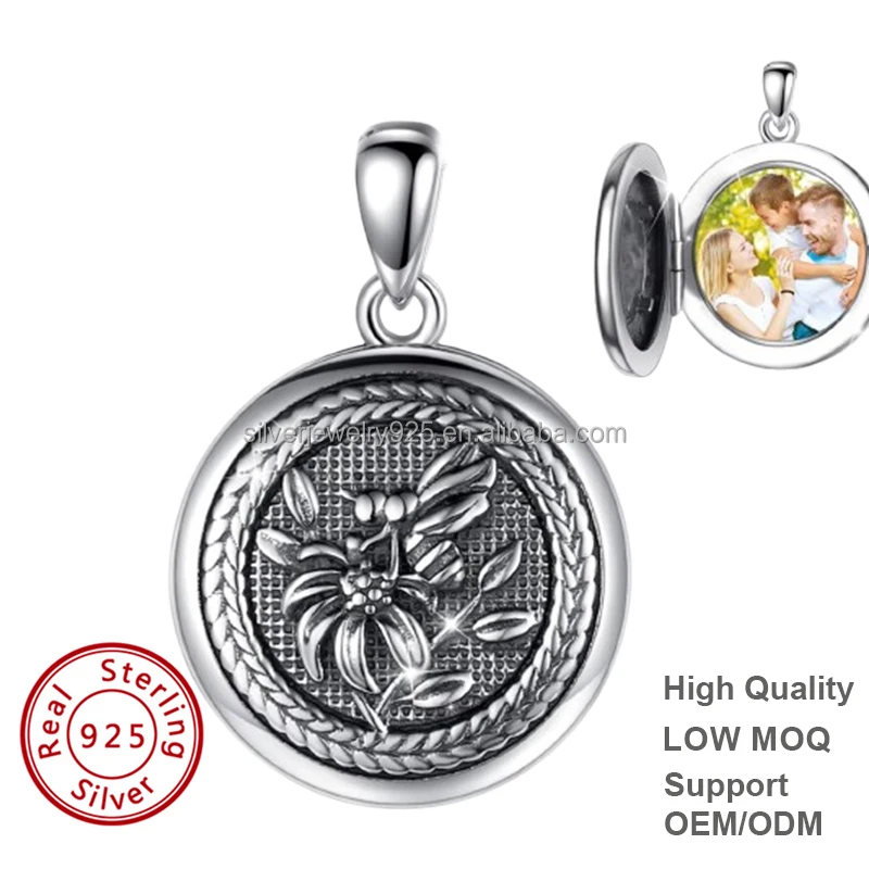 High Quality Memorial Jewelry 925 Sterling Silver Rhodium Plated Bee and Flower Design Round Photo Locket Women Necklace Pendant