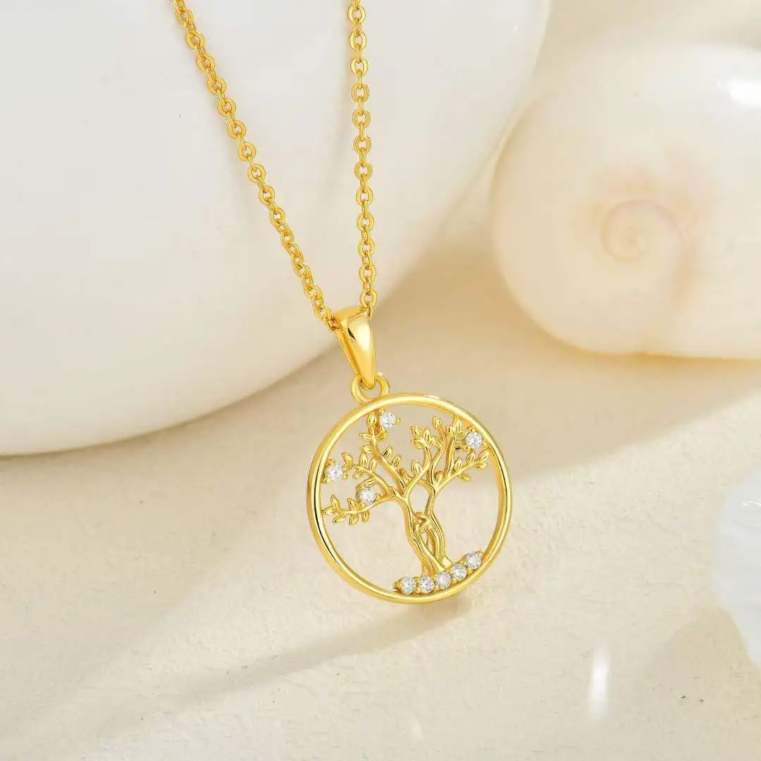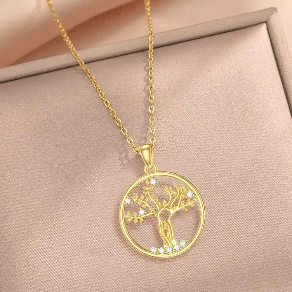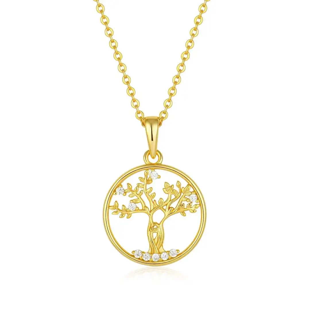 Women's 18K Gold Plated Luxury Statement Necklace Zirconia-Capped Tree Life Pendant Link Chain Wedding Engagement Gift Brass