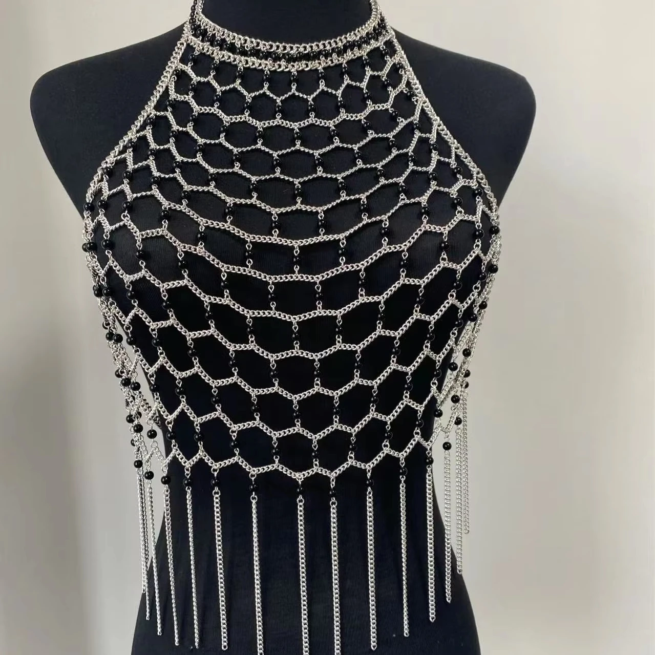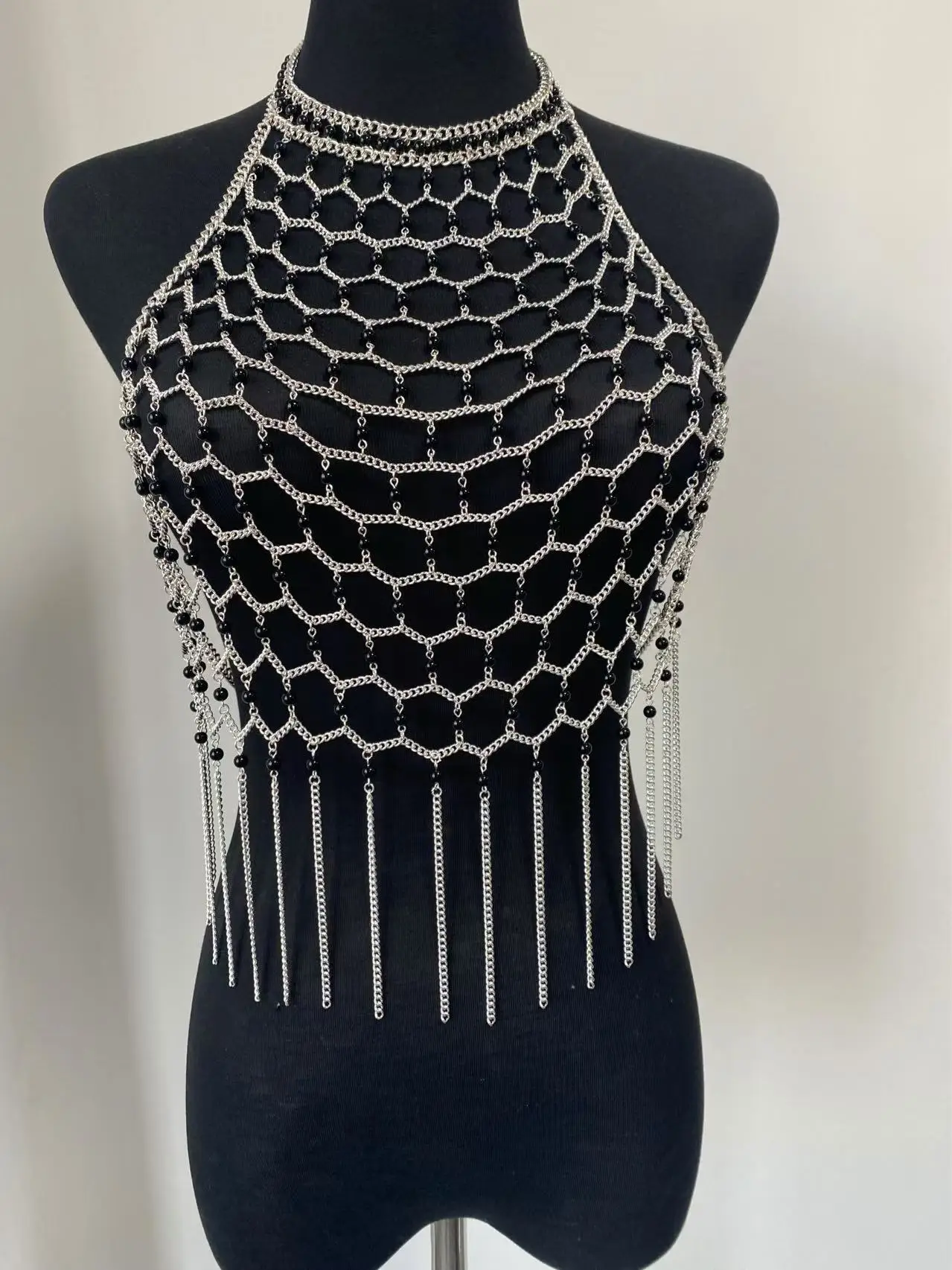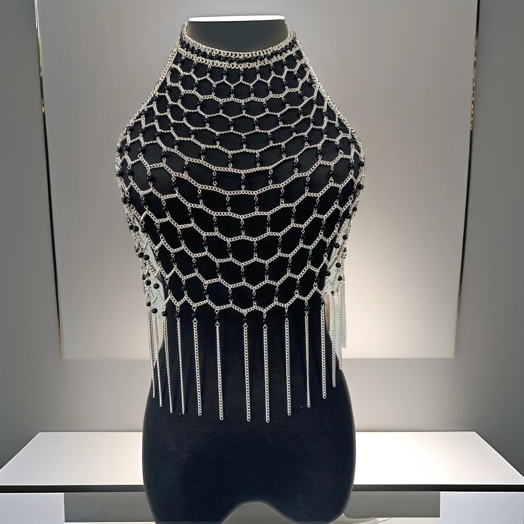 Exquisite Female Evening Blouse Dress with Hollow out Decoration Hand-Woven Sexy Pearl Chain Stainless Steel Jewelry