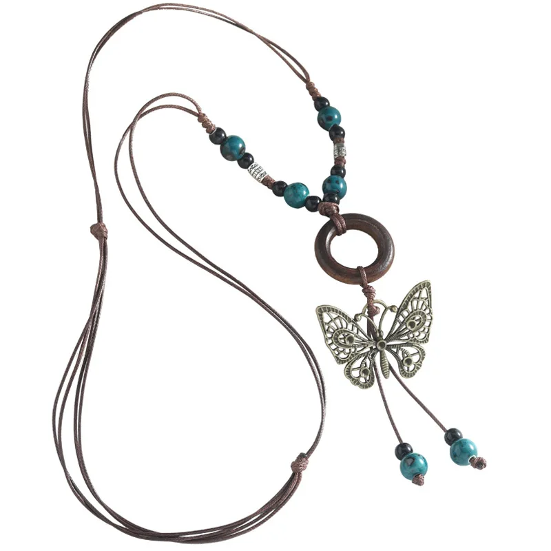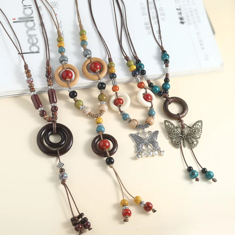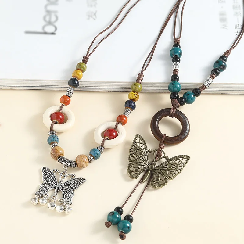 Ethnic Style Butterfly Diamond Pendant Ceramic Necklace Long Sporty Versatile Bamboo Circle Sweater Adjustable Clothing