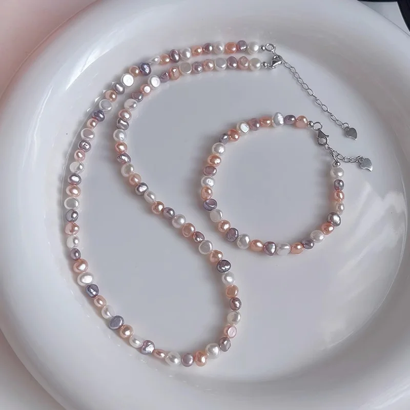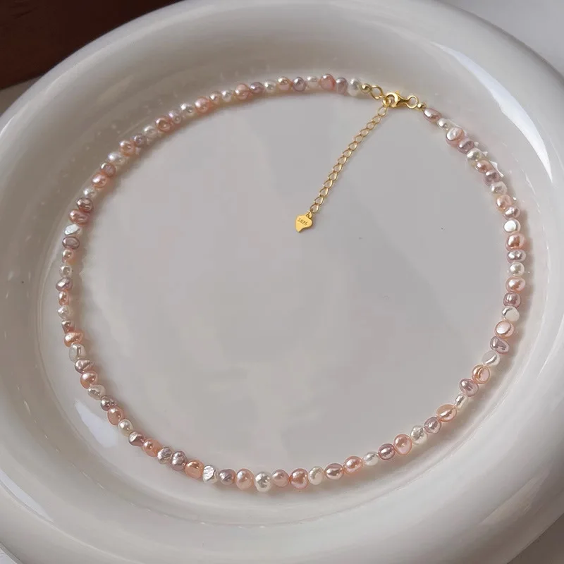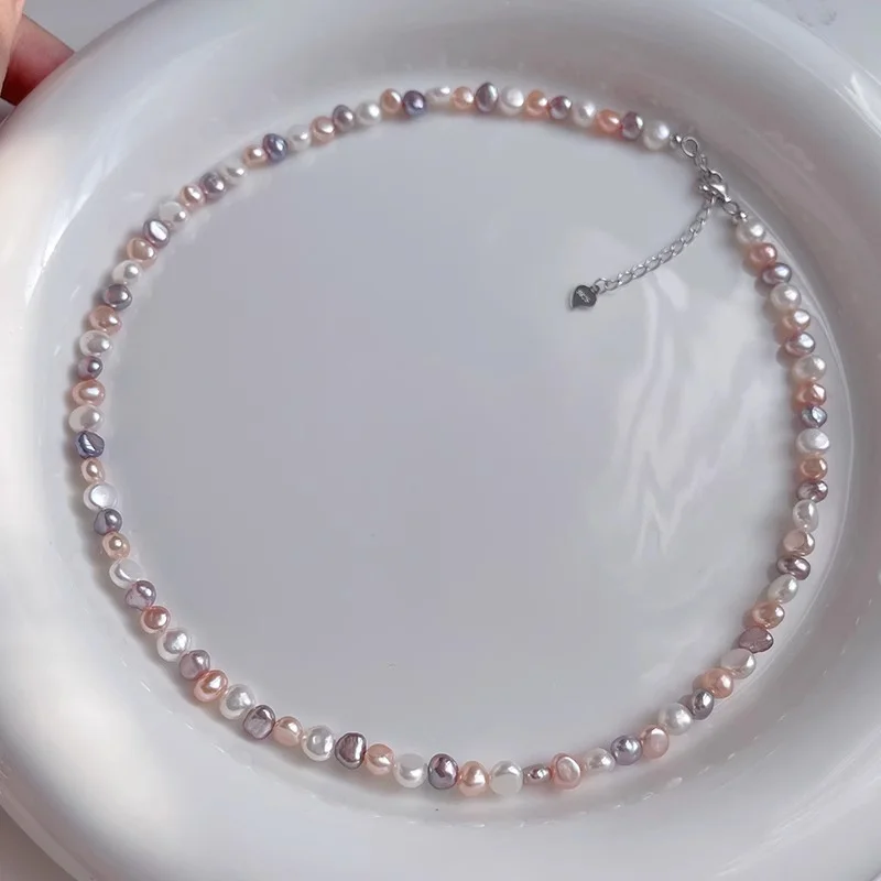 S925 Silver Baroque Freshwater Pearl Necklace for Women Candy Color Clavicle Chain Trendy Jewelry Accessory