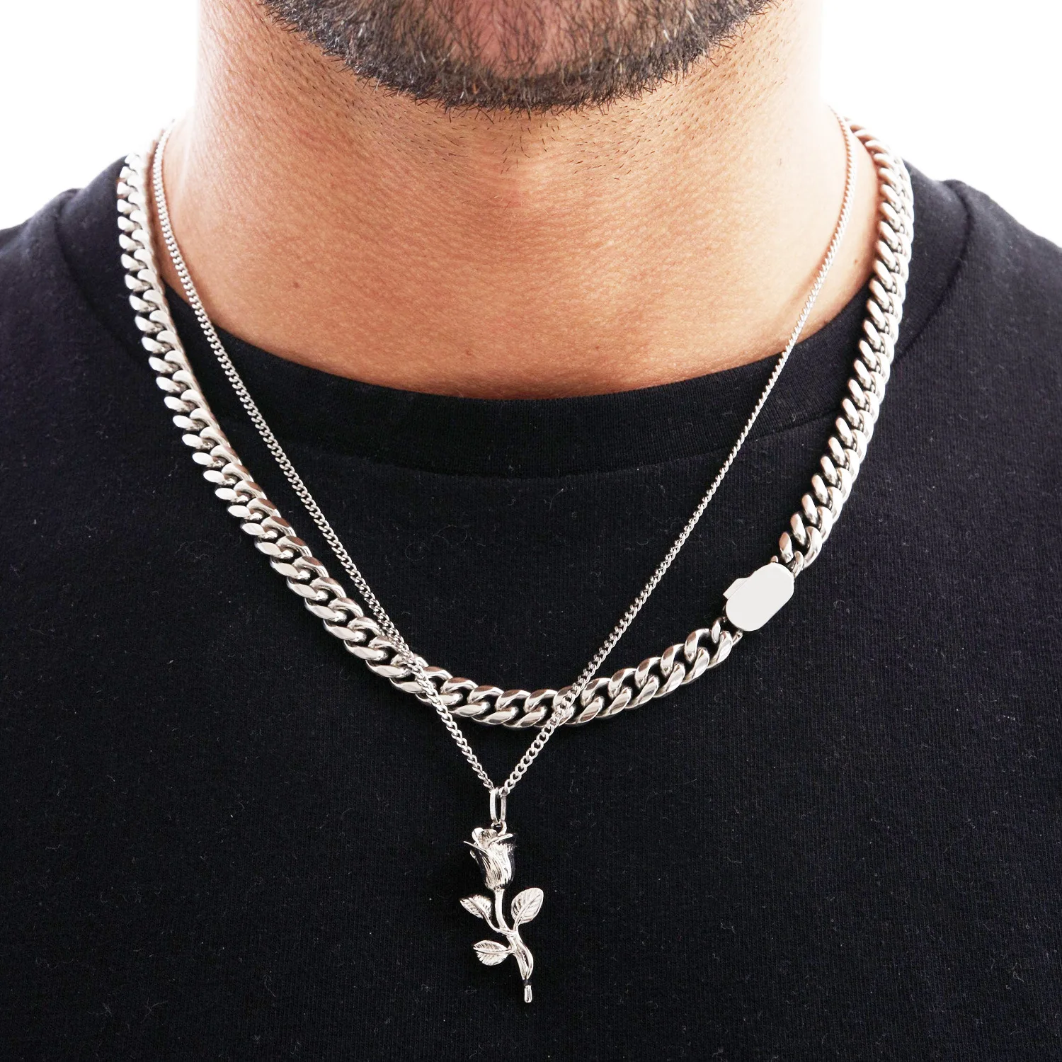 Men All Match Rose Pendant Necklace Stainless Steel Two Face Grinding Cuban Link Trendy Sweater Accessory for Boys Fashion