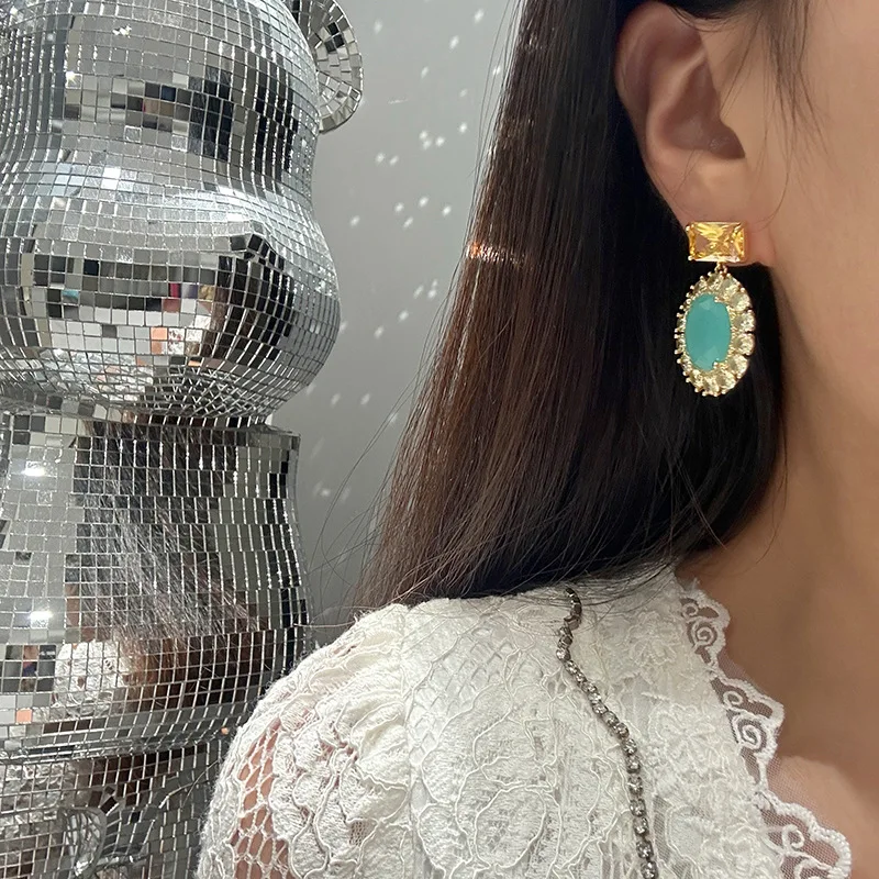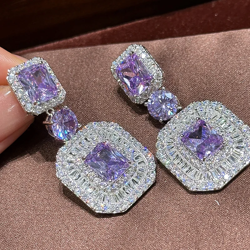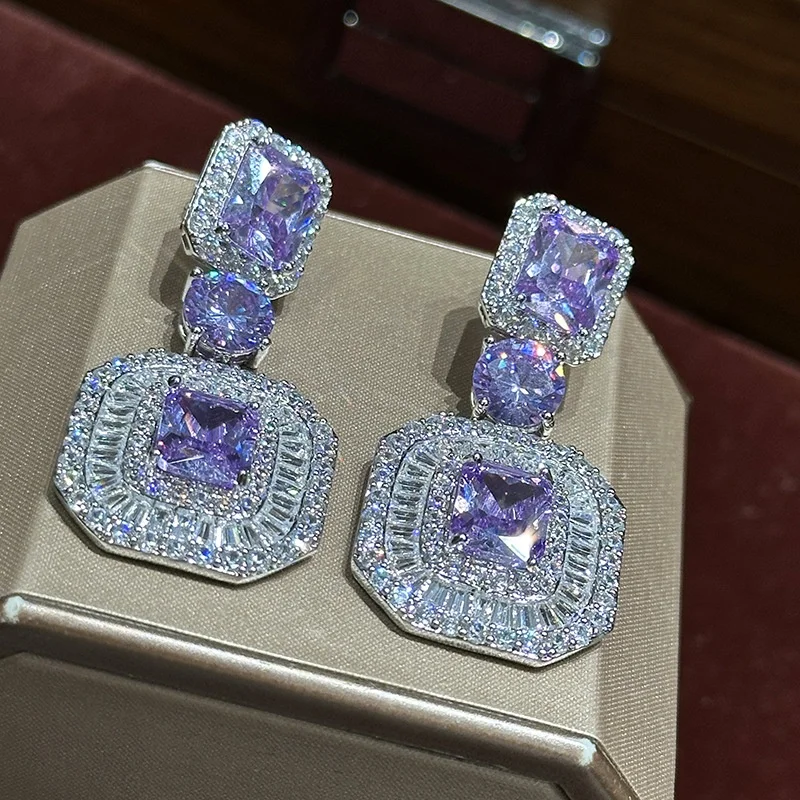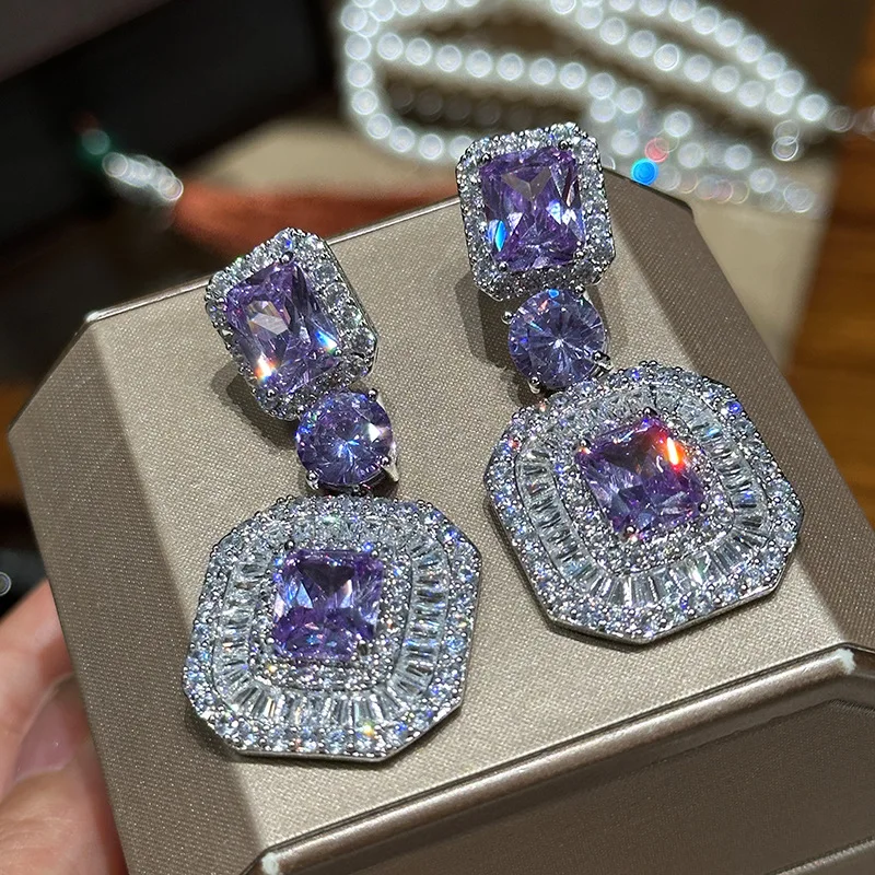 Very Luxury Purple Crystal Square Brand Diamond Earrings Atmospheric Trendy Simple High-end Expensive Full Set Fine Dangle Style