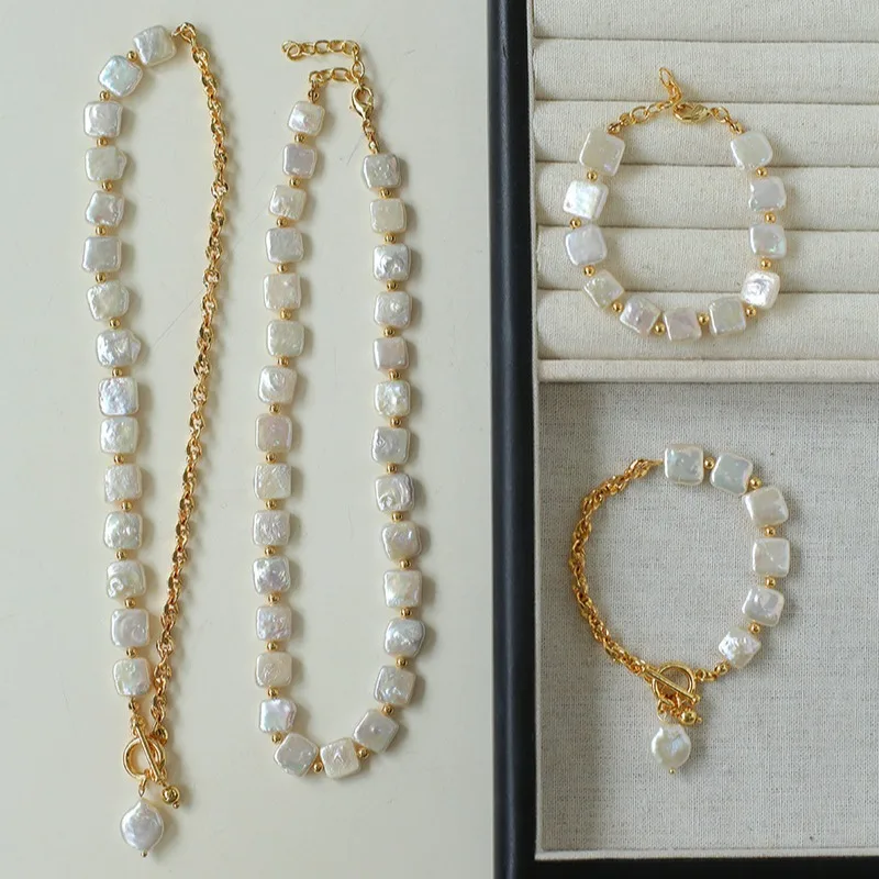European American Fashion Handmade Necklace Women Freshwater Baroque Square Drop Shape Woven Pearl Chic Pearl Necklace