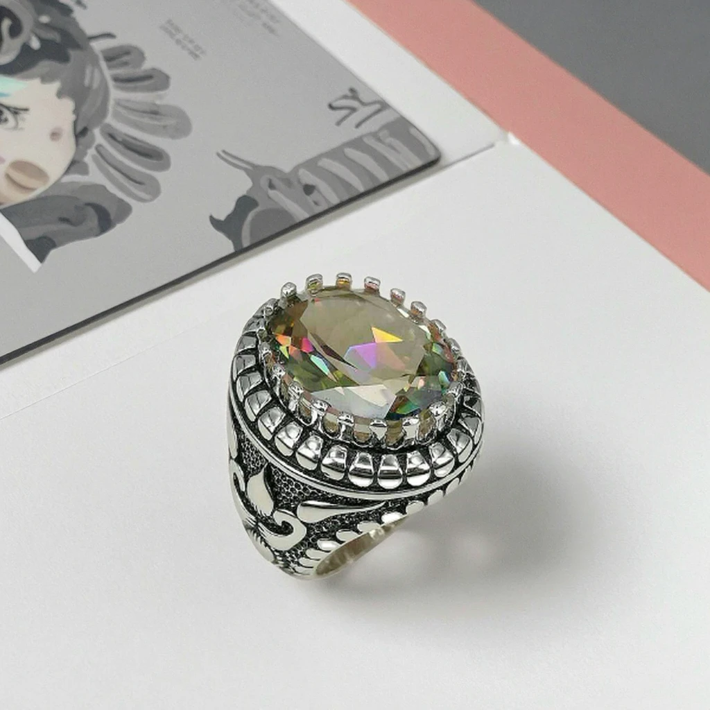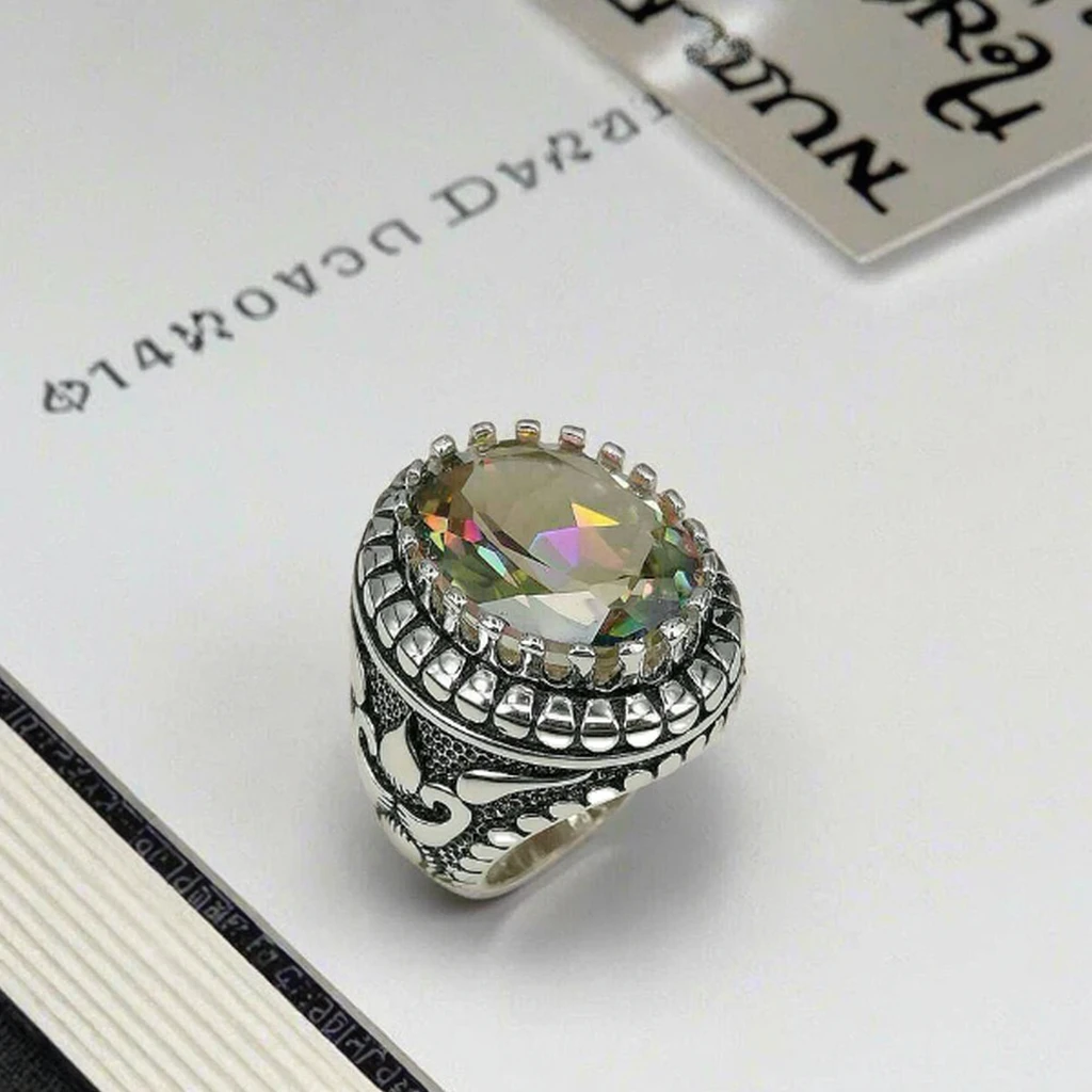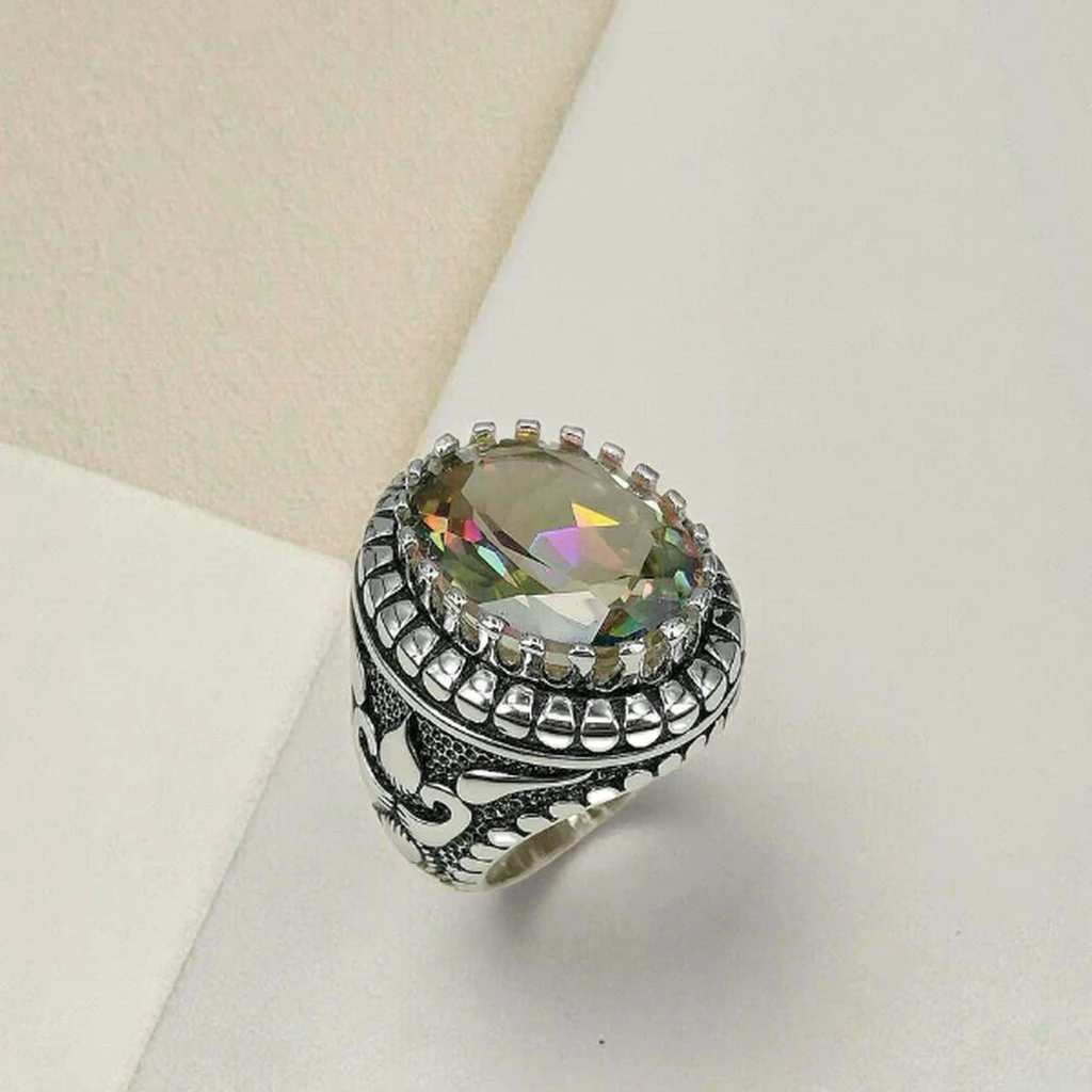 Keiyue Vintage Islamic 925 Sterling Silver Gemstone Rings for Muslim Men Wedding & Party ZIRCON Opal Moonstone Channel Set