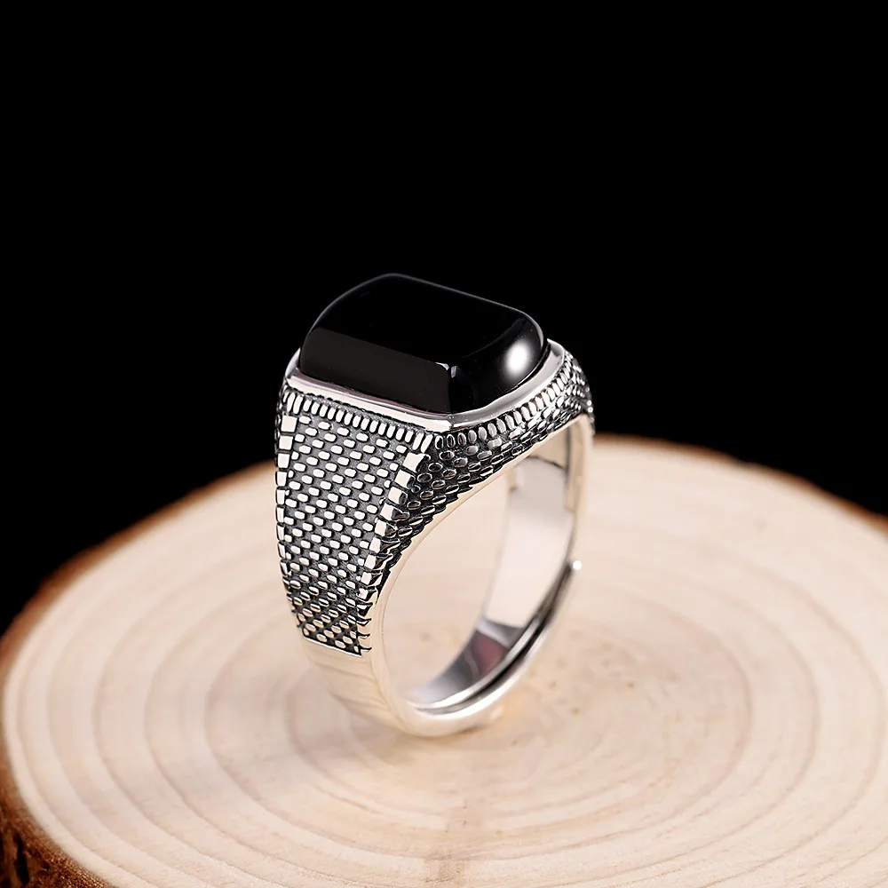 Vintage Turkish Jewelry Black Ring Mens Real 925 Sterling Silver Rings with Natural Agate Stone