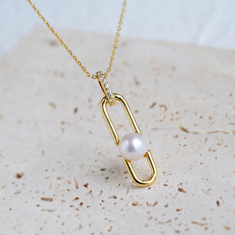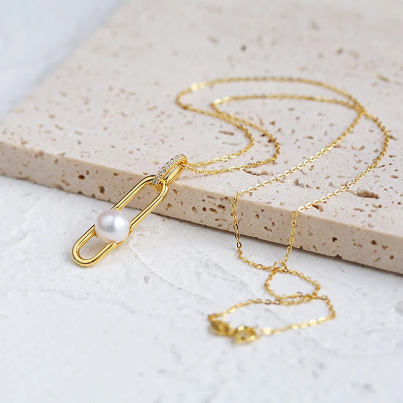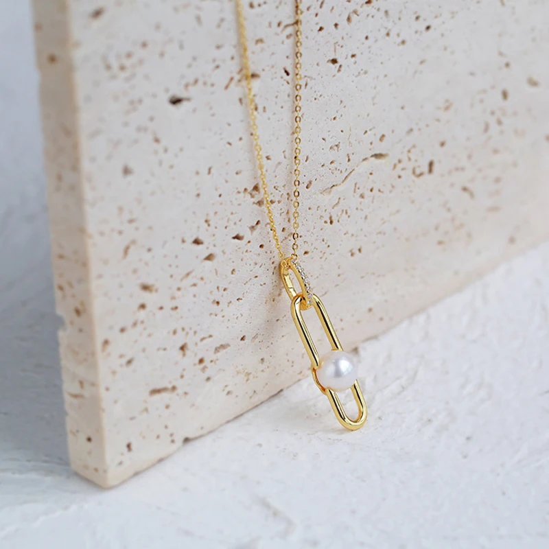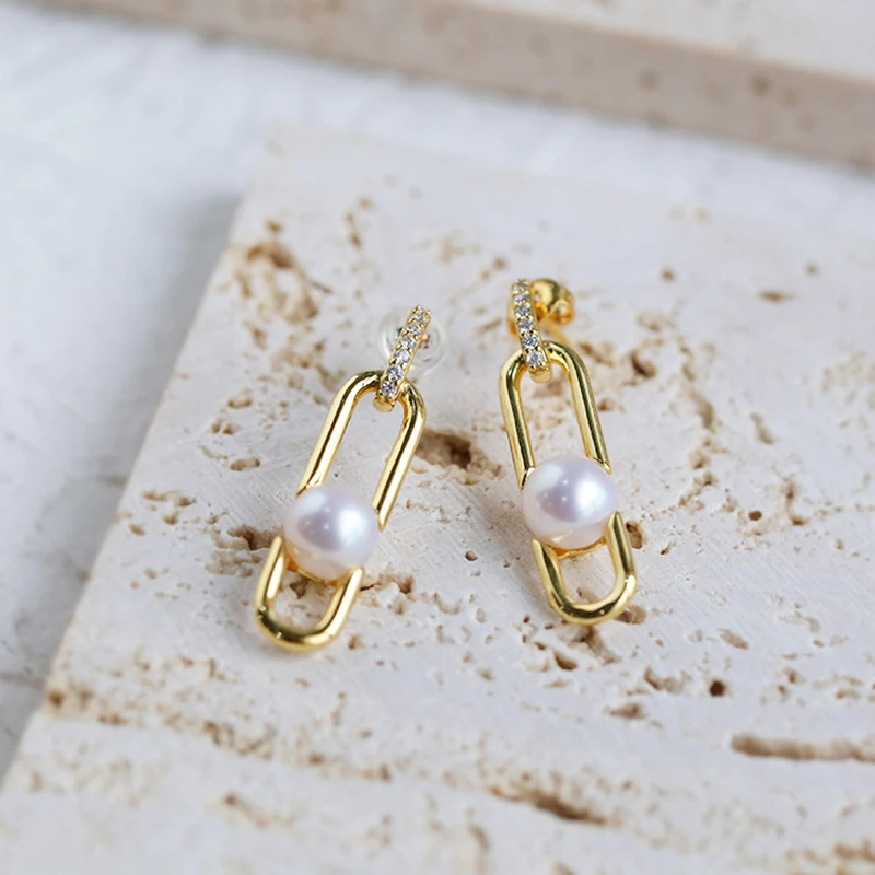 Gold Plated S925 Silver Paper Clips Elegant Design Earrings Ring and Necklace Freshwater Pearl Geometric Jewelry Set for Women