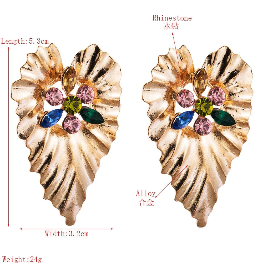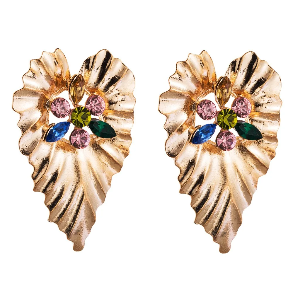 Popular Exaggerated Multi Color Stone Stud Earrings With Gold Plated Heart Shape Palm Leaves Shaped Earrings Plant Jewelry