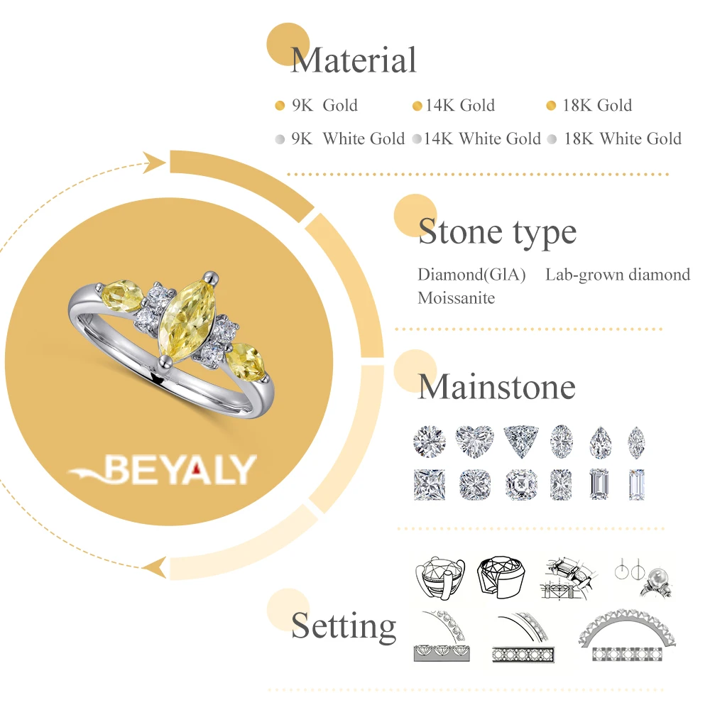 White Gold Marquise Cut Yellow Diamond Ring Luxury Real 9K 14K 18K Diamond Engagement Wedding Gold Ring for Women