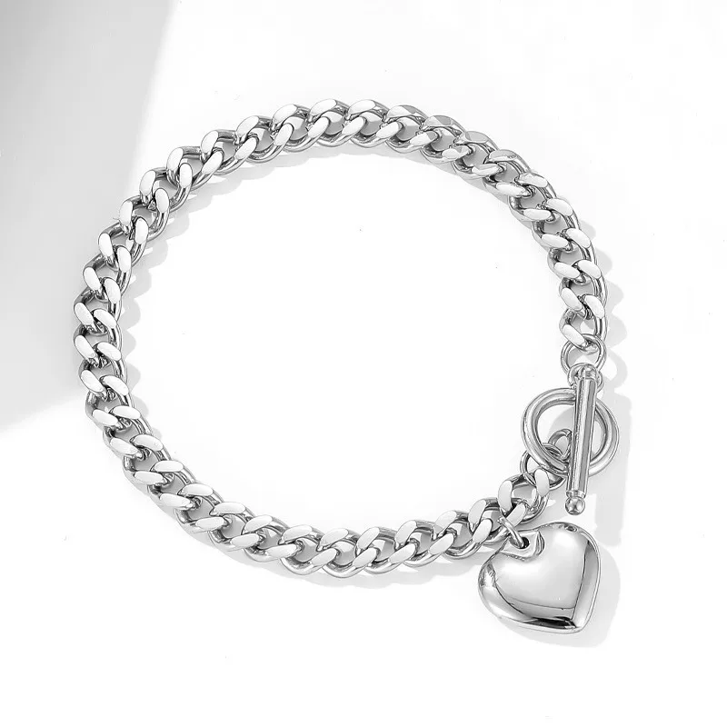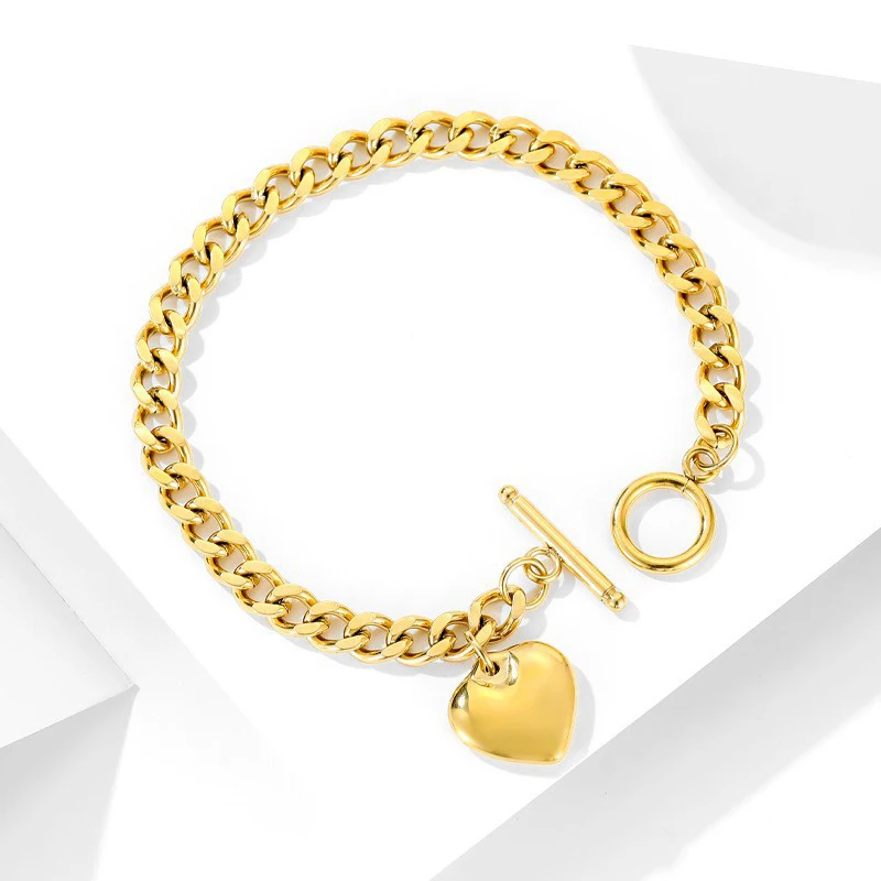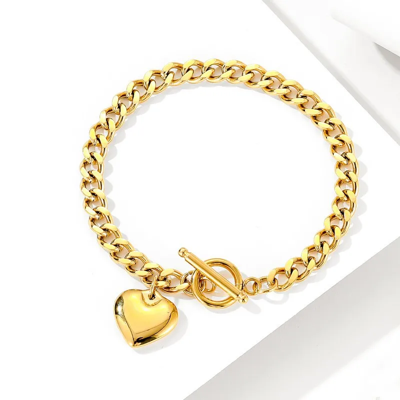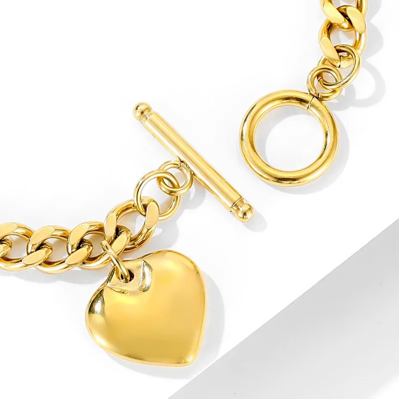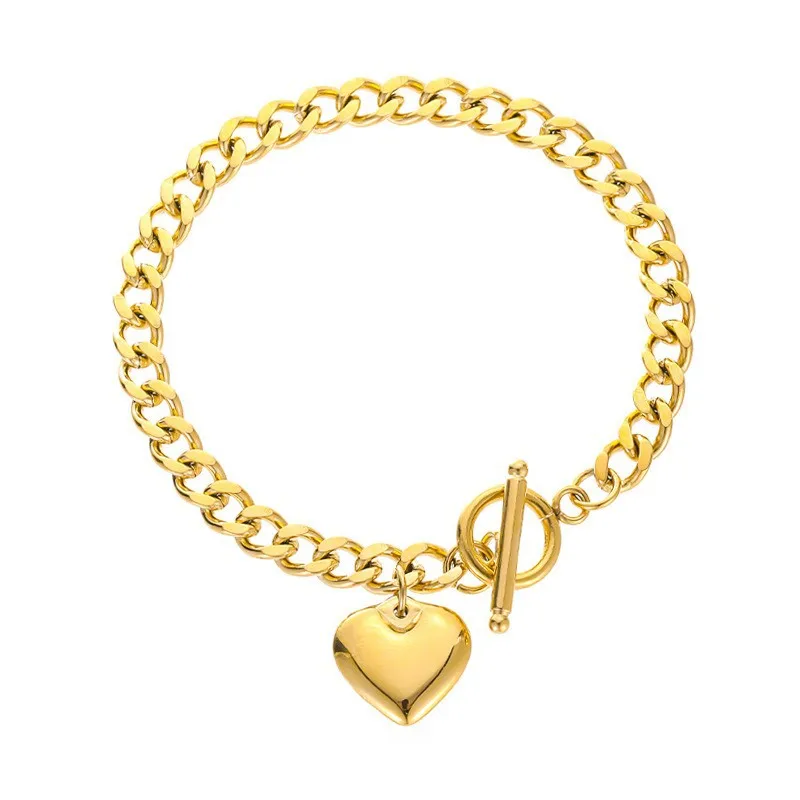 18K Gold Plated Titanium Steel Cuban Chain Heart Bracelet Fashion OT Clasp Bangles with T-Bar Charm Gold Heart OT Jewelry