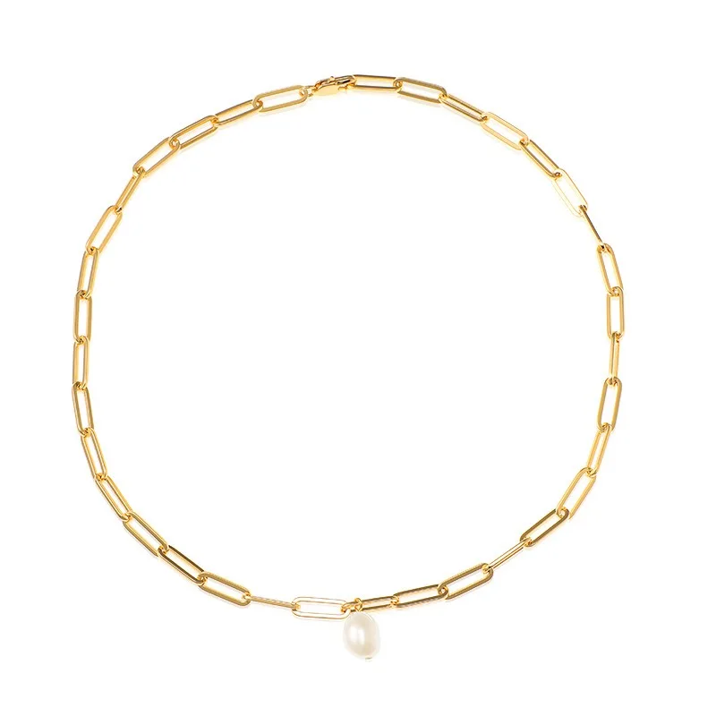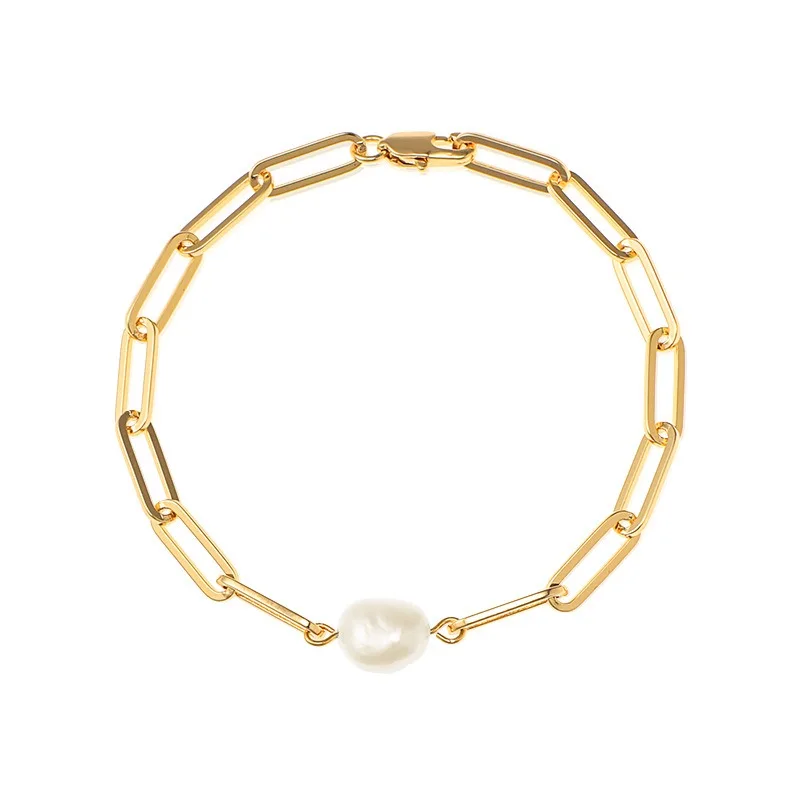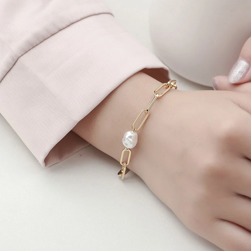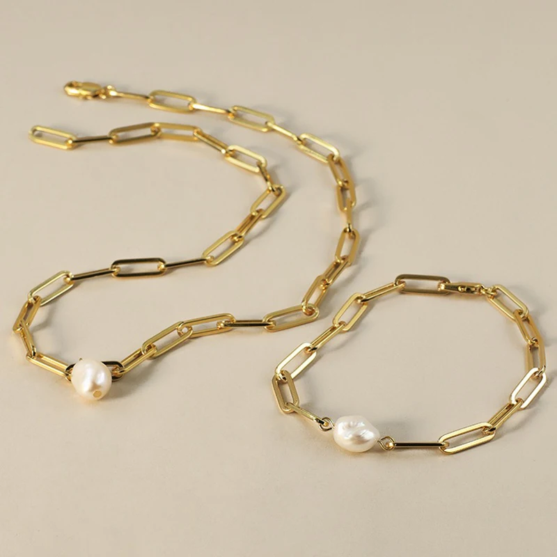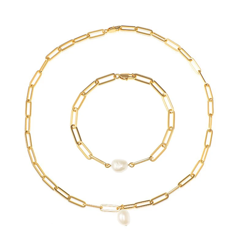 Women Gold Plated Link Chains Necklace Bracelet Jewelry Set Copper Toggle Pearl Bracelet