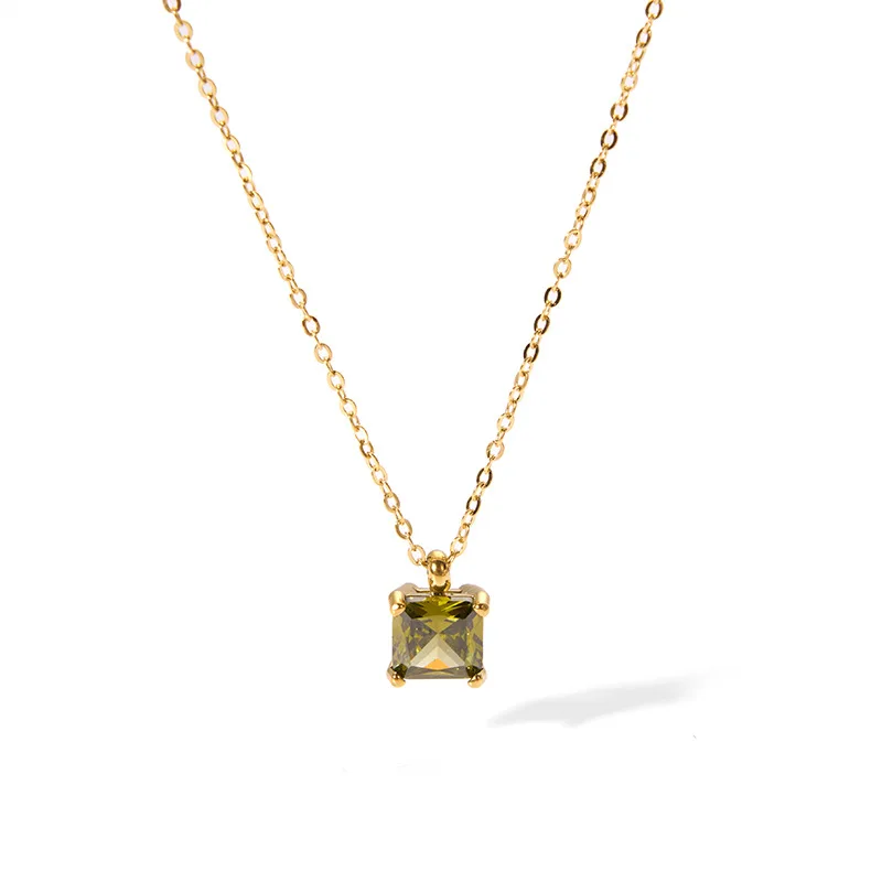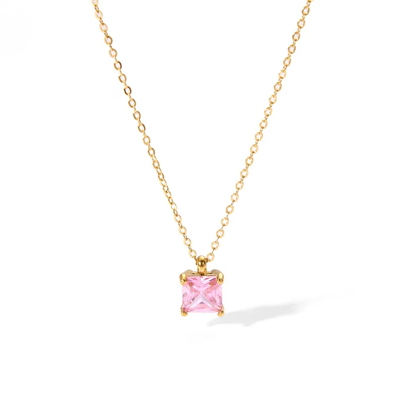 18K Gold PVD Stainless Steel Waterproof Necklace Link Chain Cute Style Square Zircon Pendant featuring Diamond Cubic Zirconia