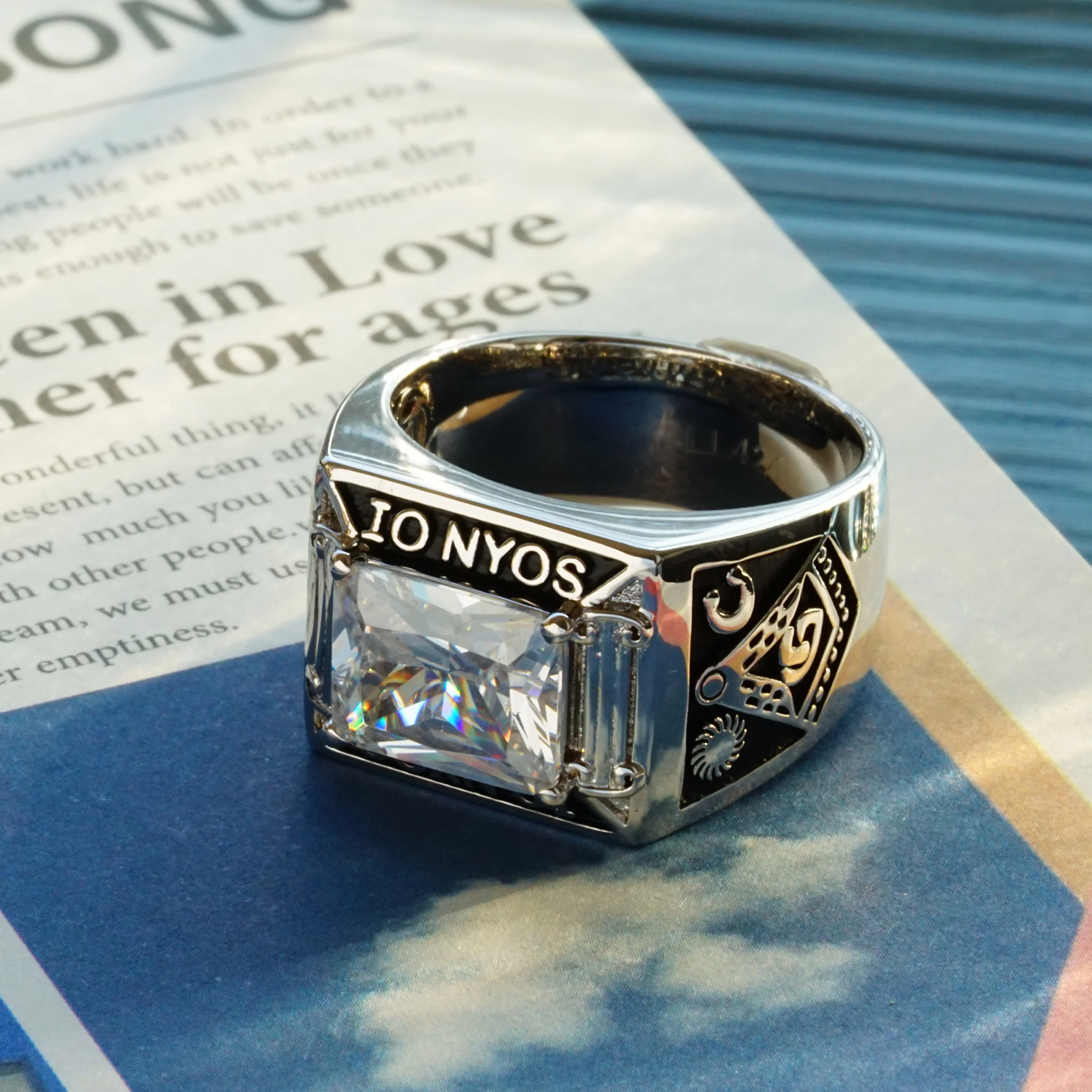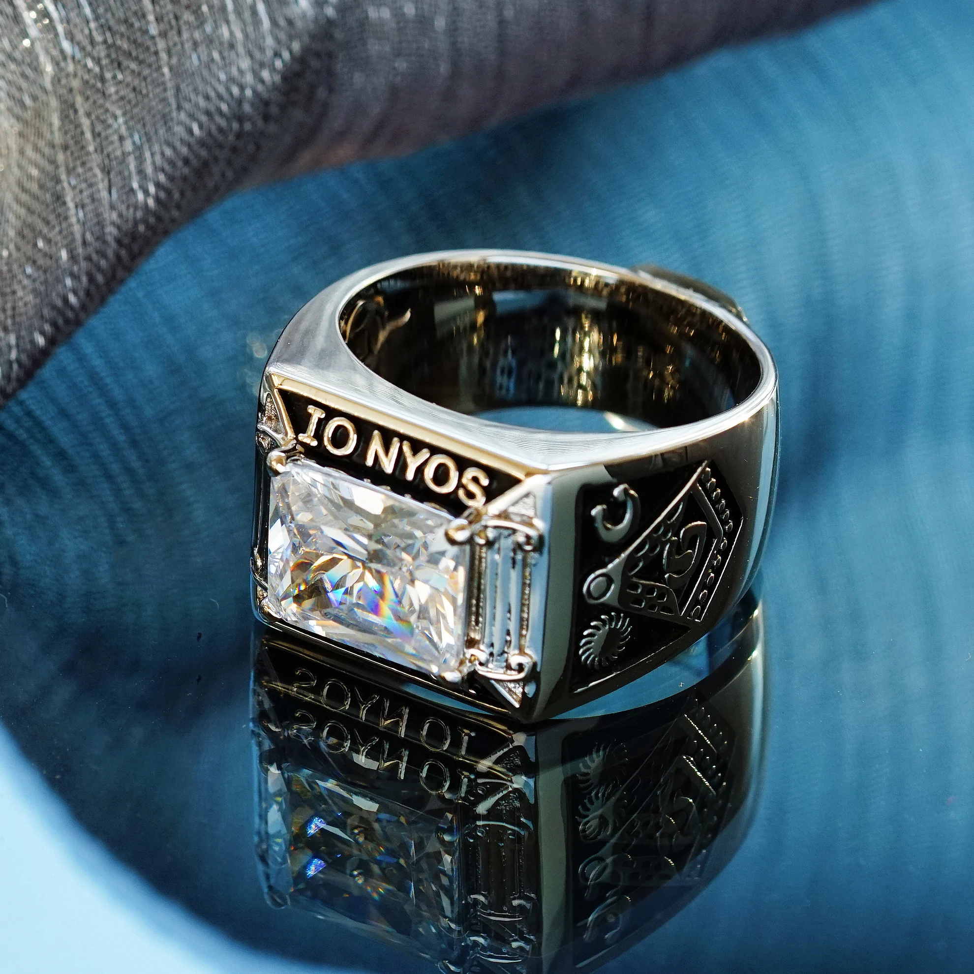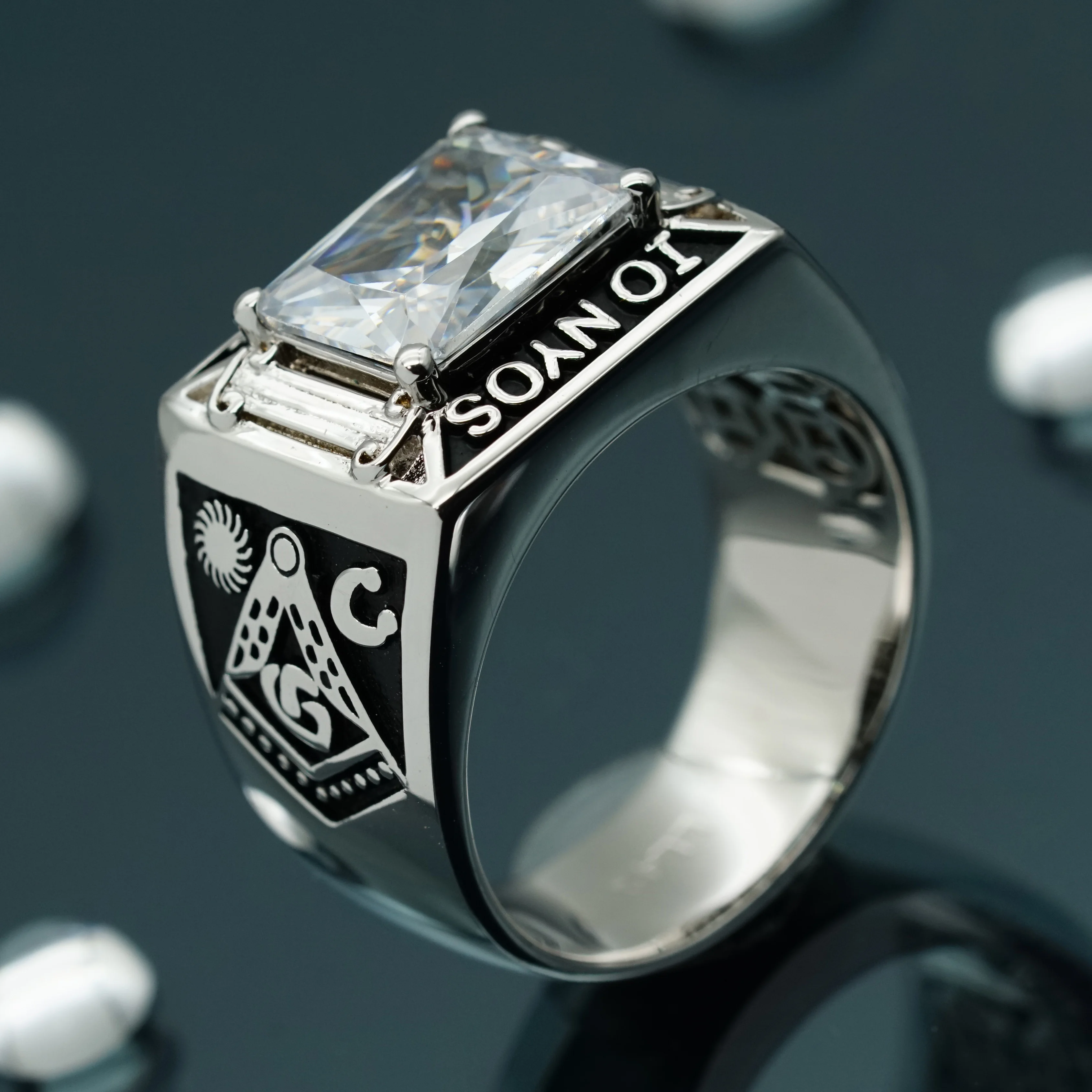 White Gold Vintage Lab-grown Gemstone Freemason Masonry Men Ring Jewelry Masonic Stone Signet Ring for Men