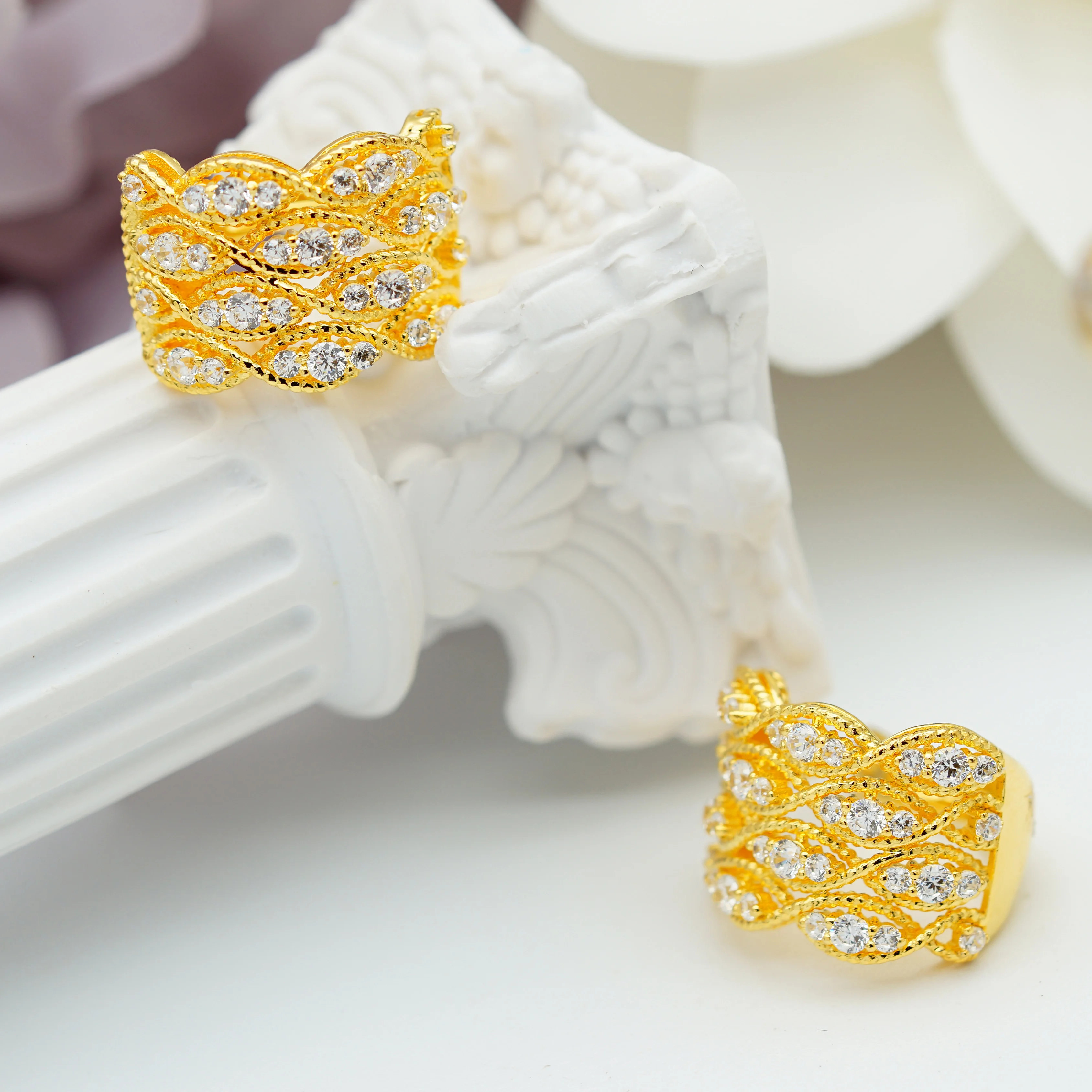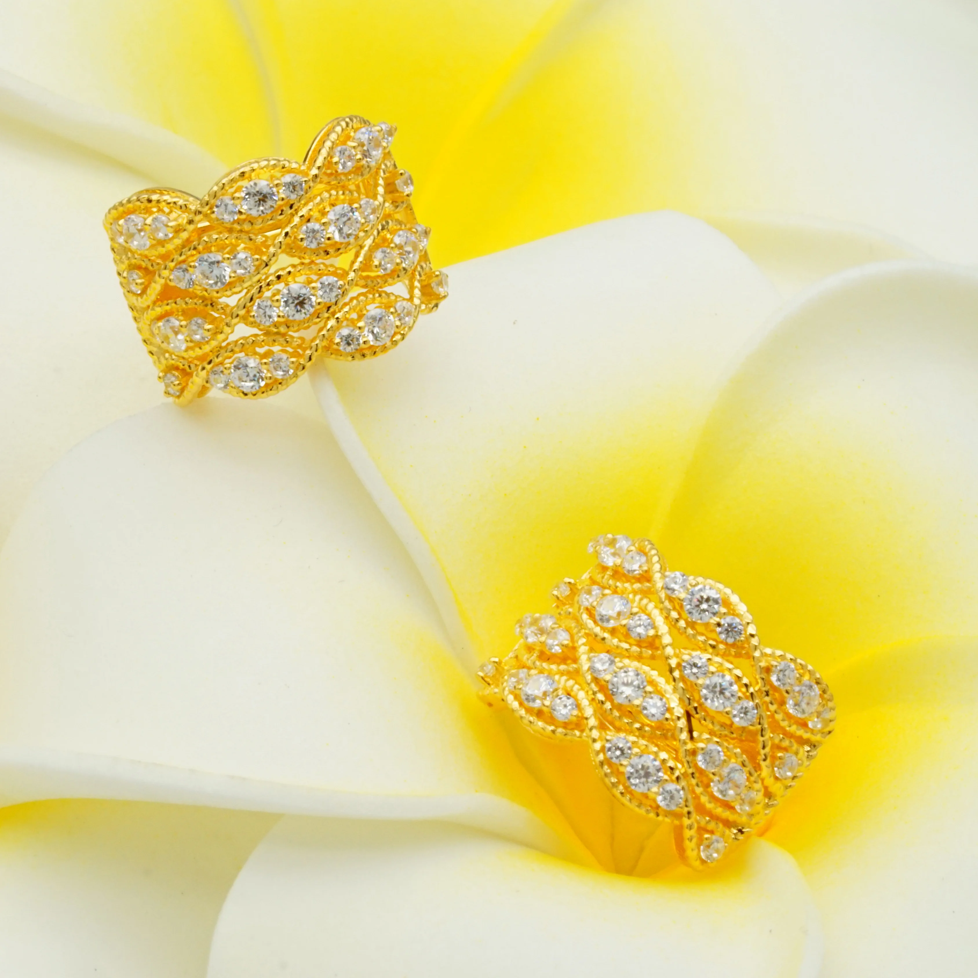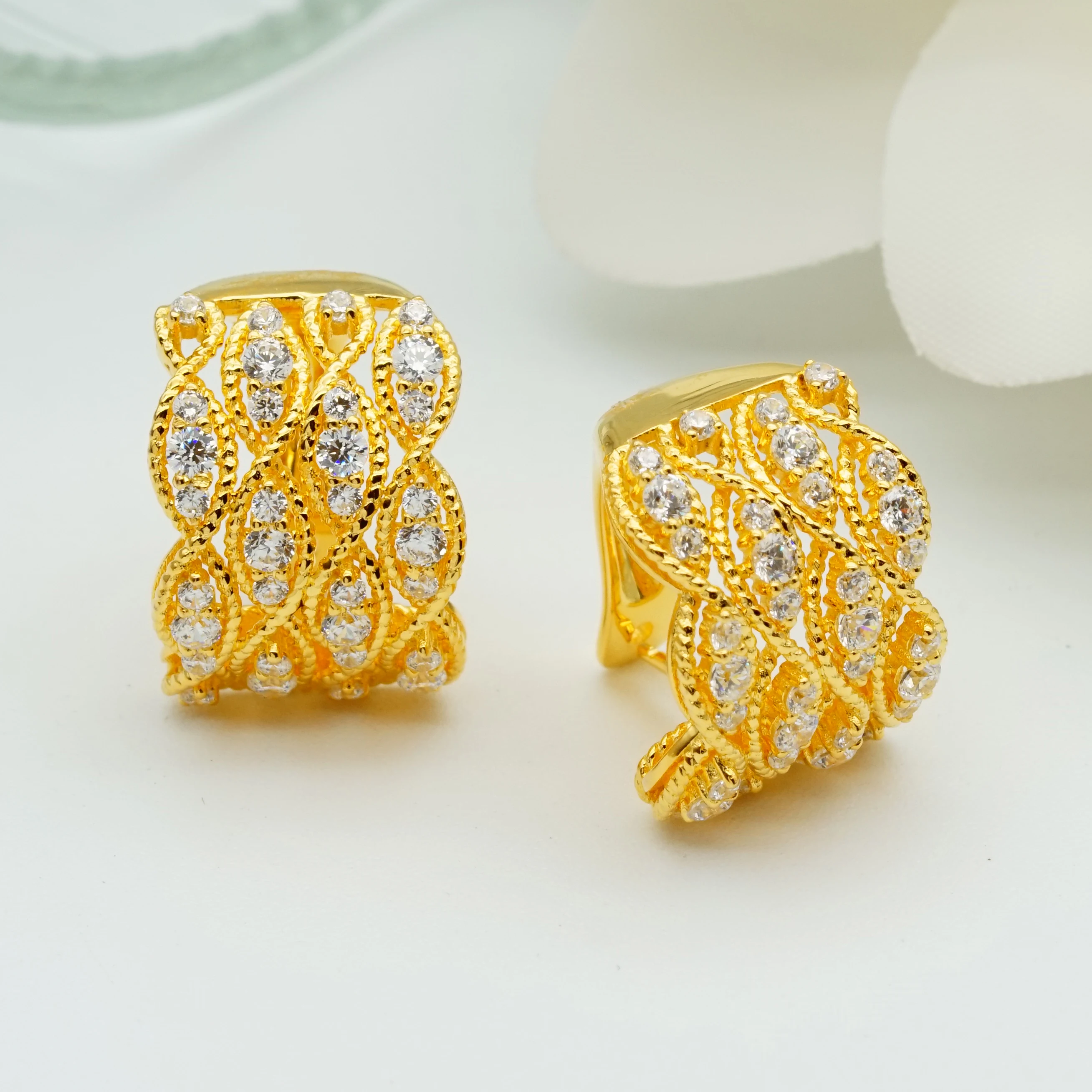 2026 Elegant Retro Style 9K Gold Woven Lace Earring with Diamond Inlay Carving Hollow Pattern