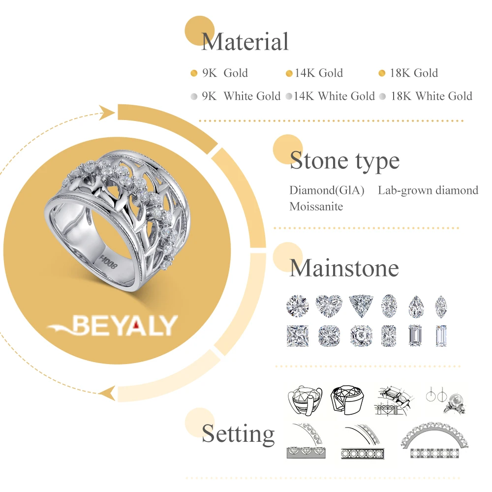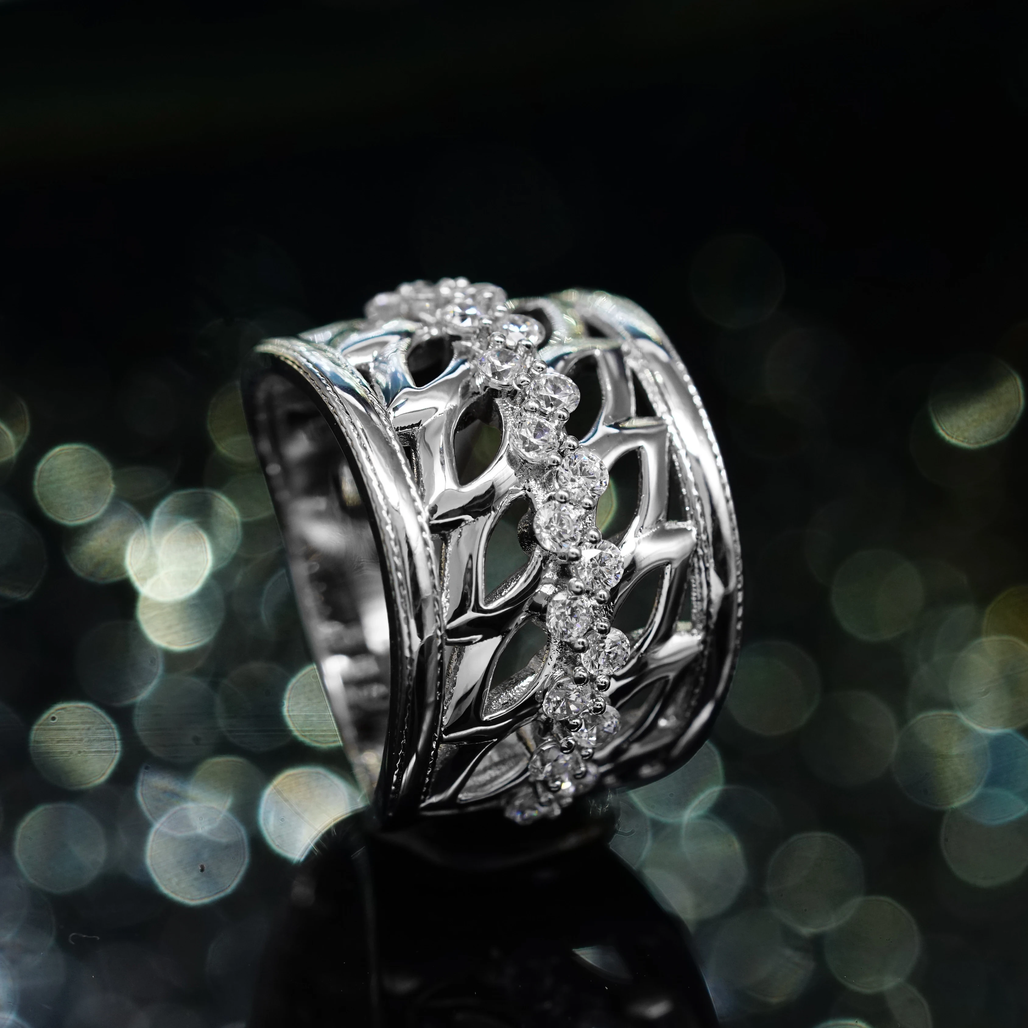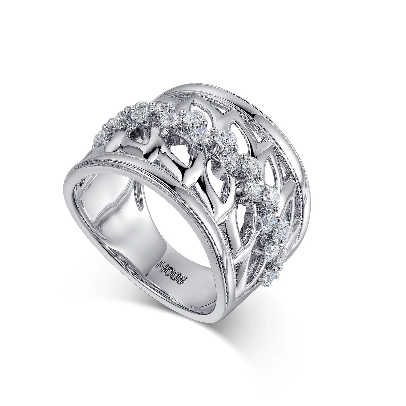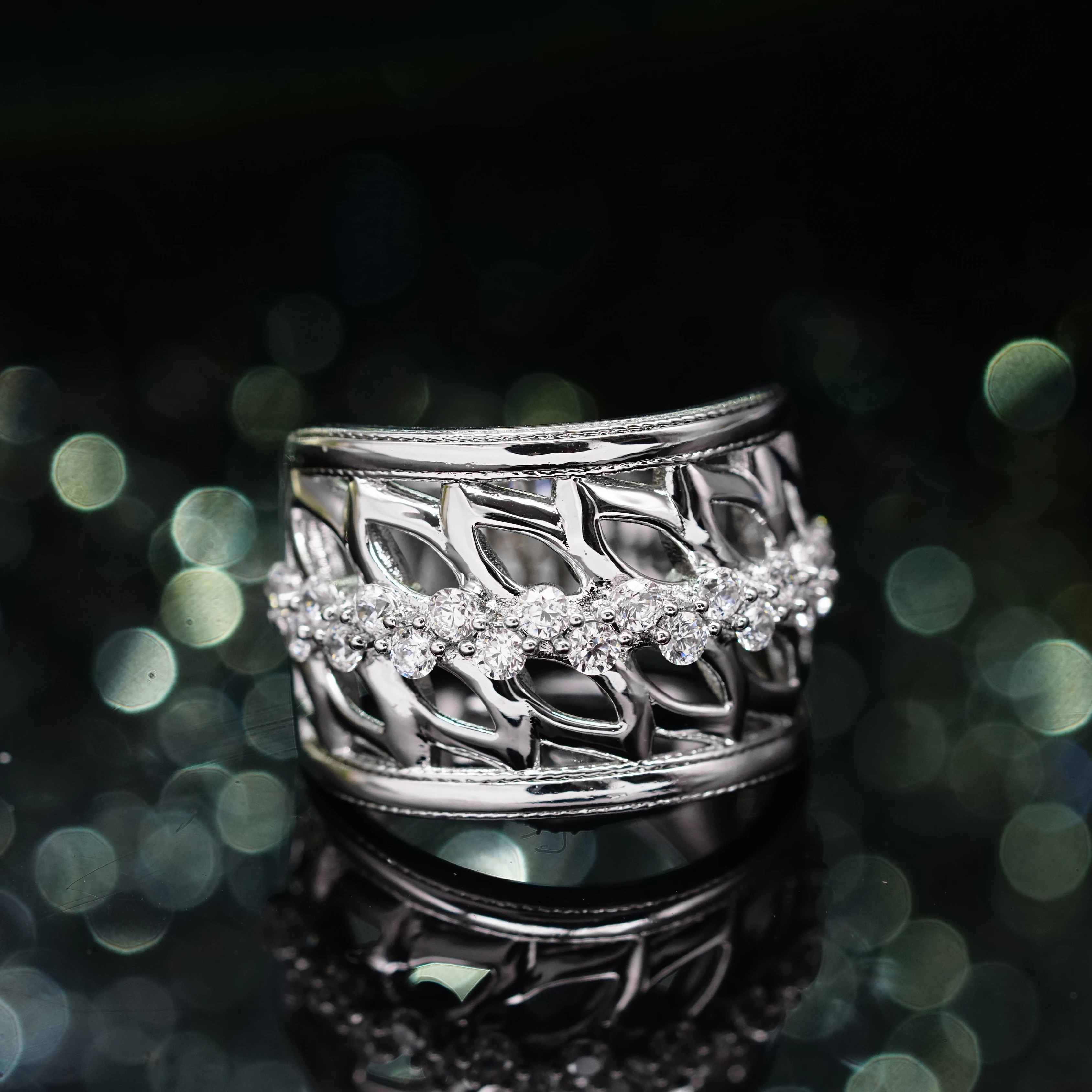 Original Design Women's 9k White Gold Gorgeous Sparkling Diamond Leaf Shape Wide Band Ring Trendy Style for Parties Weddings