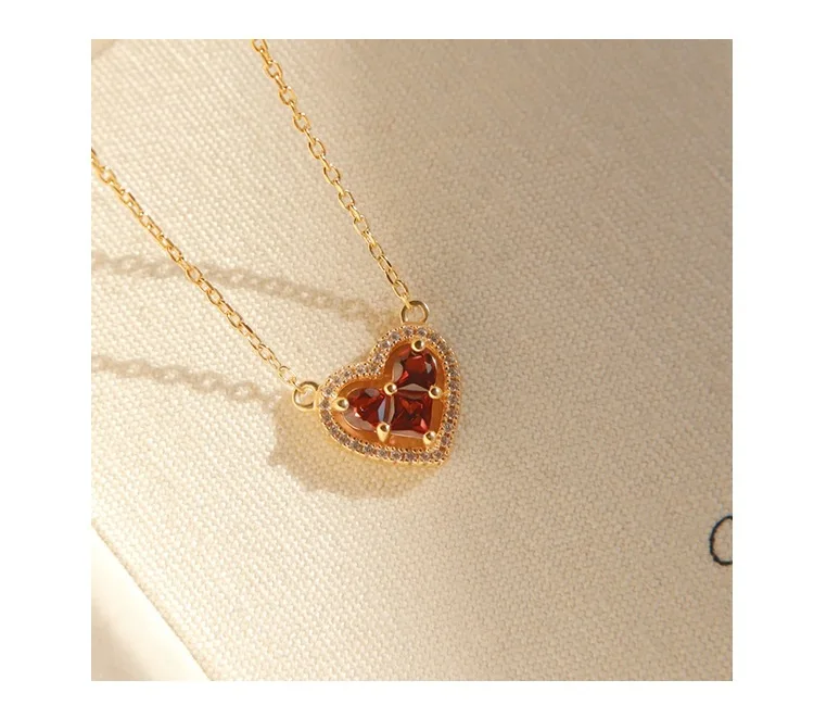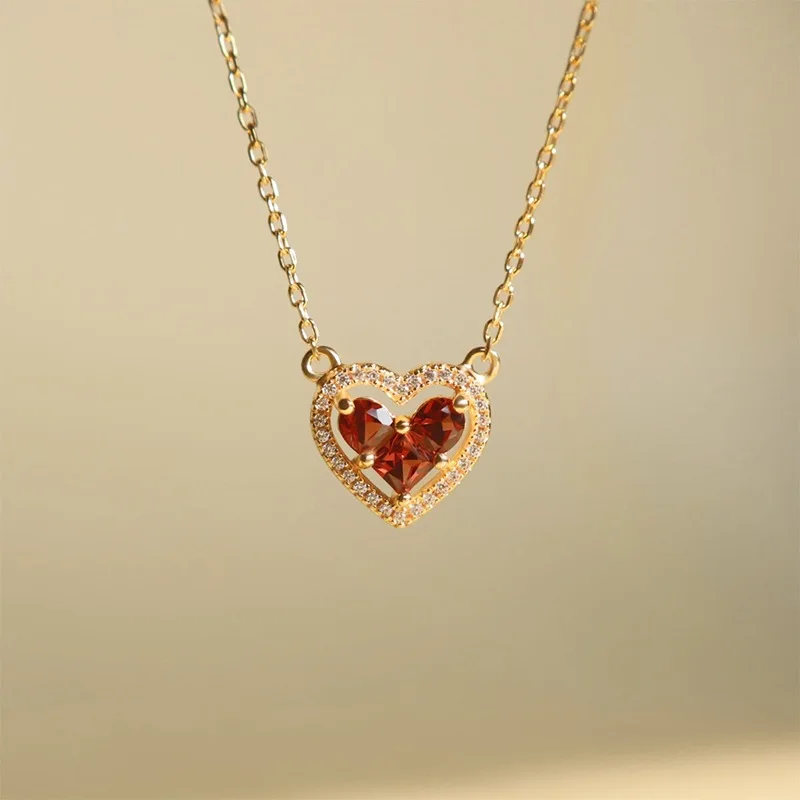 S925 18K Gold Plated Heart-shaped Pomegranate Red Zircon Pendant Necklace, a Luxurious and Niche Women's Jewelry