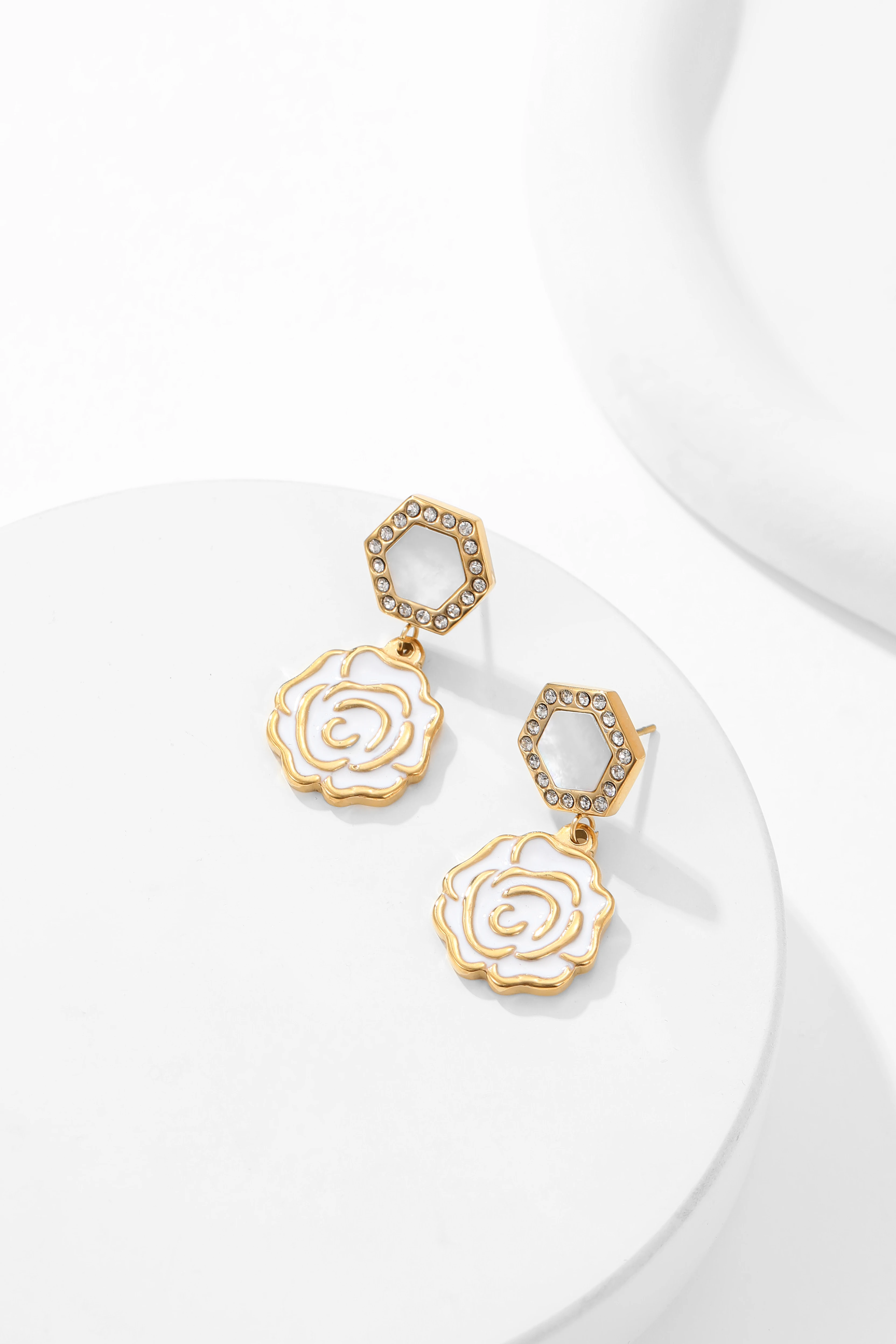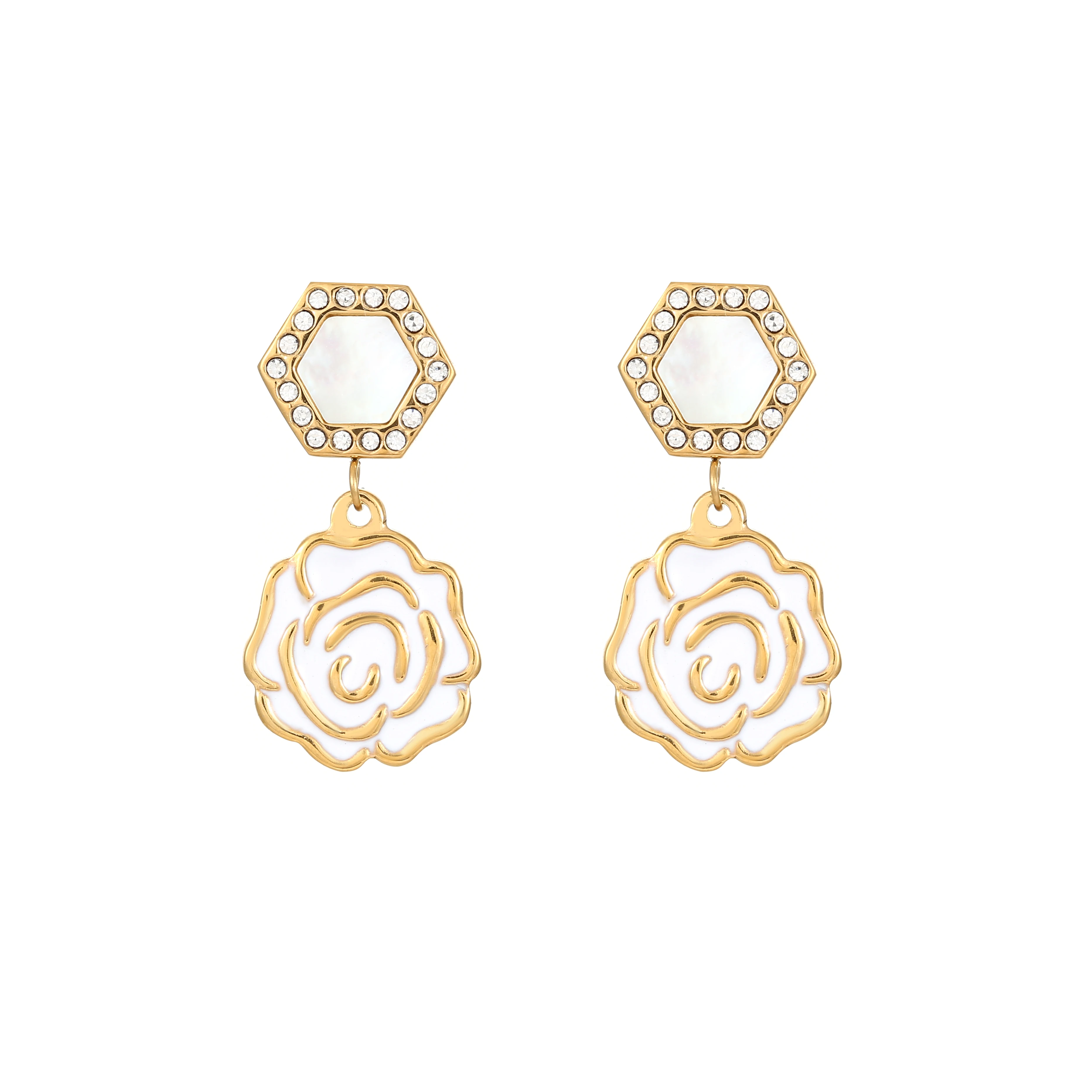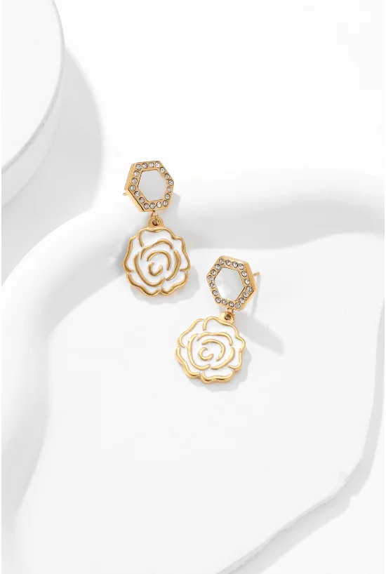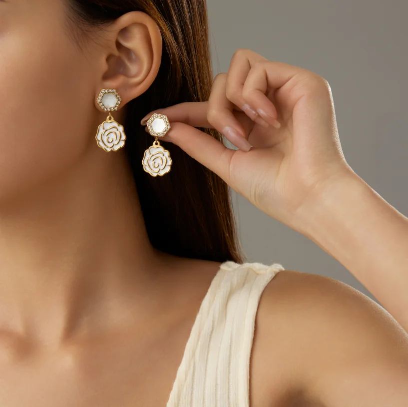 French Romantic Vintage Earrings Elegant Camellia Pearl & Zircon with Diamond Stainless Steel Flower Shape Stylish for Women