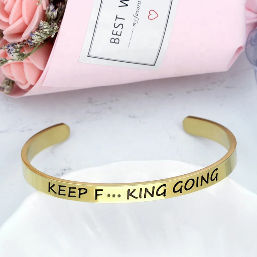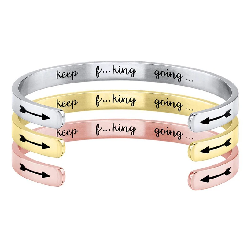 Loftily Jewelry Keep Going Fashion Design Stainless Steel Engraved Message Cuff Inspirational 18k Bangle Bracelets for Men Women