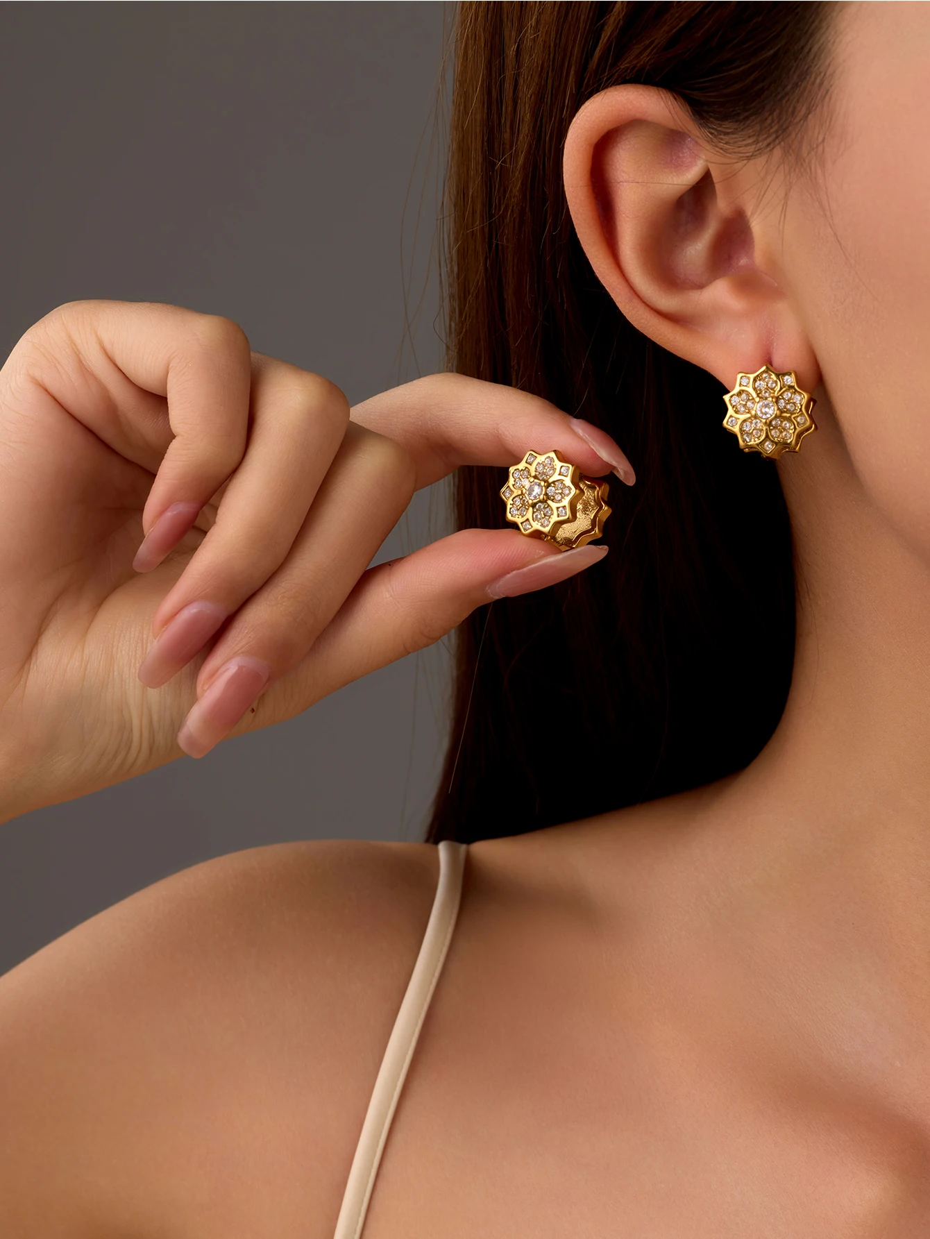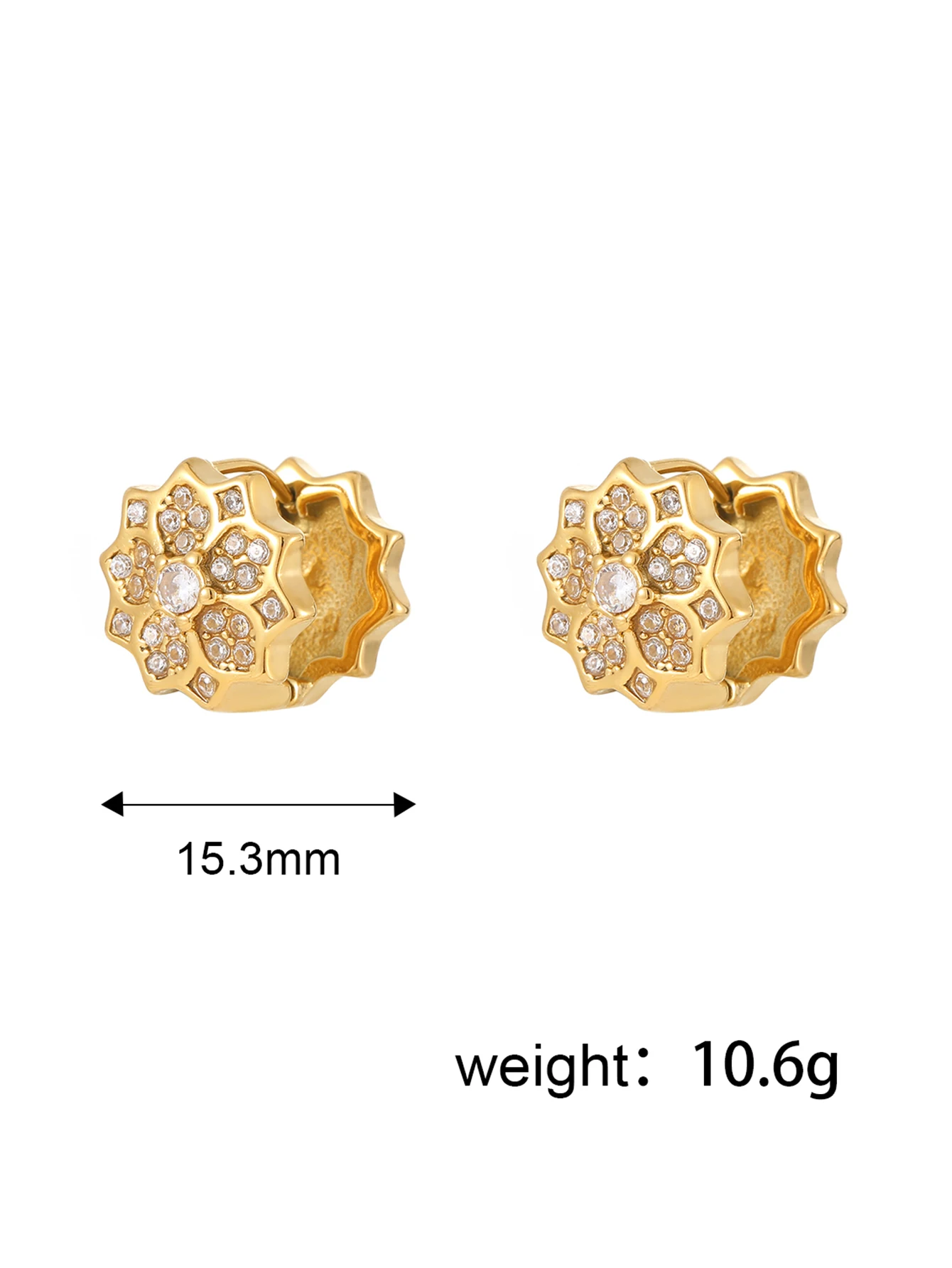 Women Fashion Tarnish Free Double Side Full Diamond Flower Peach Earrings 18K Gold Plated Stainless Steel Zircon Earring