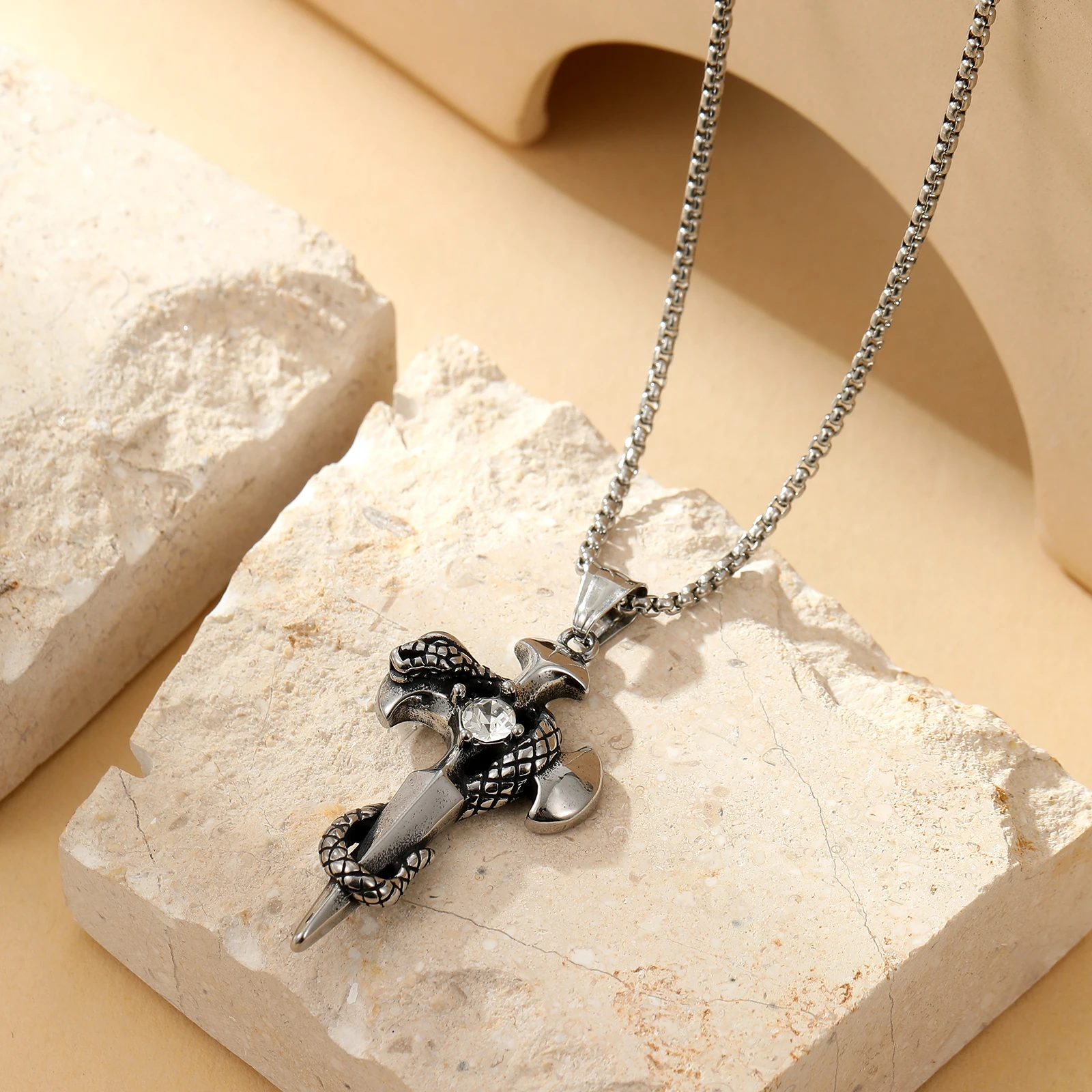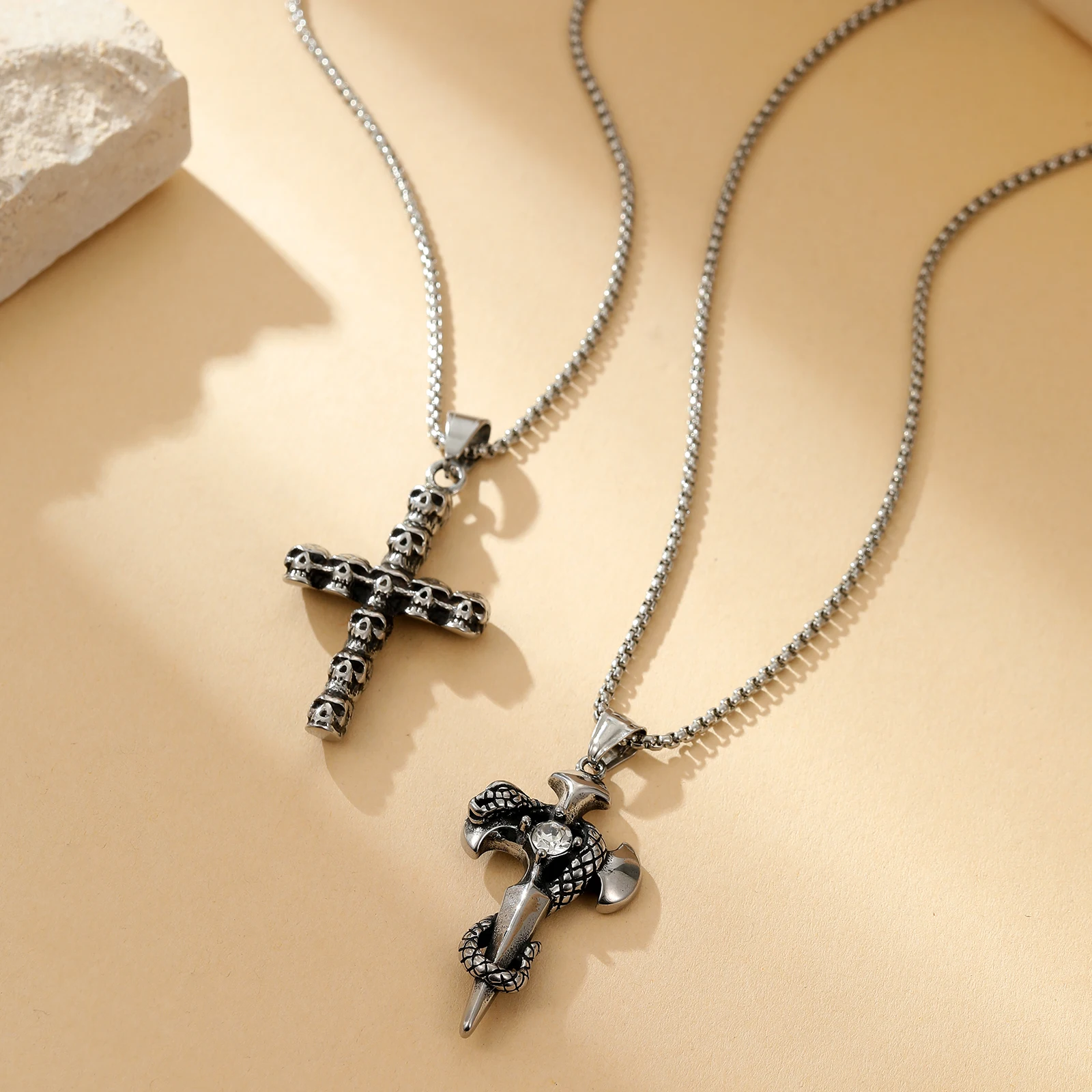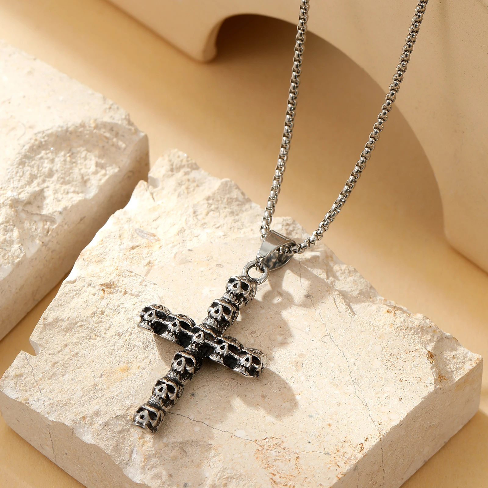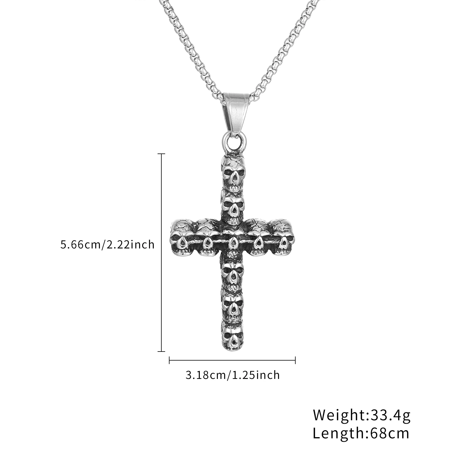 Men's Long Stainless Steel Non-fading Cross Necklace Hip Hop Skull Head Pendant Punk Fashion Sweater Chain