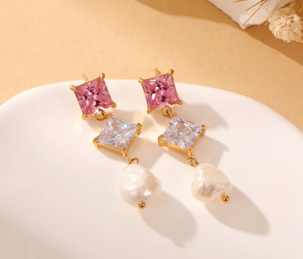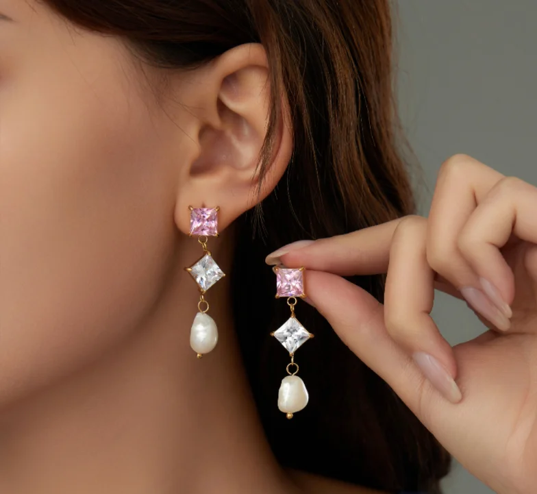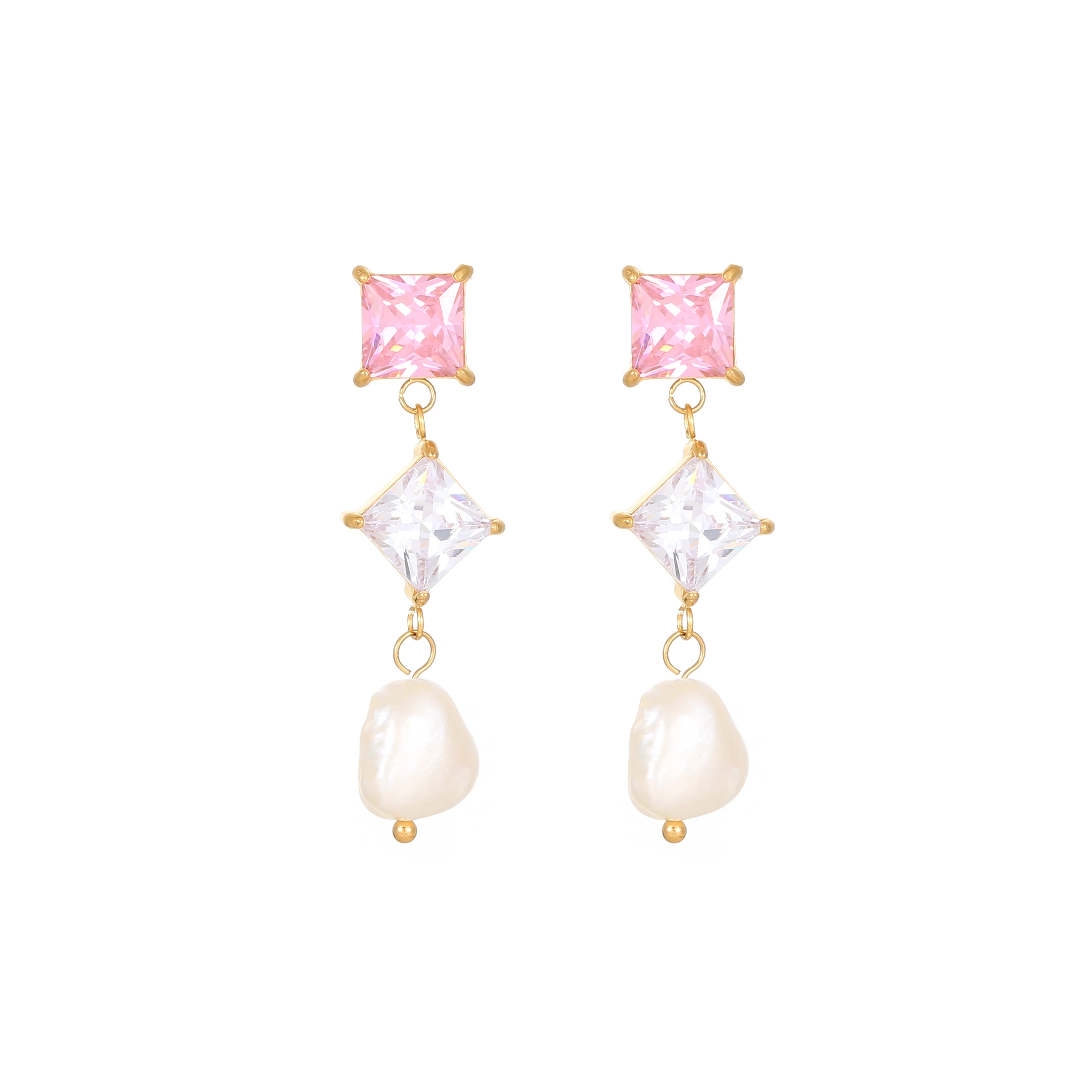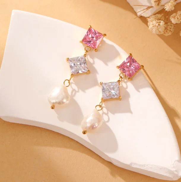 Ready to Ship Trendy Gold Plated Waterproof Stainless Steel Colorful Zircons Freshwater Pearls Stud Earrings