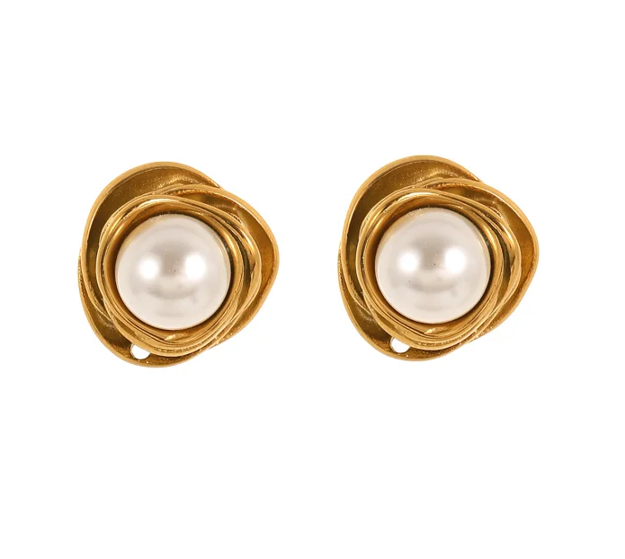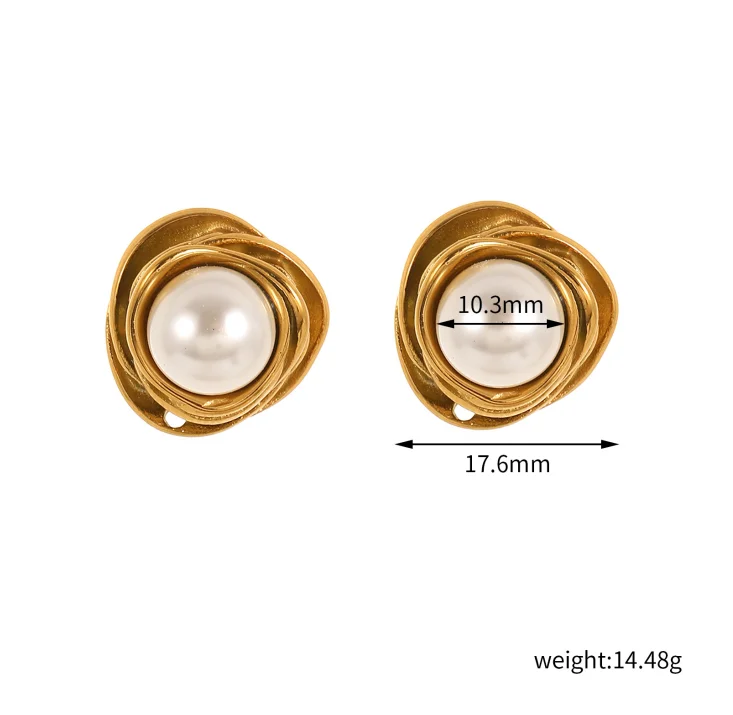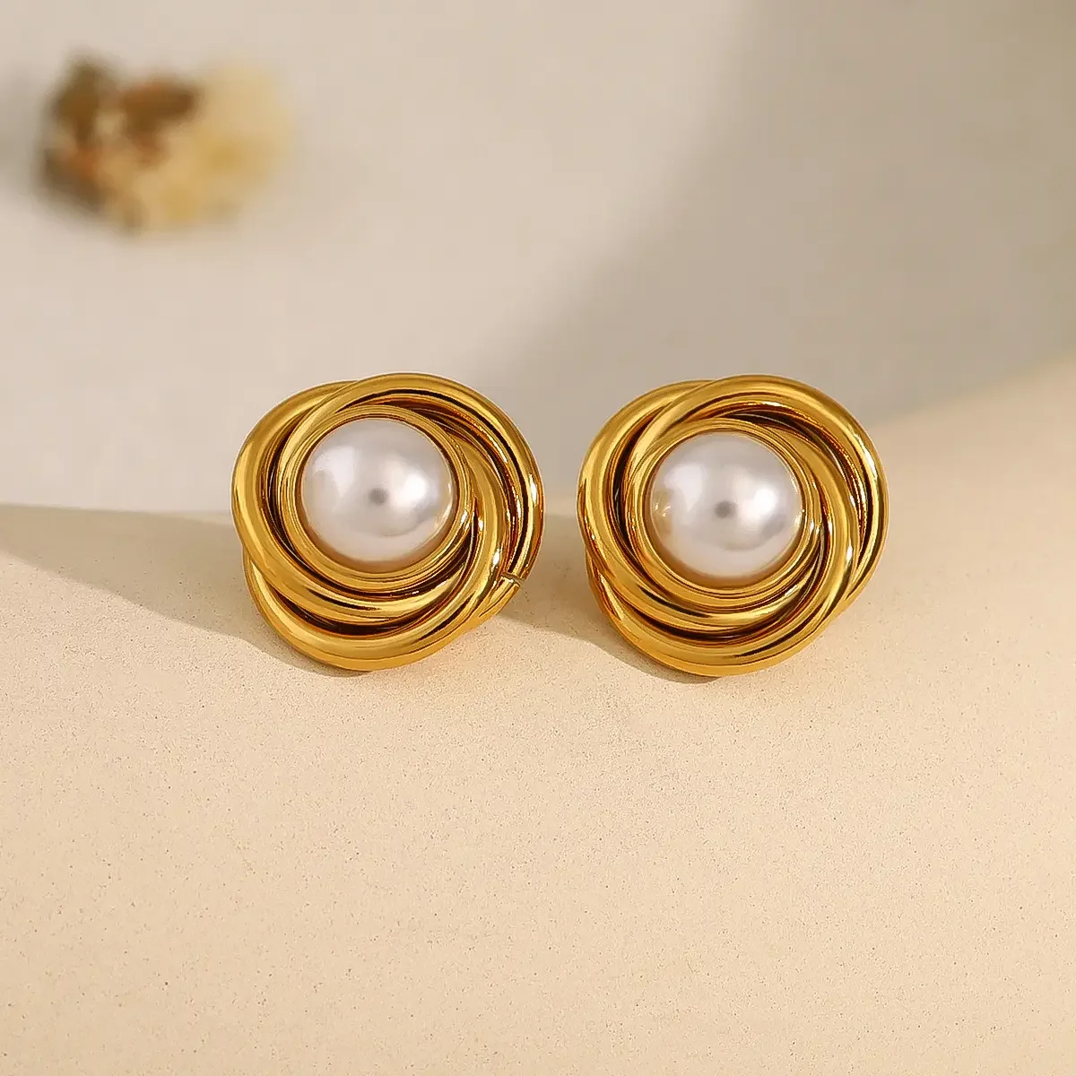 Loftily Pearl Stud Earrings French Vintage Trendy 18K Gold Plated Spiral Round Bead Stainless Steel