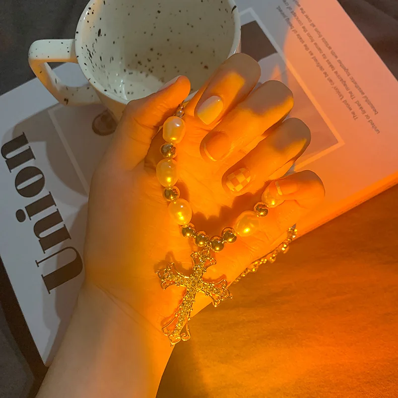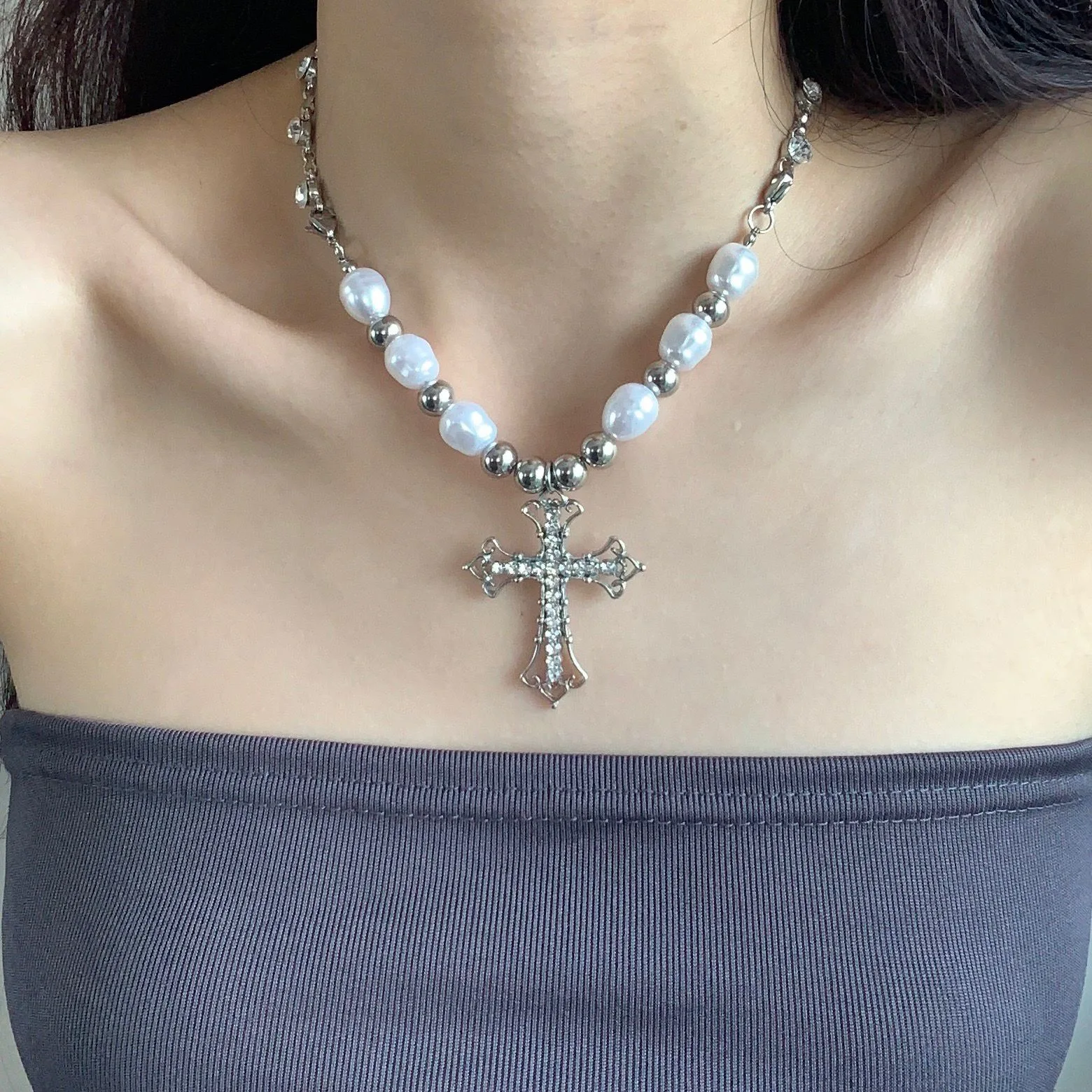 Vintage Punk Cool Titanium Cross Imitation Pearl Pendant Hip Hop Necklace Silver Plated Classic Gift for Men and Women