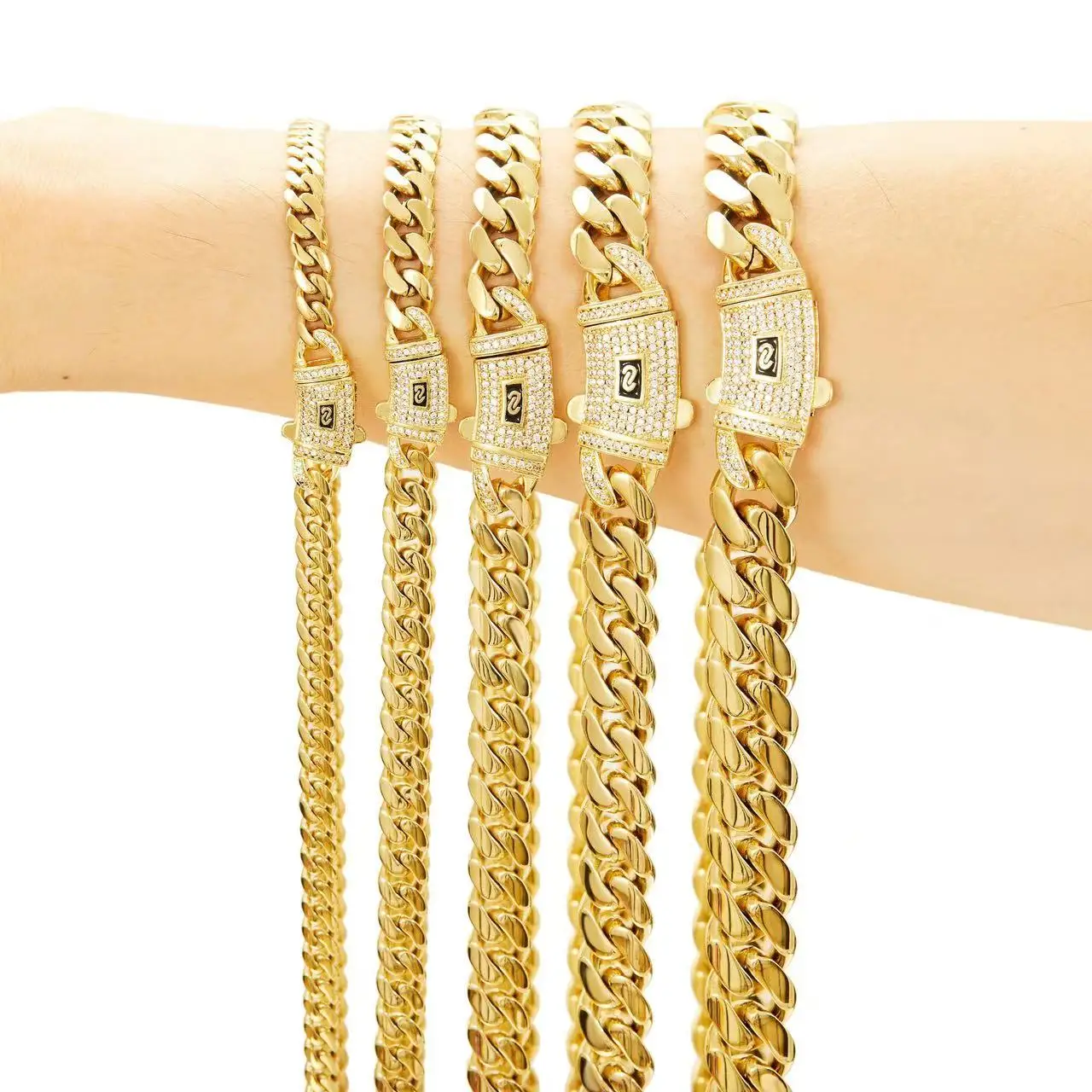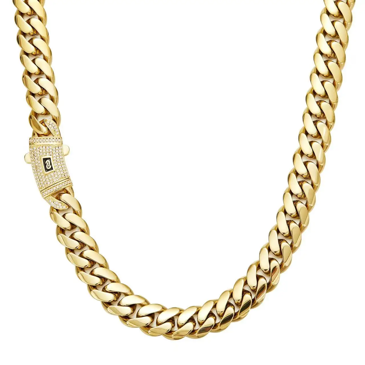 Miami Cuban Link Chain Necklace Bracelet Set 14K Gold Plated Stainless Steel Zircon Hip Hop for Men