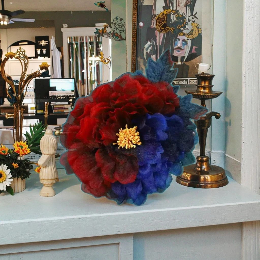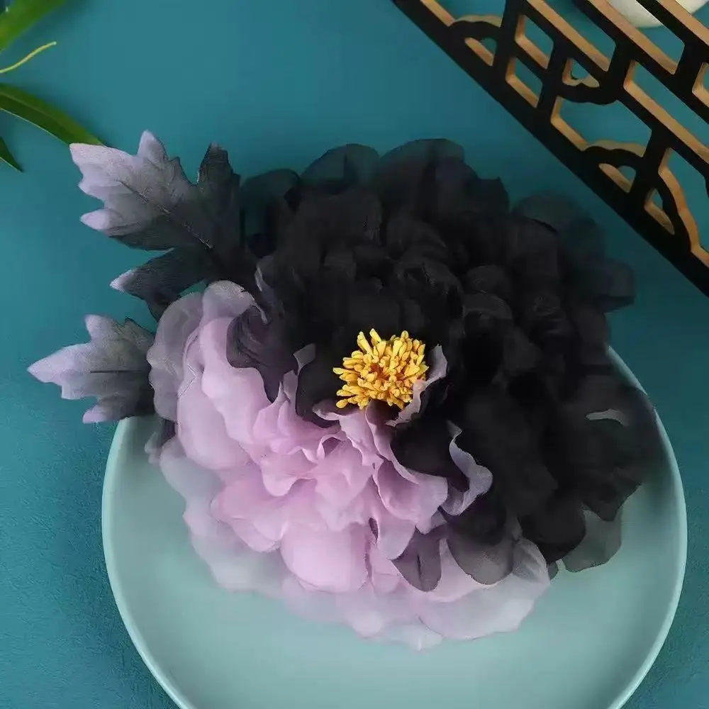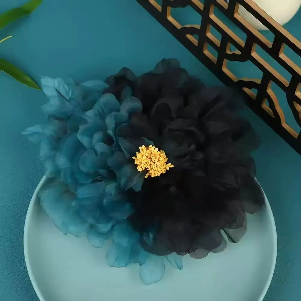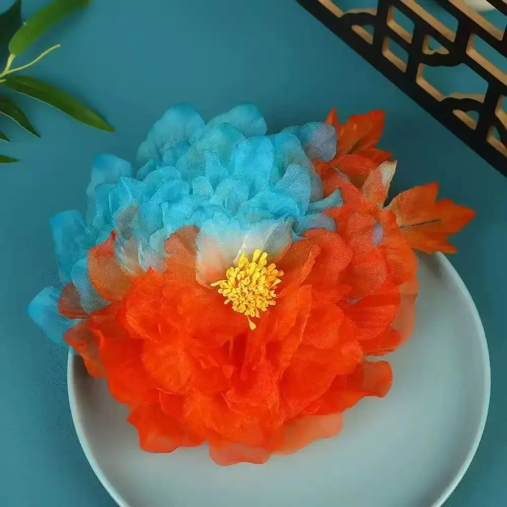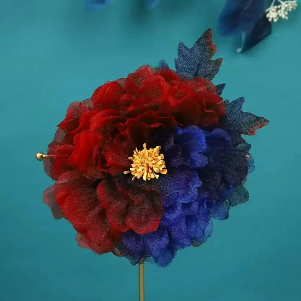 Designer Handcrafted Large Red and Blue Color-blocked Peony Hair Clip, Bridal Makeup Accessory, Perforated Hanfu Hair Accessory