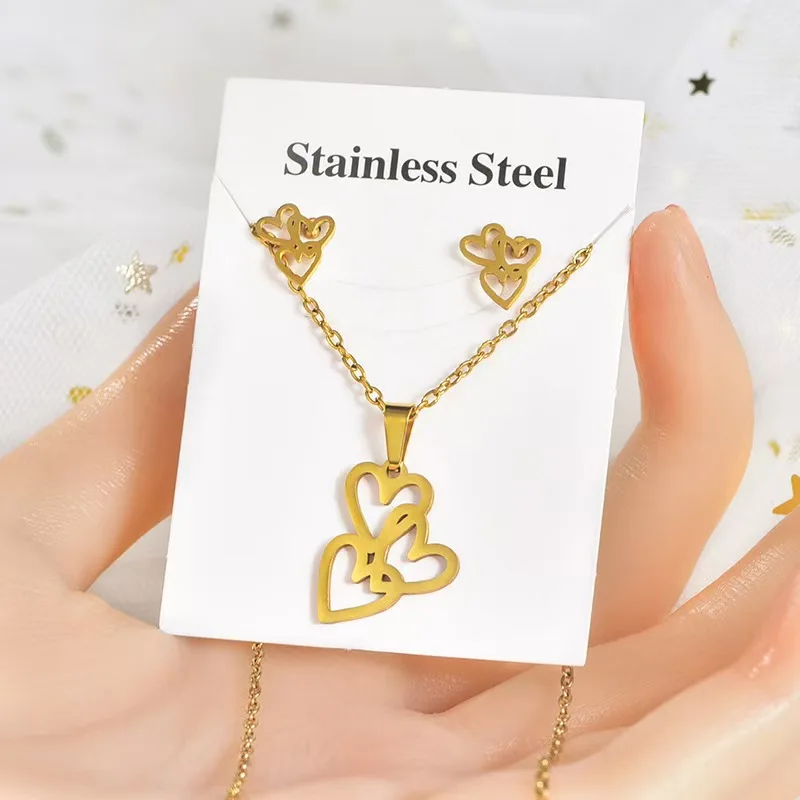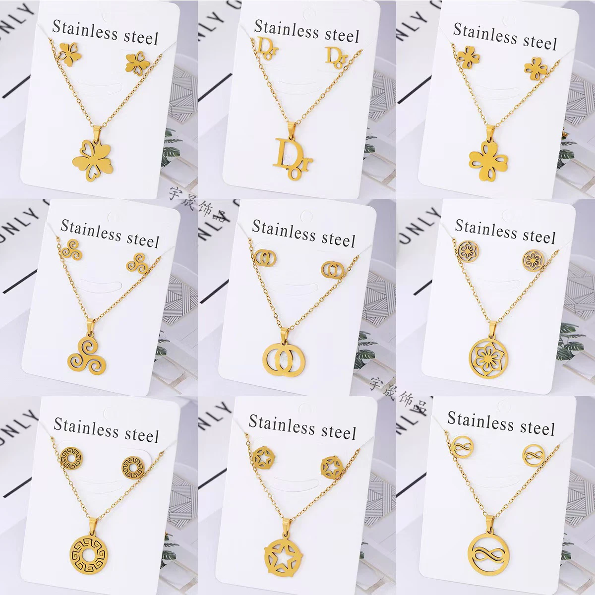 Designer 18K Gold Plated Stainless Steel Women's Trendy Earrings Necklace Set Link Chain Retro Geometric Heart Star Moon Design