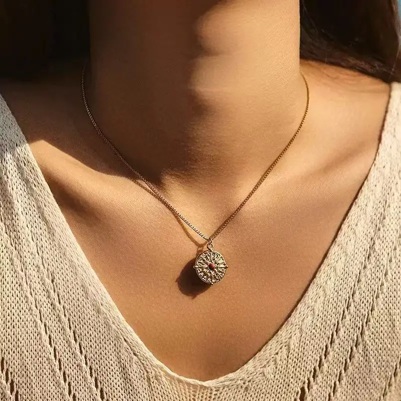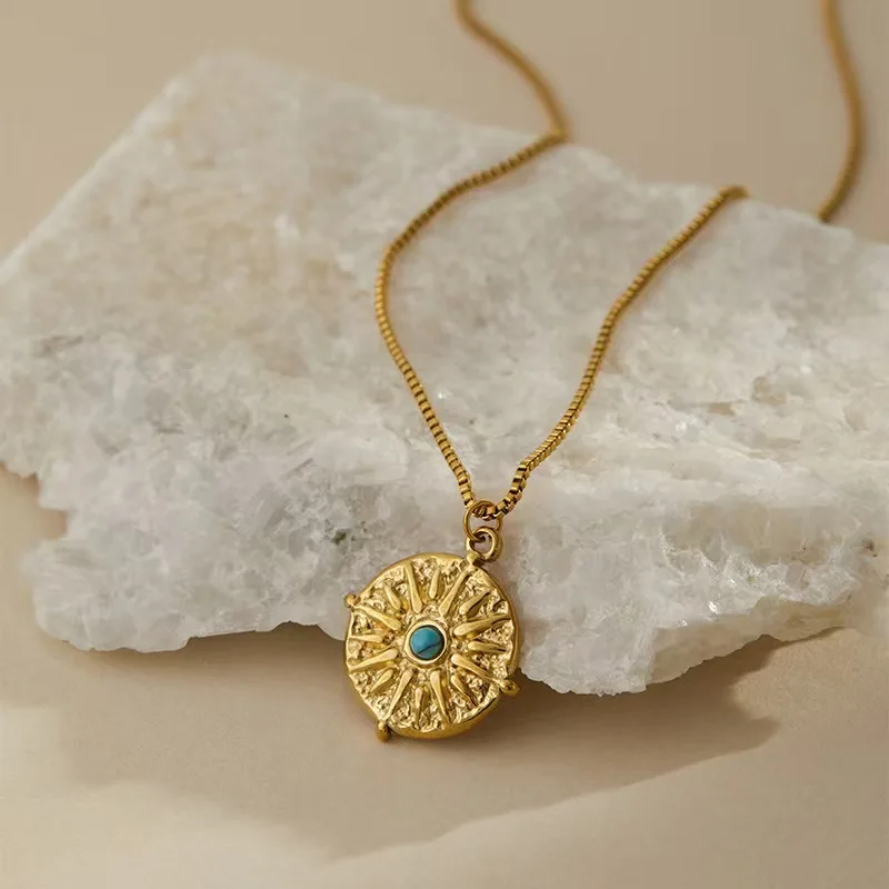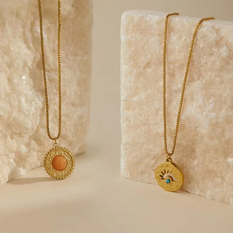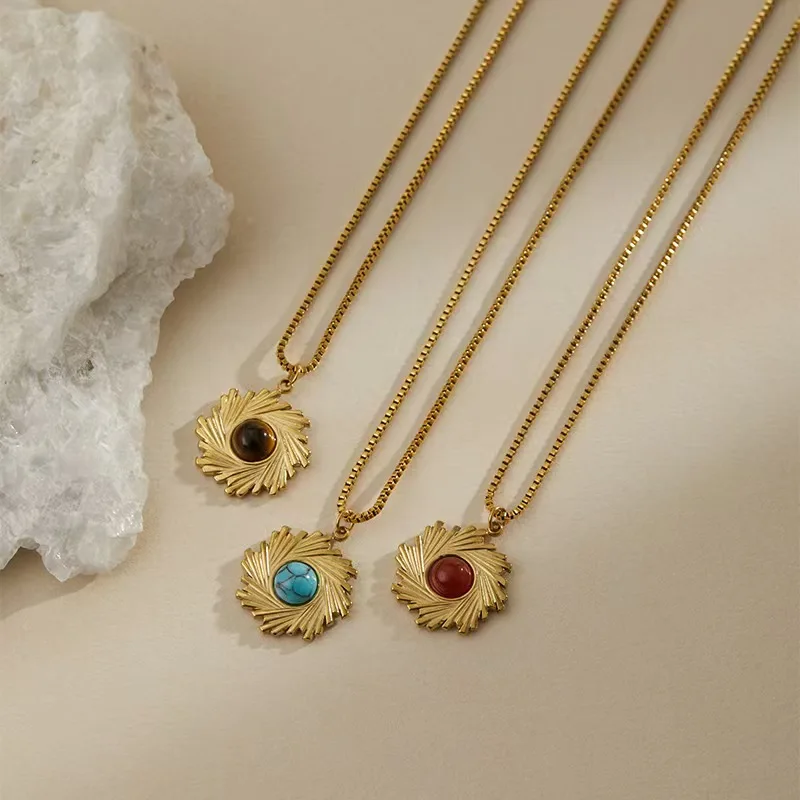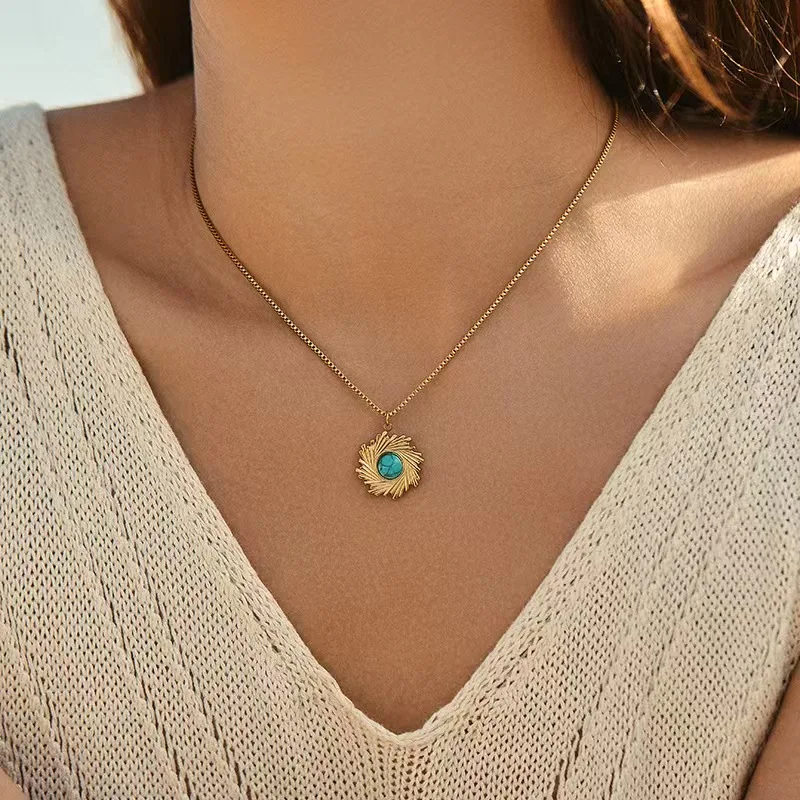 Trendy Bohemia Women's 18K Gold Plated Stainless Steel Necklace Turquoise Sun Eye Pendant Natural Stone Waterproof Box Chain