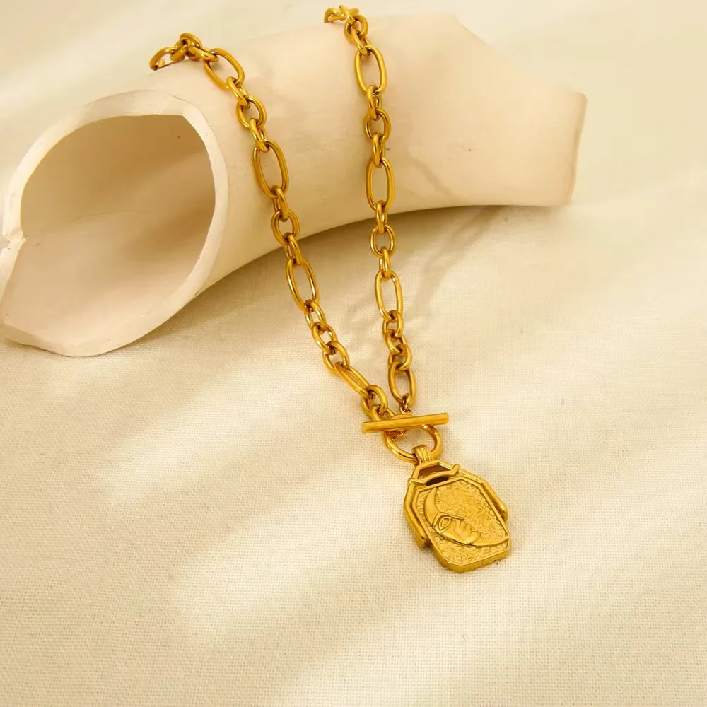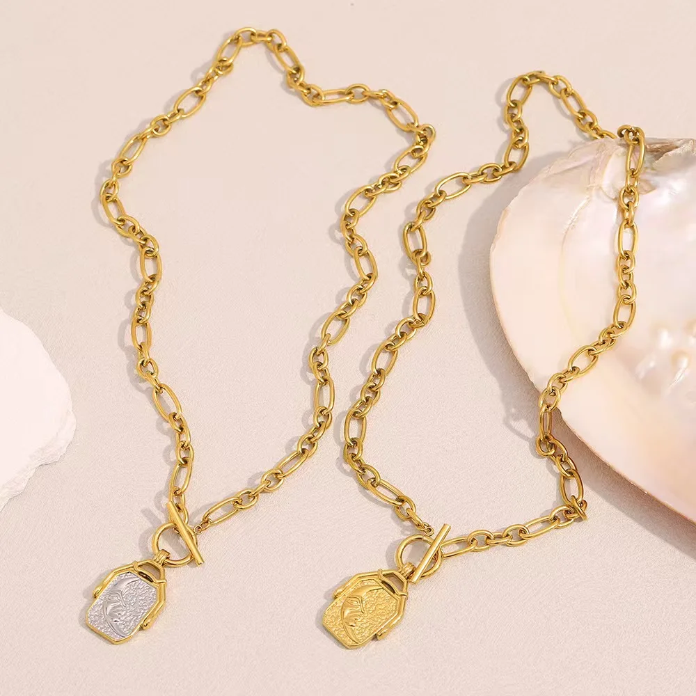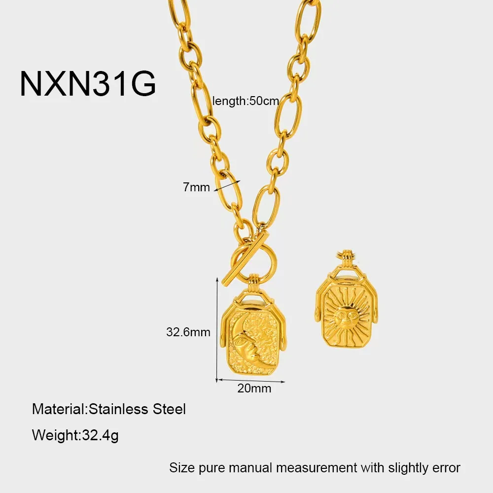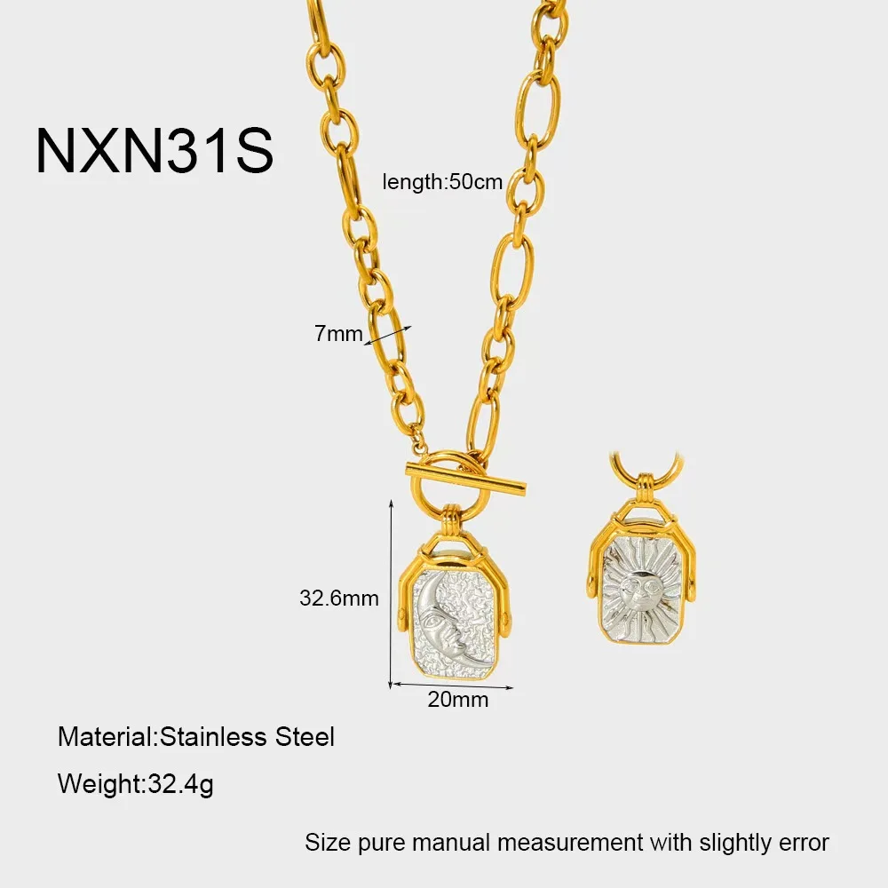 Women's Trendy 18K Gold Plated Stainless Steel Moon Square Pendant Necklace Geometric Link Chain Fashion Jewelry Gift N69