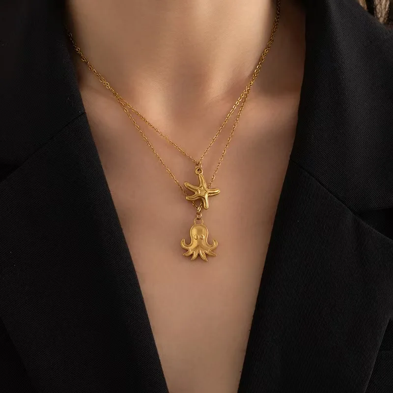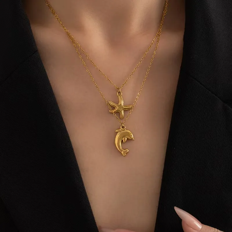 Wholesale 18K Gold Plated Stainless Steel Buddhism Link Chain Starfish Pendant Necklace Shell Shape Women's Trendy Jewelry