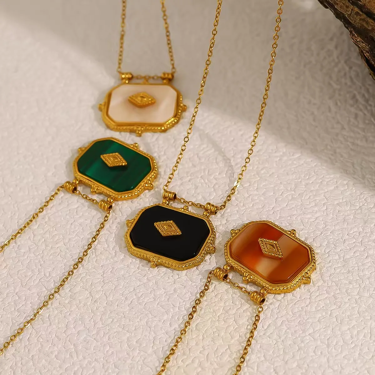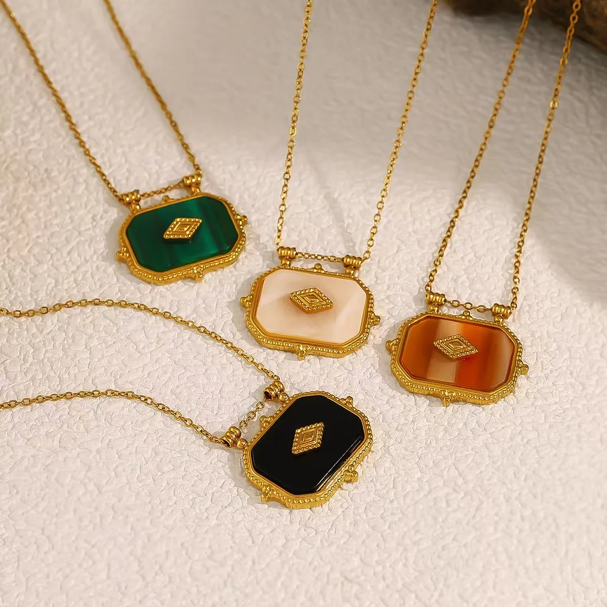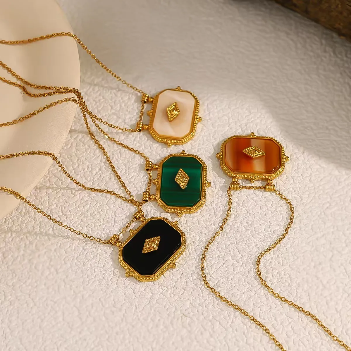 French Retro Style Trendy 18K Gold Plated Agate Geometric Pendant High-End Link Chain Stainless Steel Niche Design