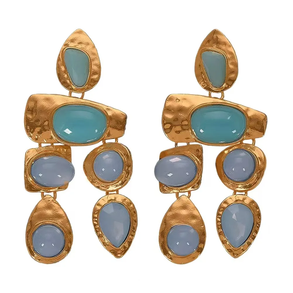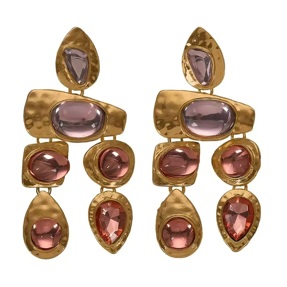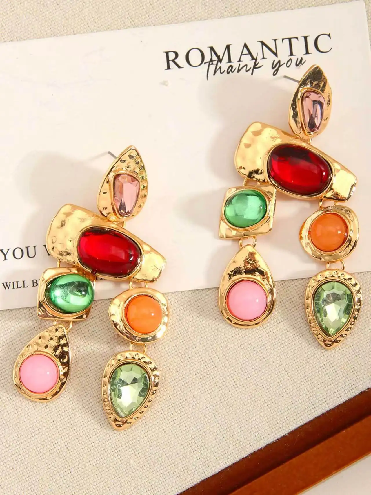 Women Vintage Geometric Stone Stud Drop Earrings Multi Colors Rhinestone Long Irregular Pendant Tassel Gold Plated Zinc Alloy