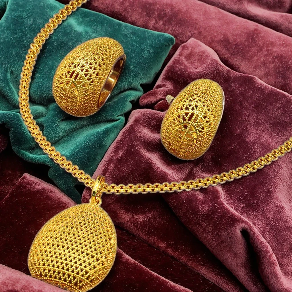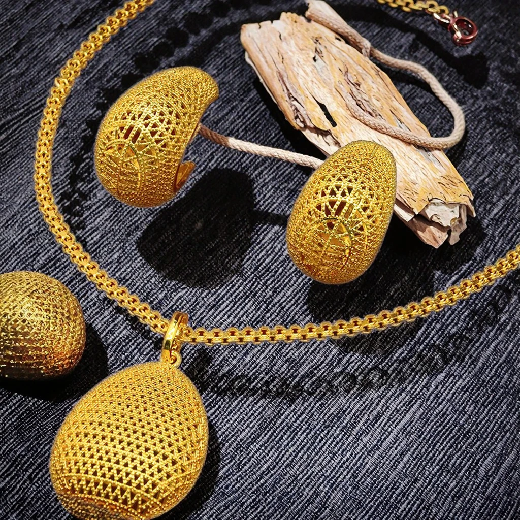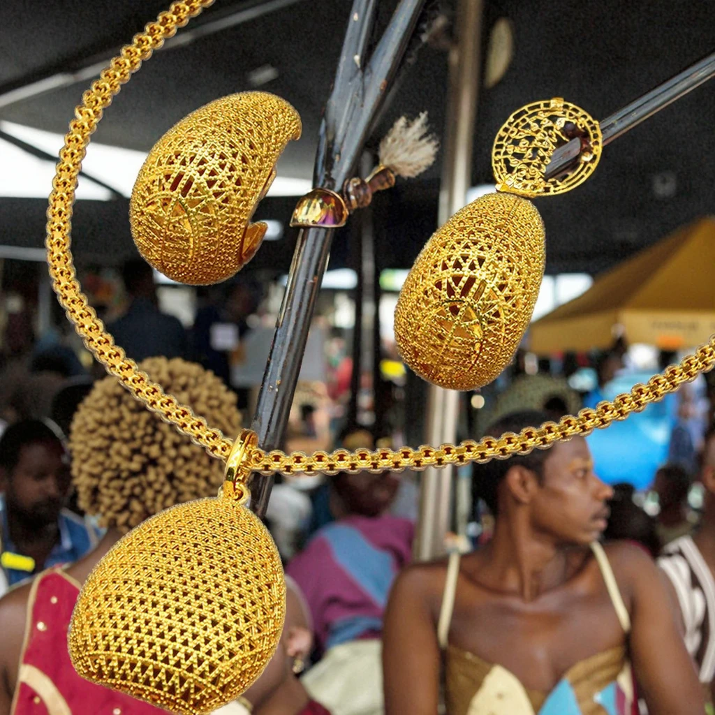 Luxury Ethiopian Traditional Brass Gold Plated 24K Fine Jewelry Bridal Necklace Earrings Set Wedding Party Gift African Charm