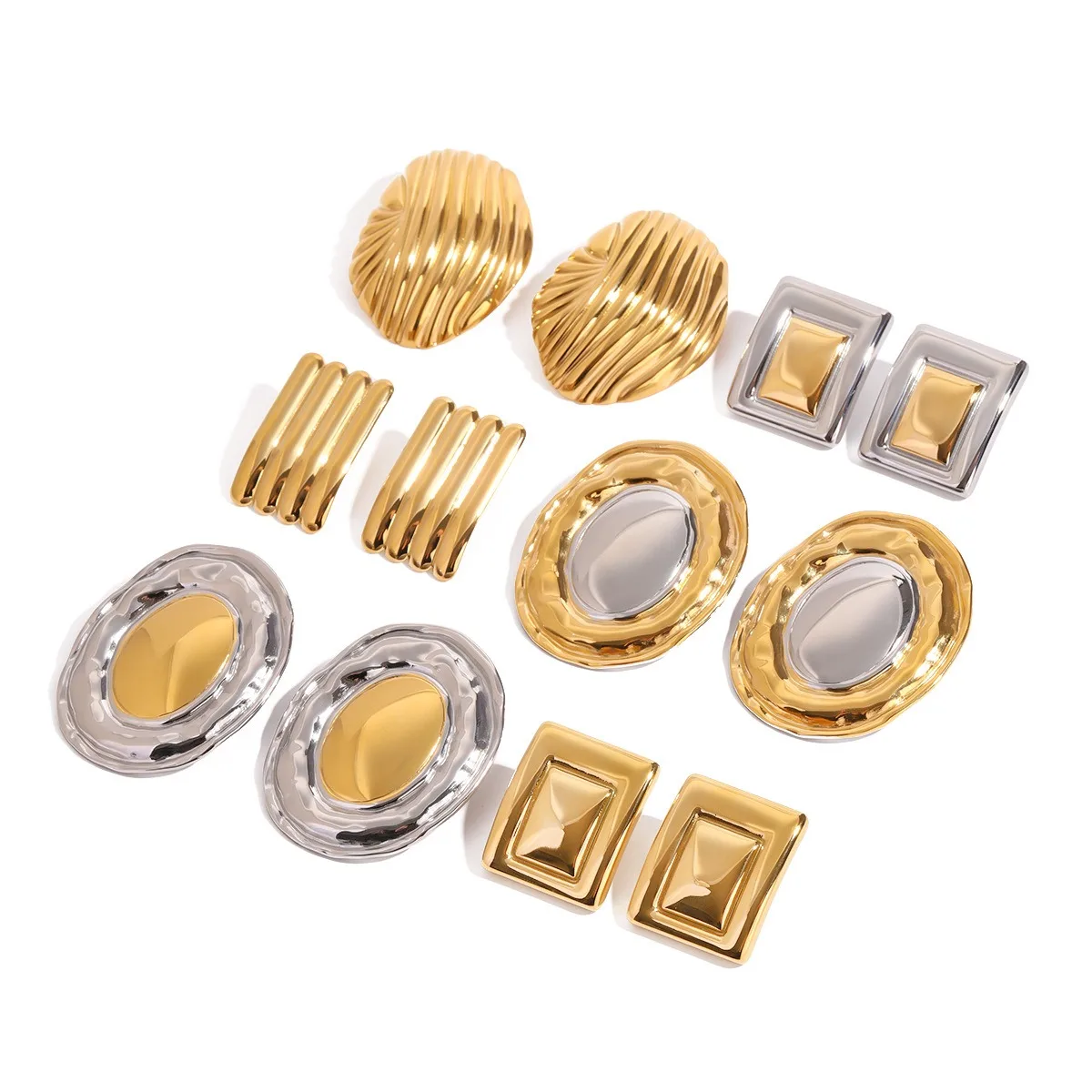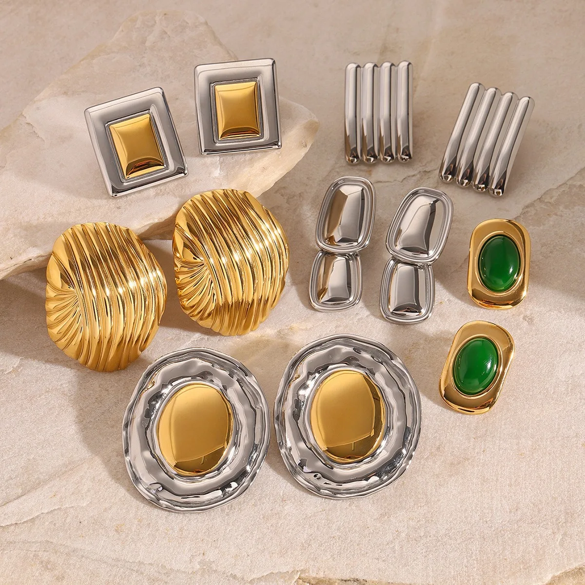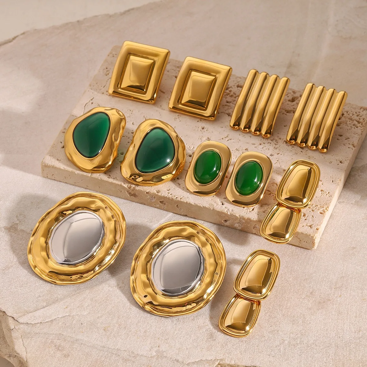 Vintage 18K Gold Plated Large Drop Earrings Stainless Steel Hammered Trendy INS Style Agate Stone Unisex