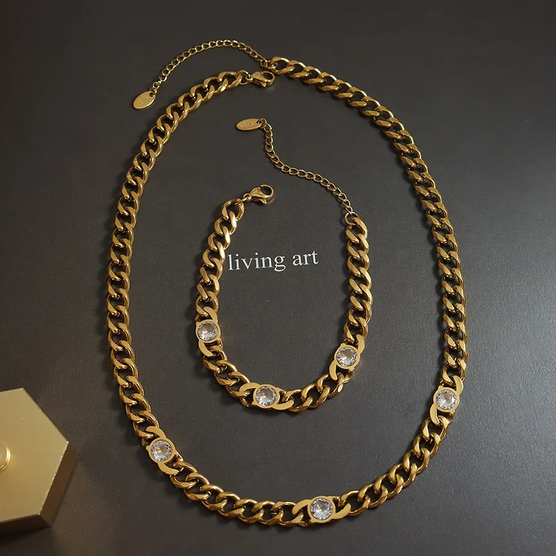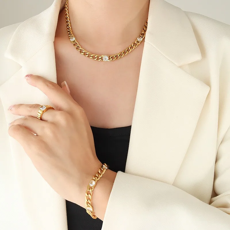 Women's Stainless Steel Cuban Chain Jewelry Set 18K Gold Plated Fashion Simple Design Inlaid Cubic Zirconia for Gift