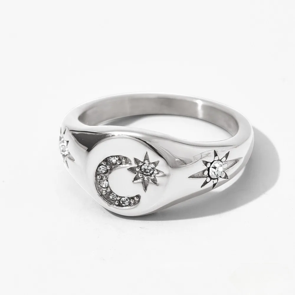 Fashionable Women's Stainless Steel Waterproof Ring 18K Gold Plated with Zircon Inlaid Trendy Star Sun Moon Design Jewelry