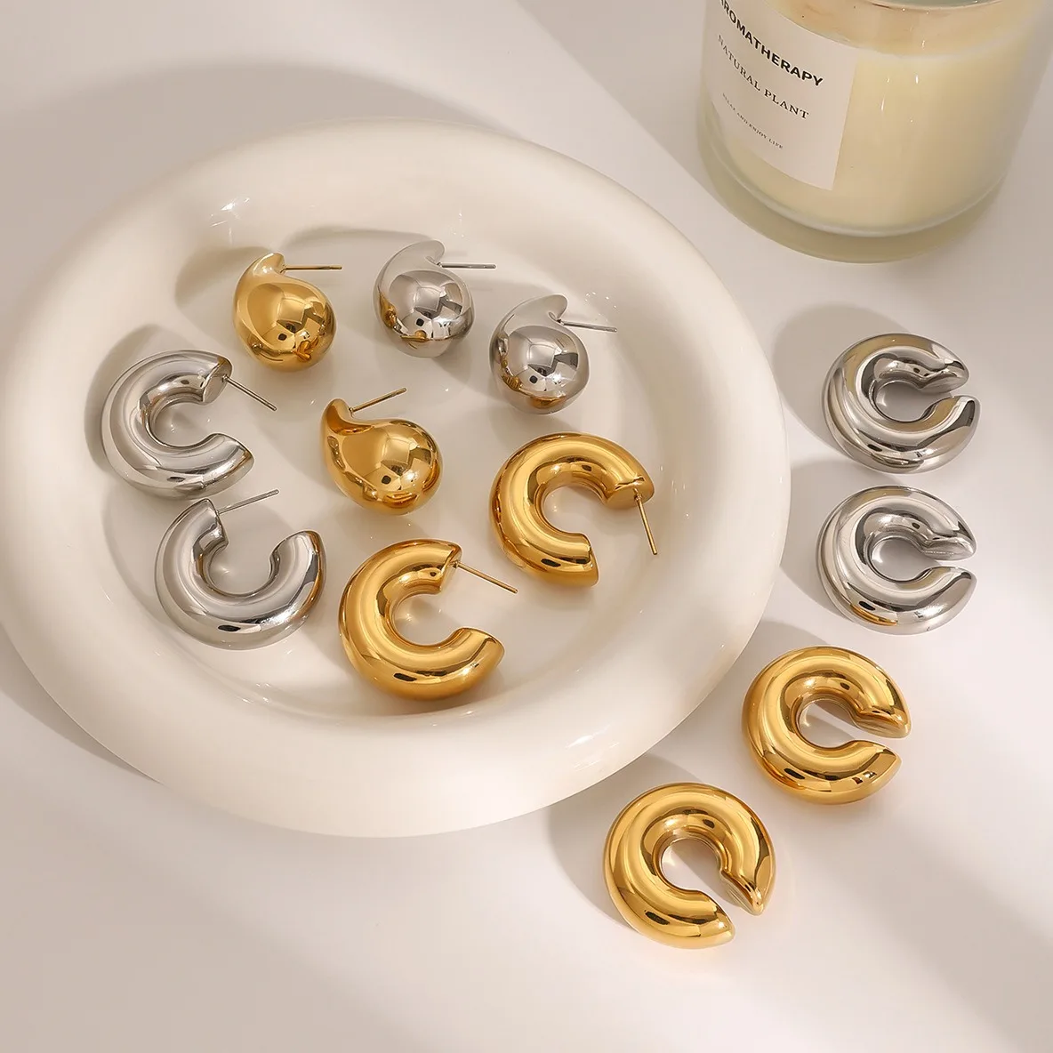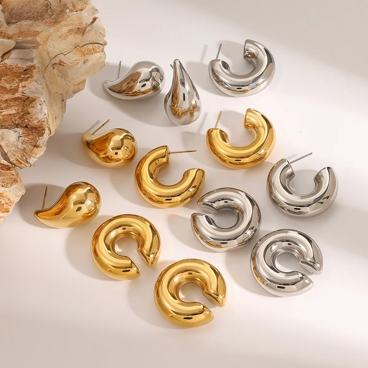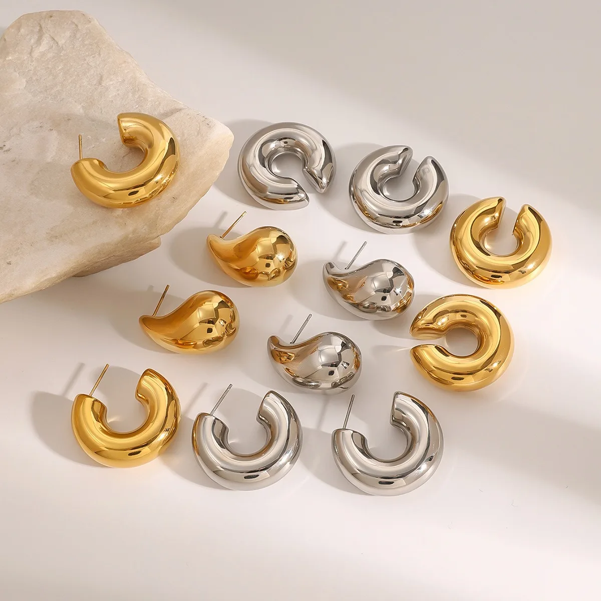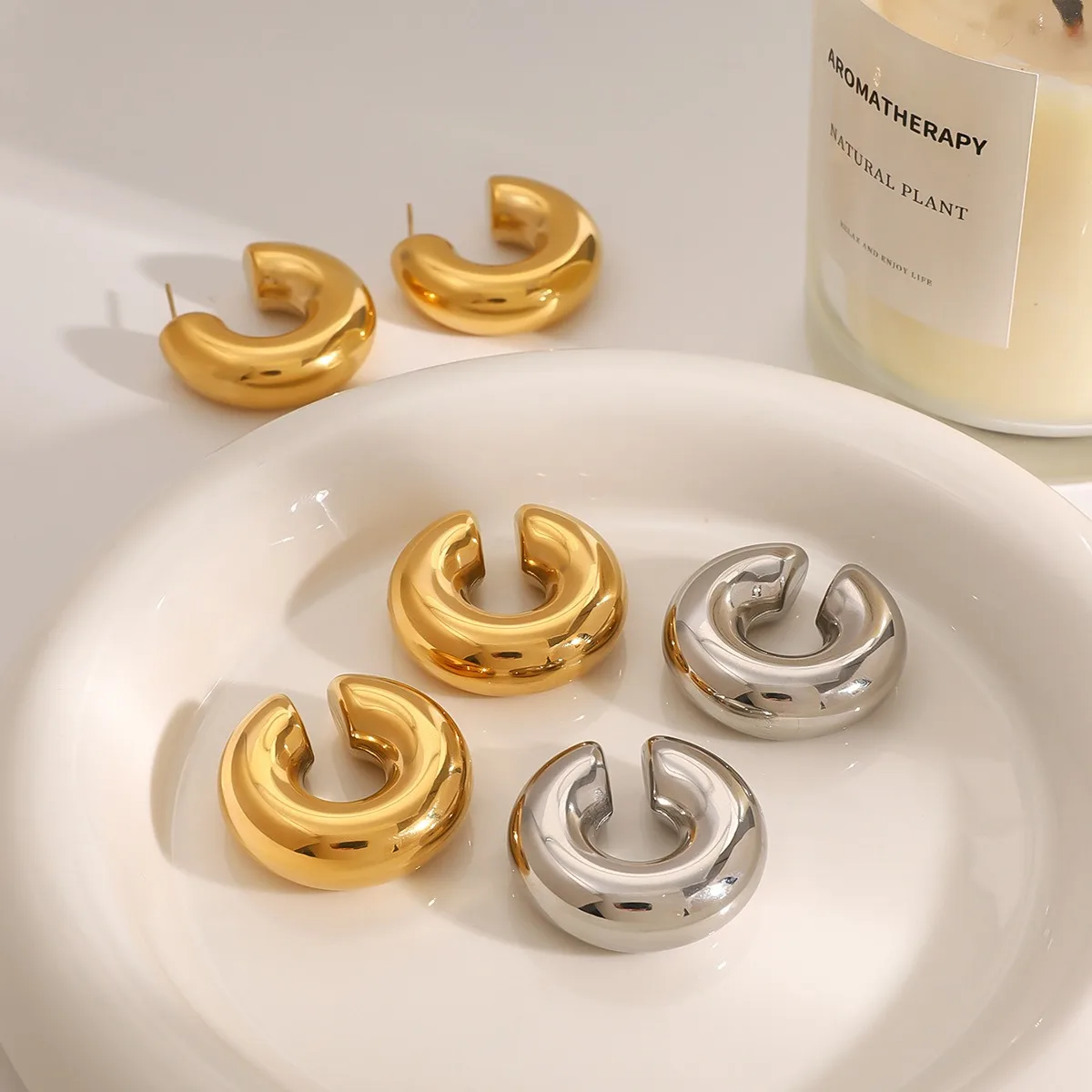 18K Gold Plated Thick Hoop Earrings Simple Design Waterproof C-Shaped Stainless Steel Hollow Ear Clamp Trendy Fashion Style