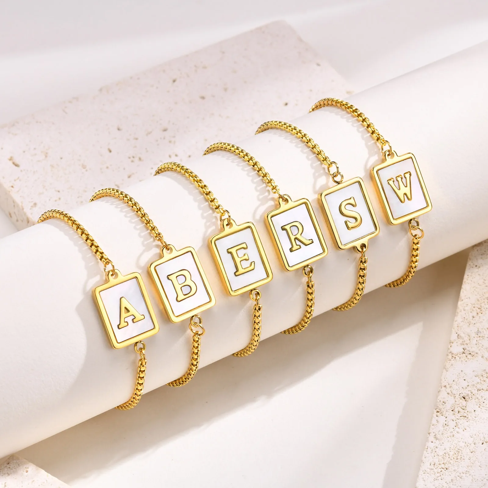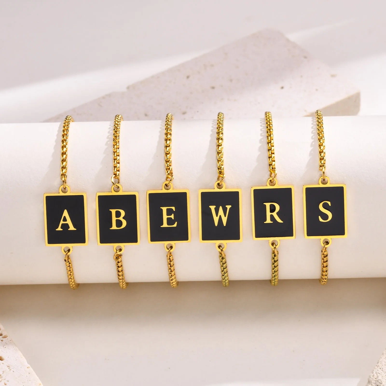 Personalized 26 Letters Gold Plated Bracelet with Adjustable Chain Black Enamel Square Charm Stainless Steel Material
