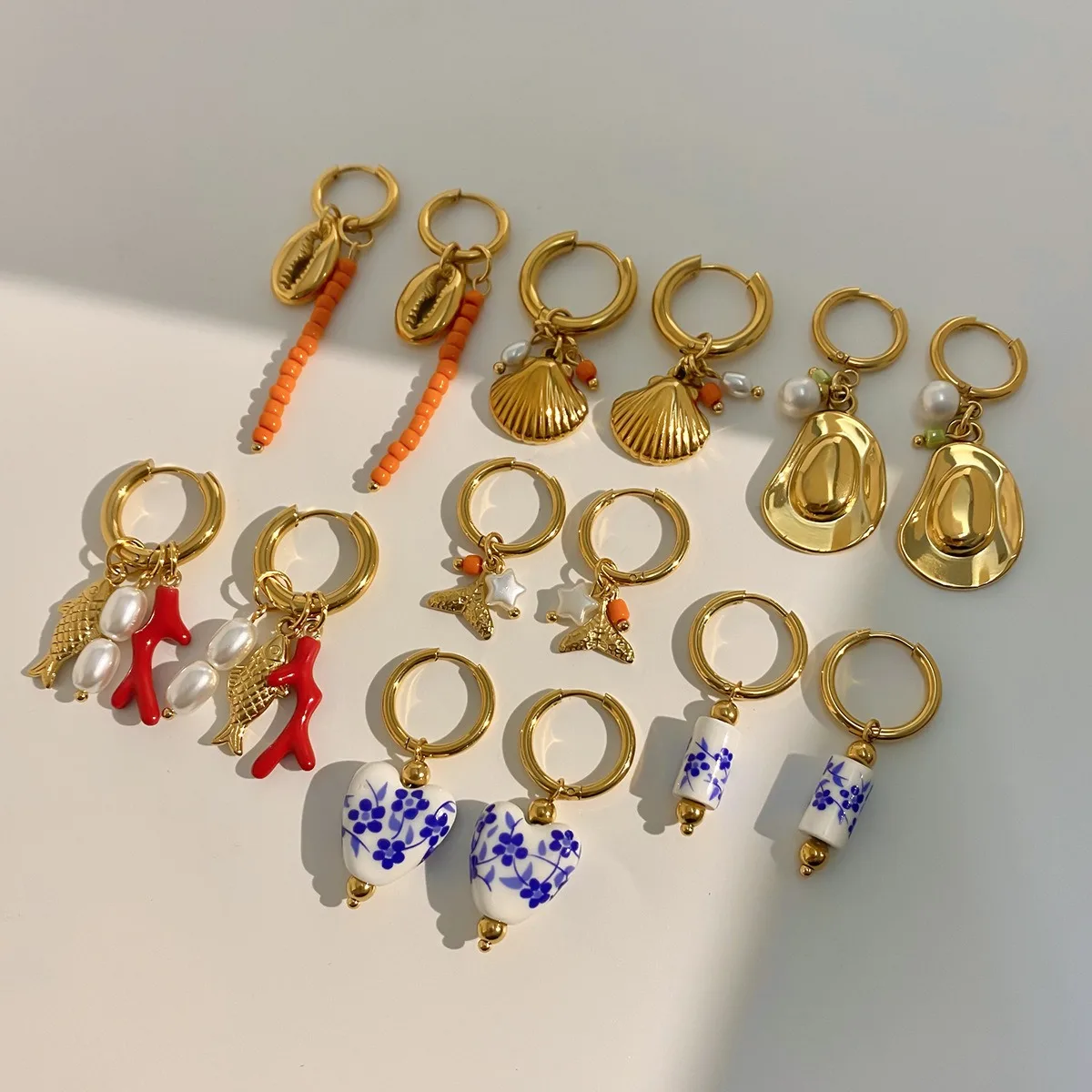 Stylish New 18K PVD Ceramic Pearl Drop Earrings Waterproof Stainless Steel DIY Jewelry with Charm Pendant